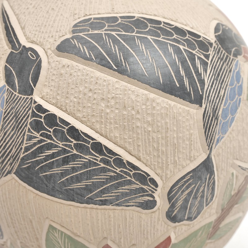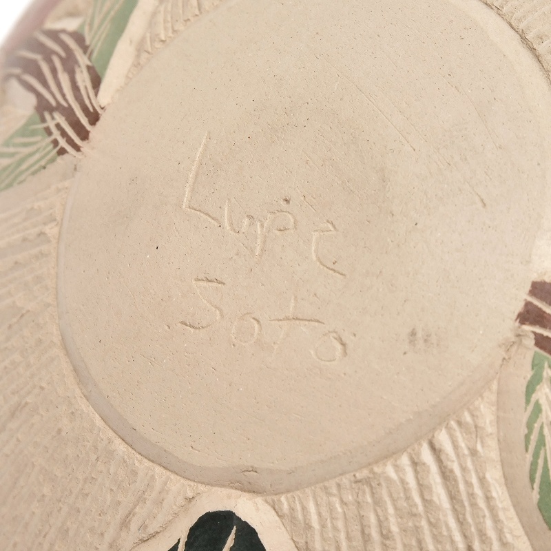 Lupe Sotoによる、ハミングバードをテーマにしたマタ・オルティスの手描きポット。動物や蝶が木の枝のような小道で繋がれた、彼ならではのデザインが特徴です。Lupe Sotoはマタ・オルティスで非常に人気のある陶芸家で、彼の作品はアメリカをはじめとする多くのコレクションに収蔵されています。
