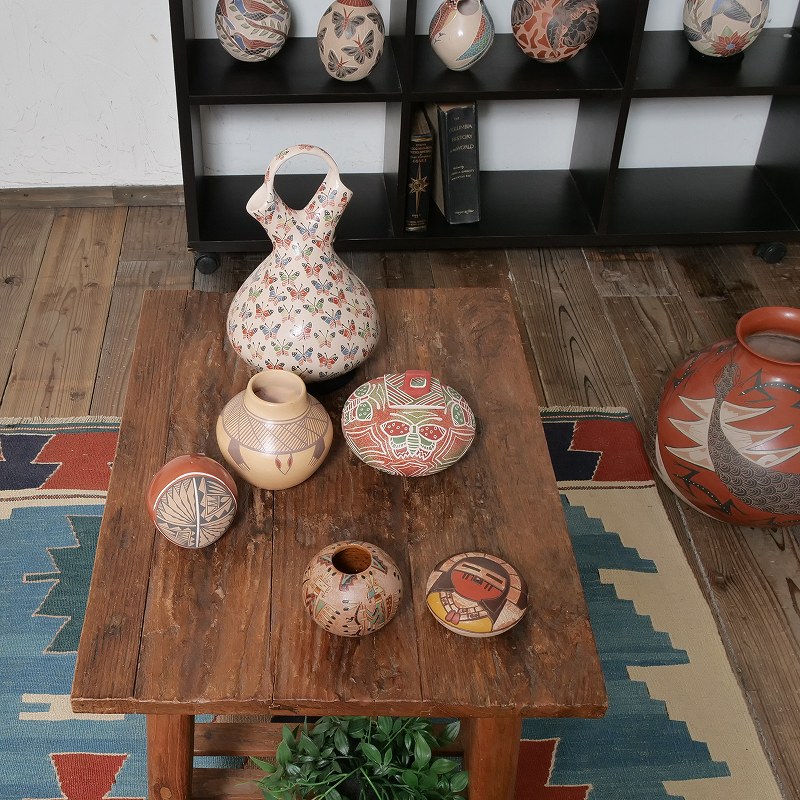 メキシコ北西部チワワ州のフアン・マタ・オルティスという村で作られている陶器。村近郊にある古代遺跡“Paquime”(パキメ)では、古代遺跡時代に高い陶芸技術が確立されていました。その時代に作られていたパキメ様式の陶器を1970年ごろにJuan Quezada Celadoが再現したのが、Mata Ortiz potteryのはじまりです。古代遺跡時代の技法を復元し広めたことで、マタ・オルティスは陶芸の村として知られることとなり、現在では300ほどの世帯でパキメ様式の陶器が作られています。村周辺でとれる良質な土を、電動ろくろを使わず手で成形し、自然染料にて色付けしたあとに窯ではなく、屋外焼成にて焼かれています。パキメの古代遺跡は、アメリカのプエブロ文化との交流があったことを示すものとしても知られており、アメリカンプエブロ族のアコマの陶器文化の源流とされるアナサジ文化の陶器の製法や仕様と共通点が見受けられます。