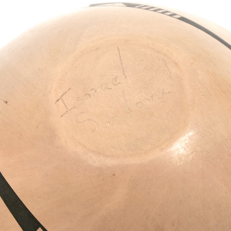 イスマエル・サンドバルというアーティストによって制作された、ネイティブアメリカン・ポタリーの一種であるマタ・オルティス焼きの壺です。壺の表面には、黒と赤の幾何学模様が描かれており、伝統的なマタ・オルティスのデザインが用いられています。マタ・オルティス焼きは、メキシコのチワワ州にあるマタ・オルティス村で生まれた陶芸のスタイルで、地元の土を使って手作りされ、独特の模様と形状が特徴です。イスマエル・サンドバルは、この伝統を受け継ぎながら、自身の創造性を加えて作品を制作しています。