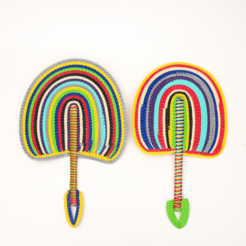 セネガルバスケットでも使用されているプラスチックからできたうちわです。現地の人も夏の暑い日に愛用されています。セネガルらしいカラフルな色合いが魅力で、近年はウォールデコレーションとしても使えるように持ち手の先端に引っ掛け部分がつけられるようになりました。裏表色が違うのもかわいい!プラスチック製なので水洗いも可!小さめなので携帯できるのも便利。