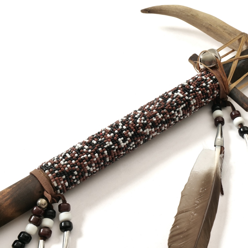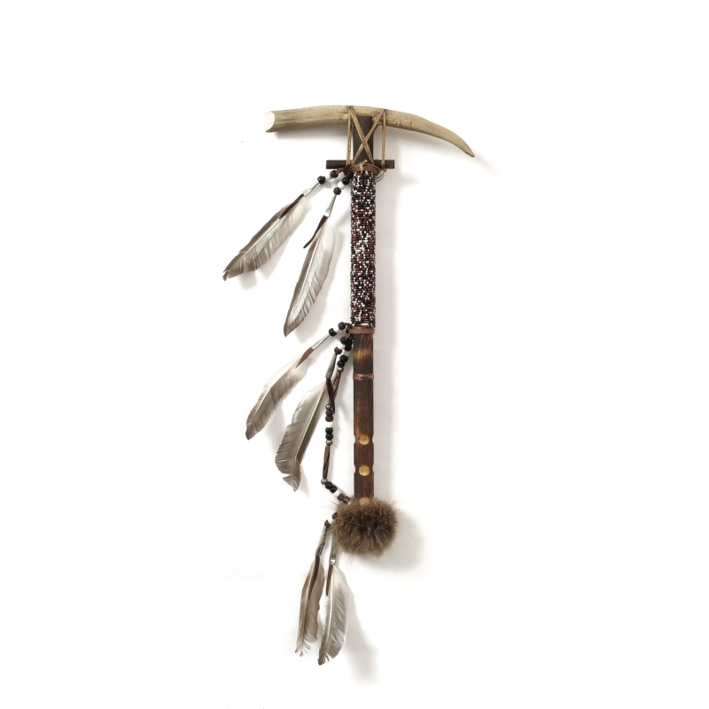トマホークとは、ネイティブアメリカンの武器。こん棒に球形の石塊や金属製の斧を付けたもの。鋭い鹿角とシックな色味のビーズ細工が施されていて、壁に飾るとクールな印象のインテリアに。