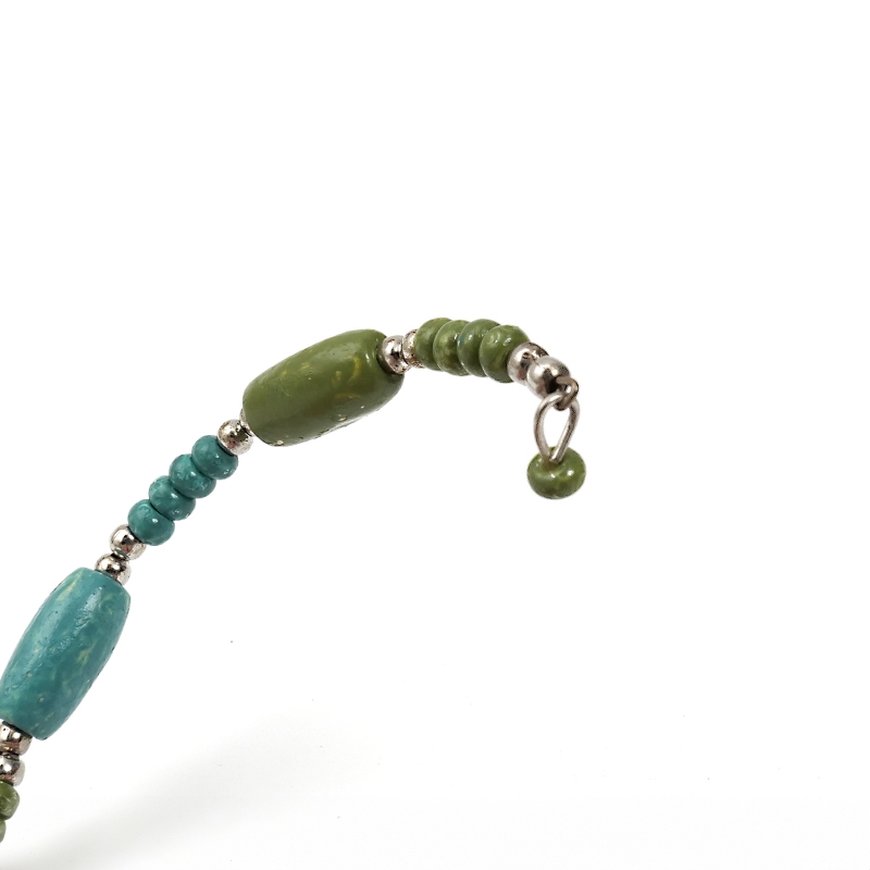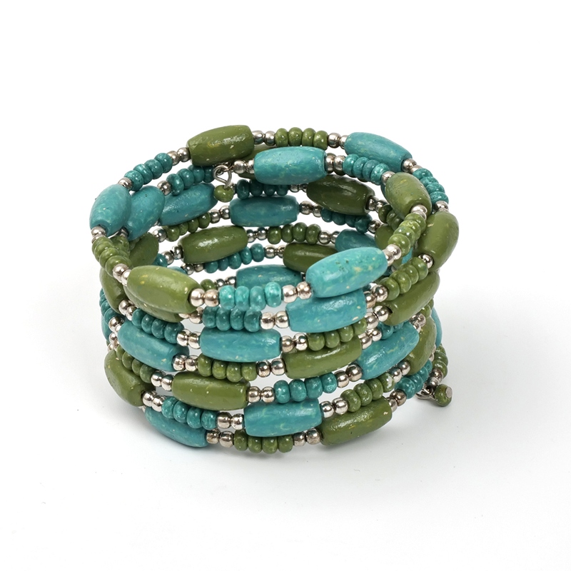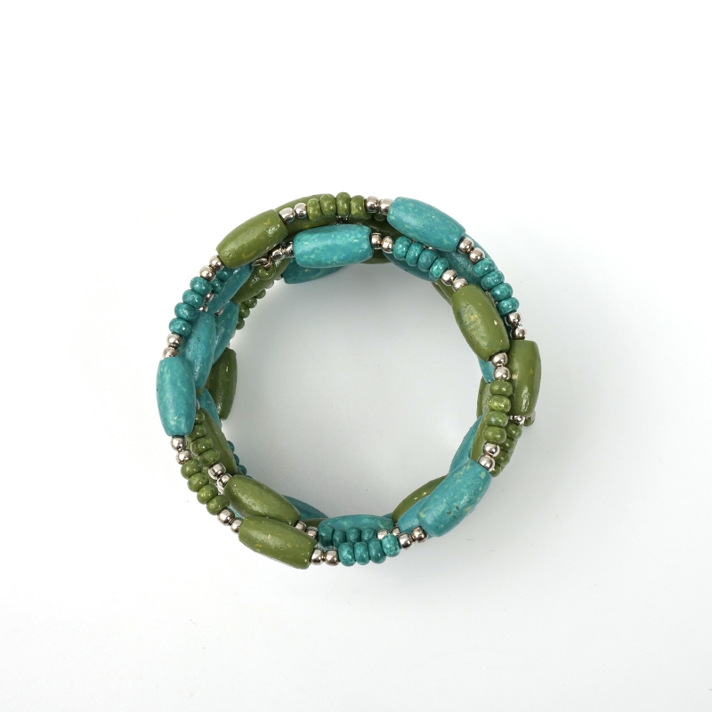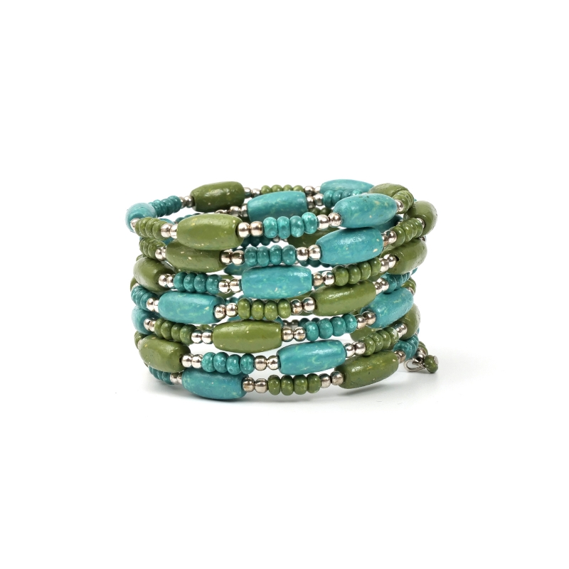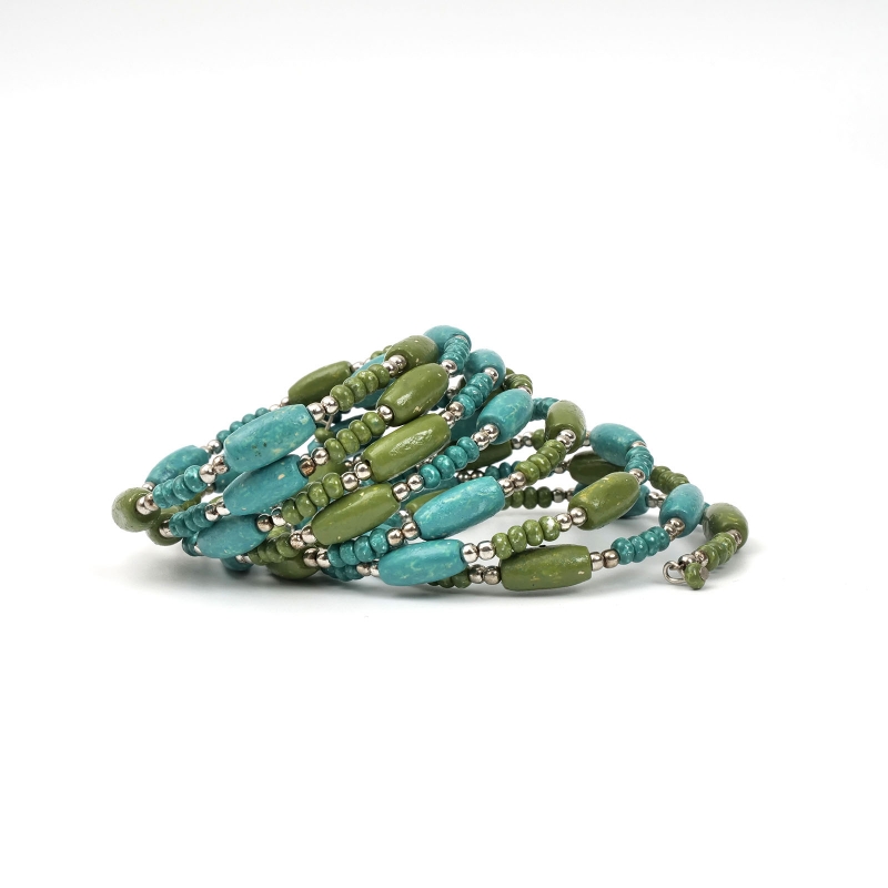 落ち着いたピーコックグリーンのエスニックコーデの王道バングル。これひとつでボヘミアンコーデが完成する、ひとつは持っておきたいアクセサリー。スパイラルワイヤー仕立てでボリューム感に対して軽い着け心地がポイント。