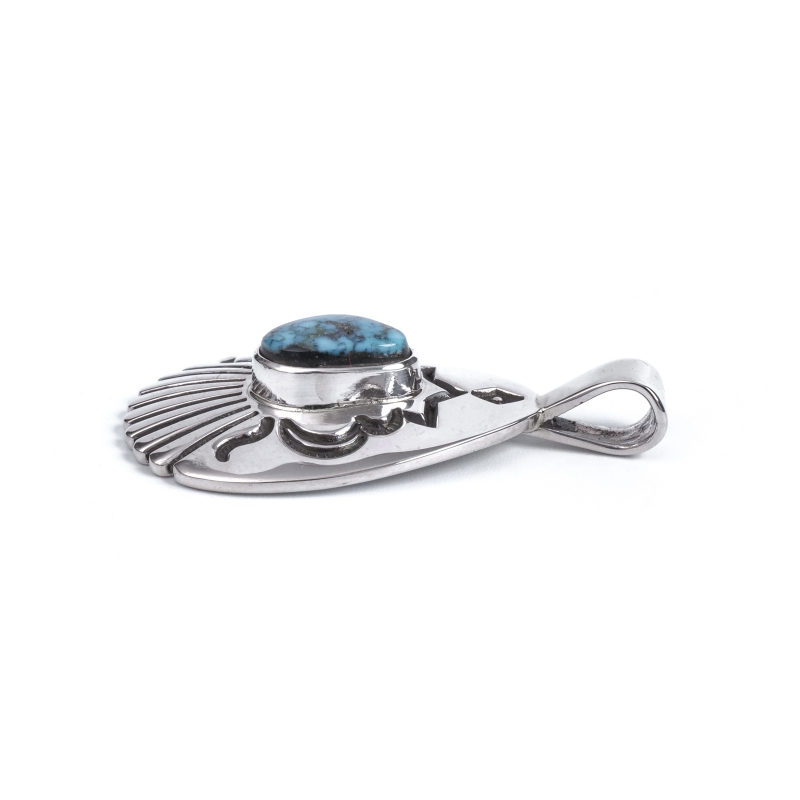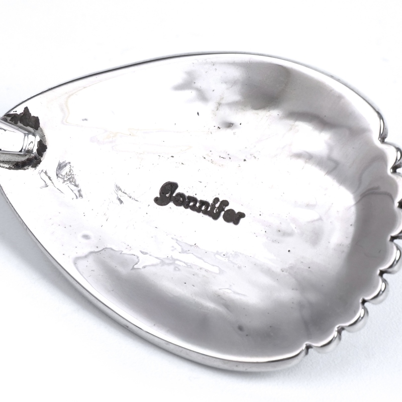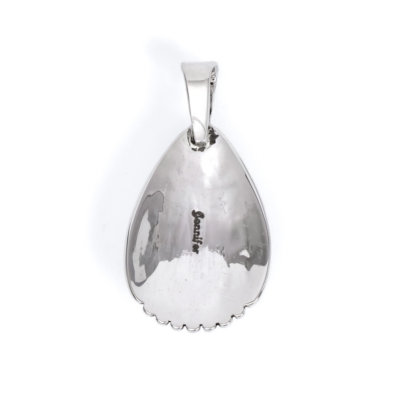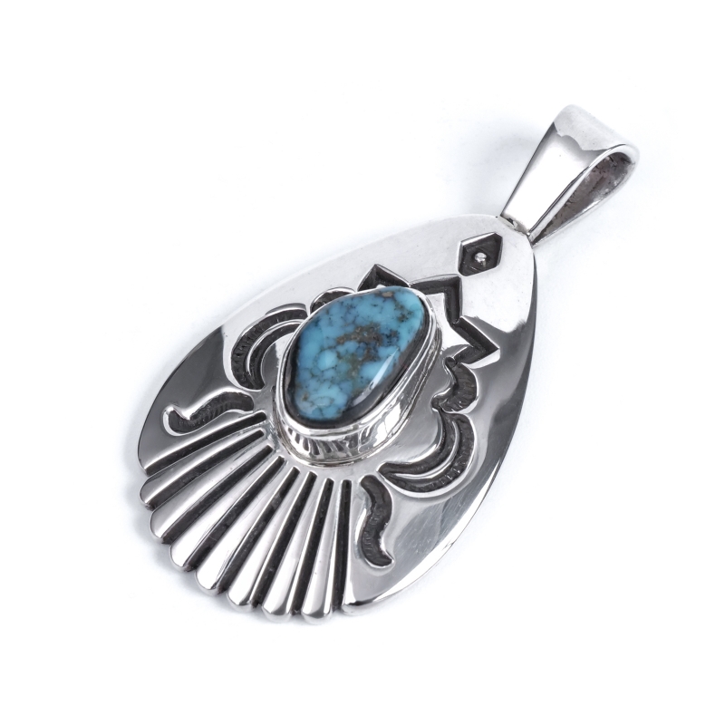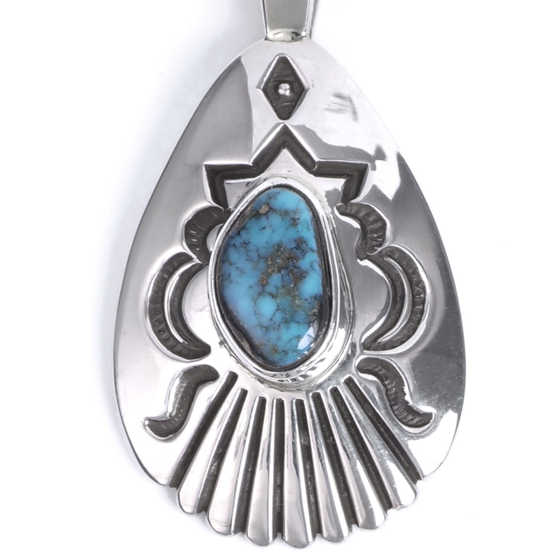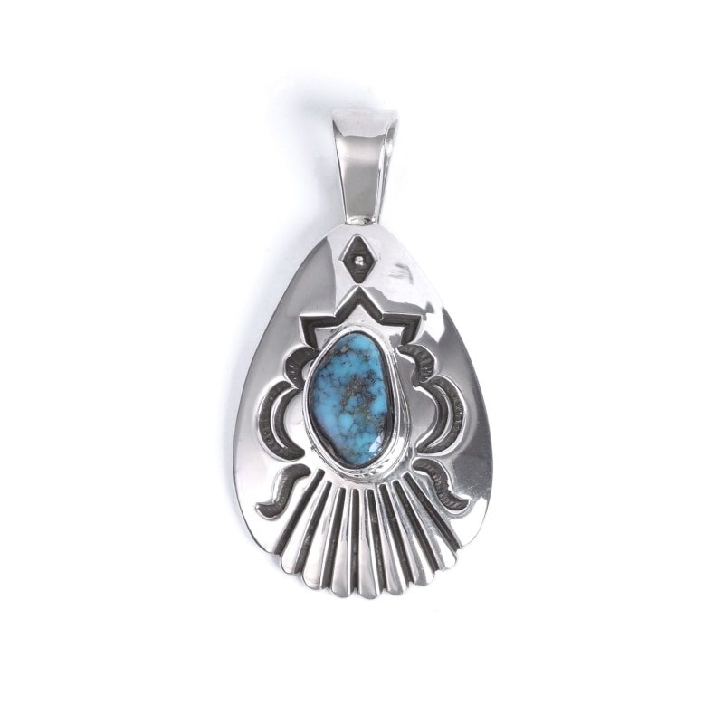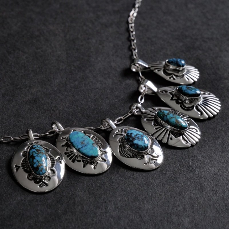 ジェニファーカーティスのターコイズ×スタンプワークペンダントです。中心には澄んだライトブルーにグレーのウェブが入ったハイグレードアパッチブルーターコイズ。ベゼルはシンプルにし、フレームはドロップ型鏡面シルバーにディープスタンプで丁寧に仕立てられています。程よいサイズのプレートペンダントタイプで日常使いしやすく、かつ高級感あり。特別感のあるギフトにも。