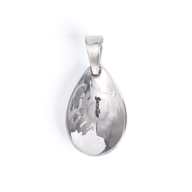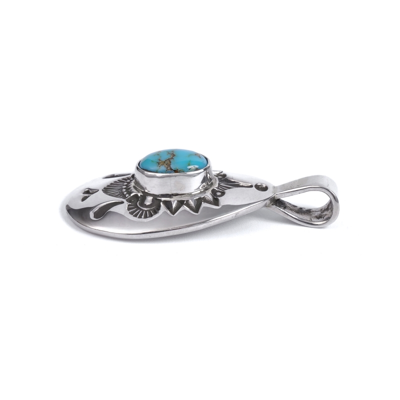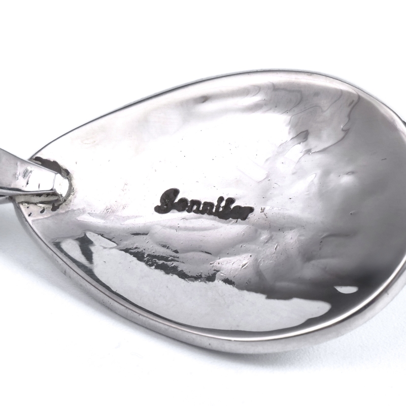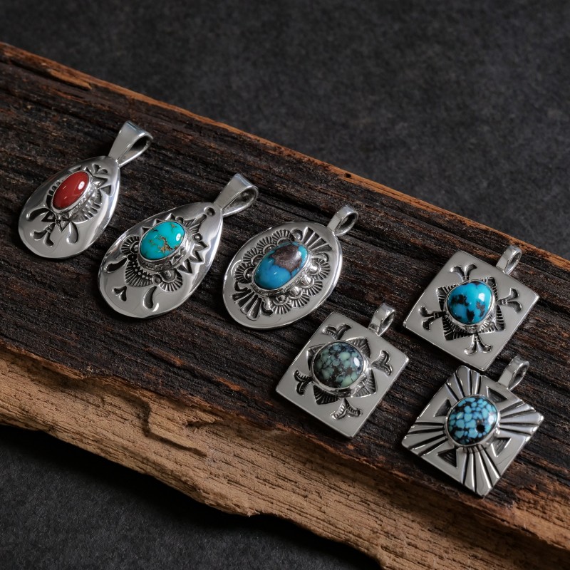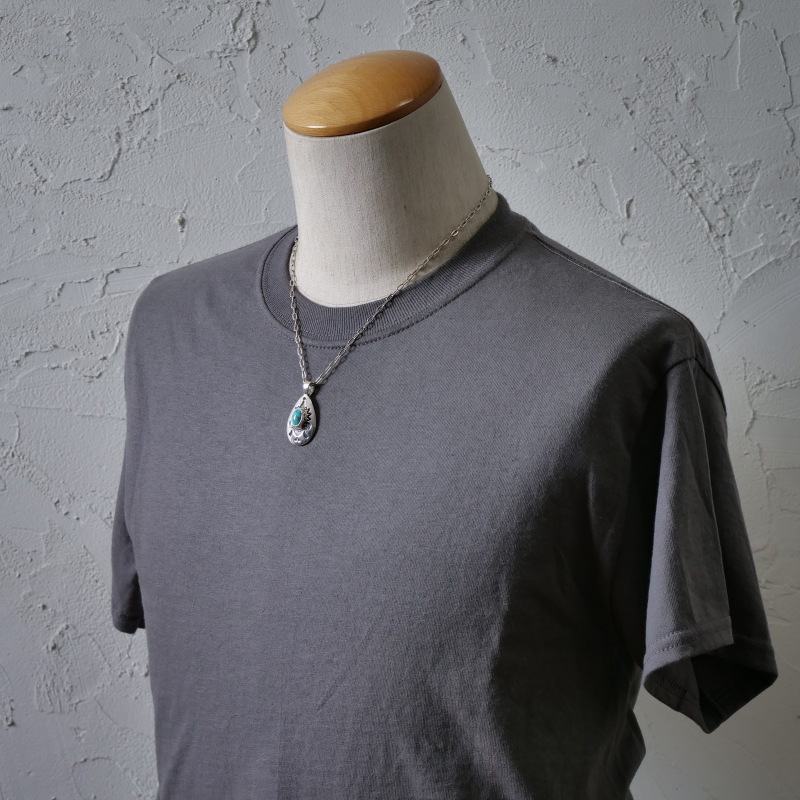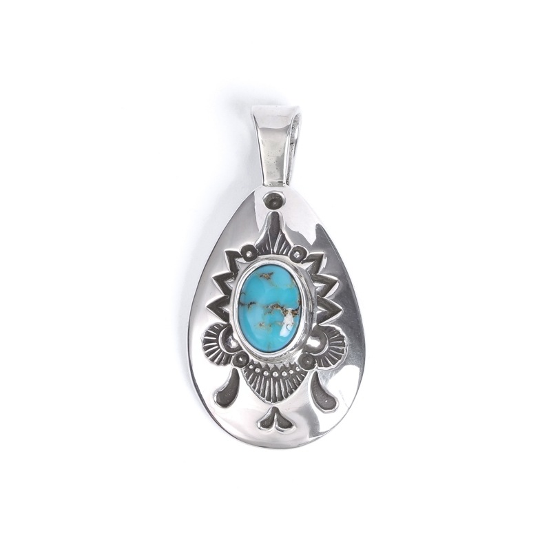 ジェニファーカーティスのターコイズ×スタンプワークペンダントです。中心にはサンゴ礁の海を思わせるハイグレードローンマウンテンターコイズ。ベゼルはシンプルにし、フレームはドロップ型鏡面シルバーにディープスタンプで丁寧に仕立てられています。程よいサイズのプレートペンダントタイプで日常使いしやすく、かつ高級感あり。特別感のあるギフトにも。