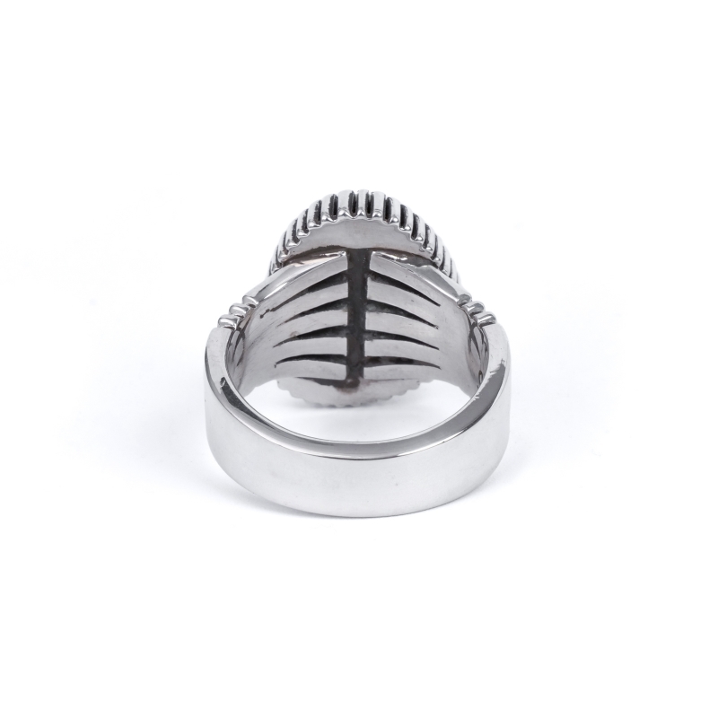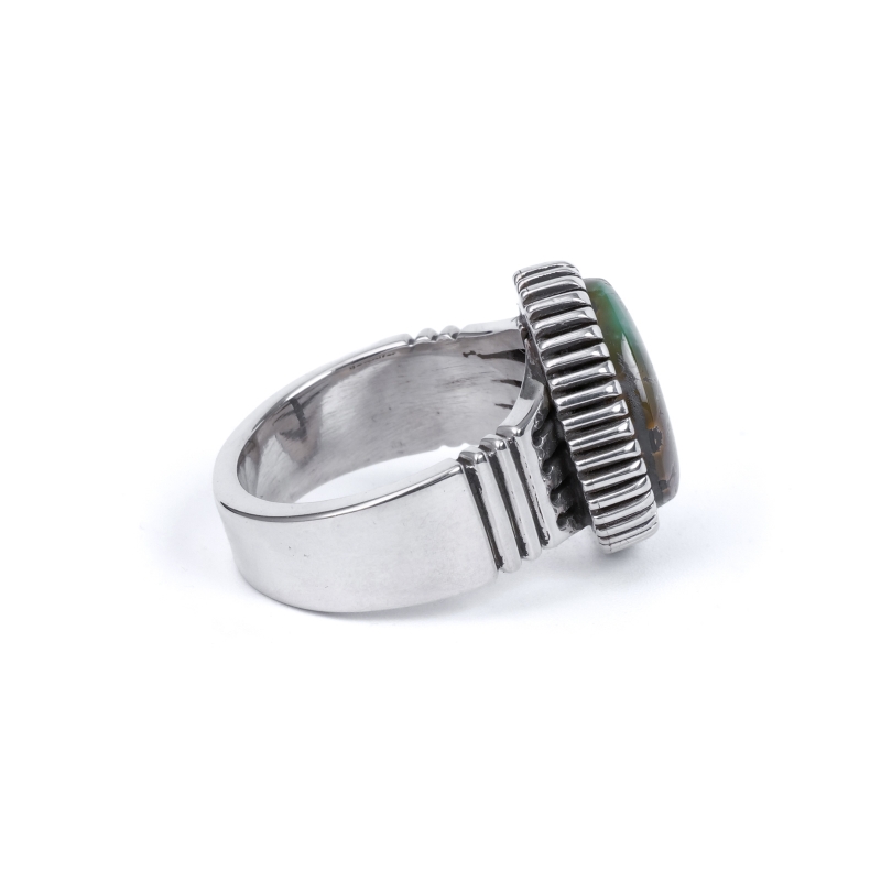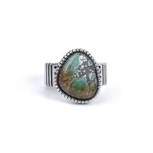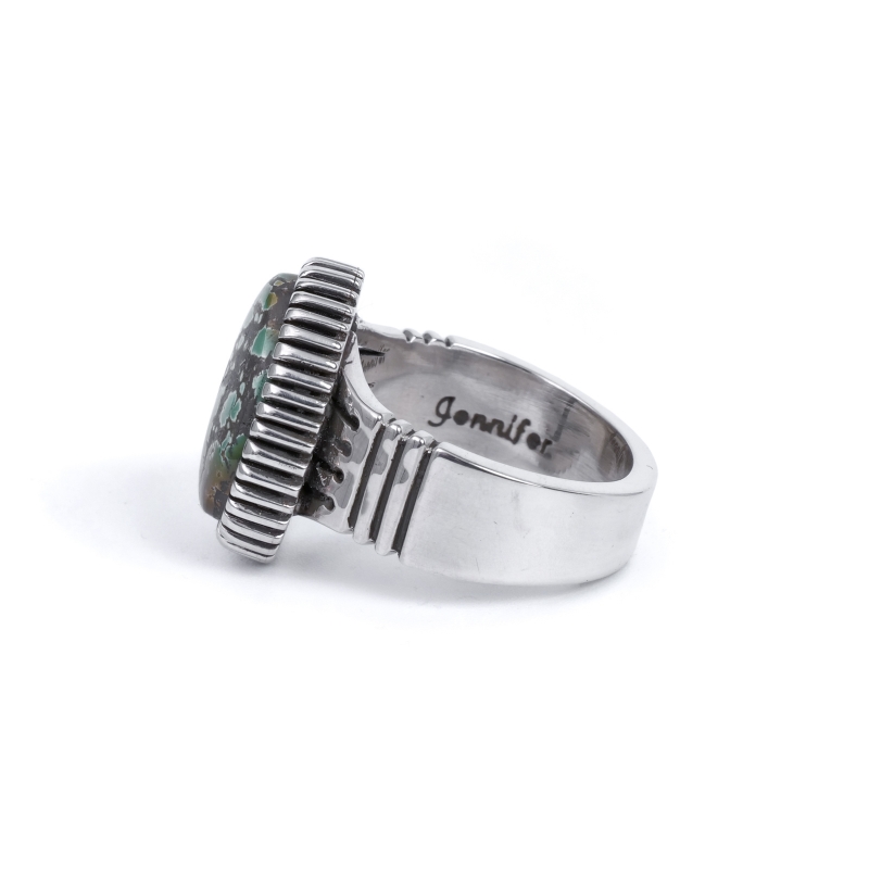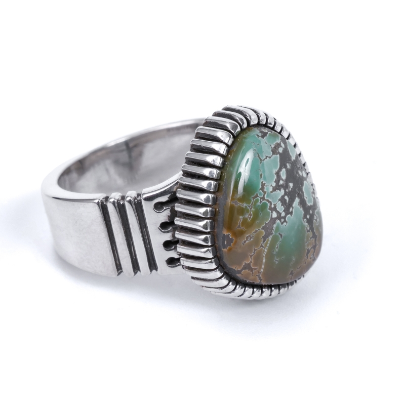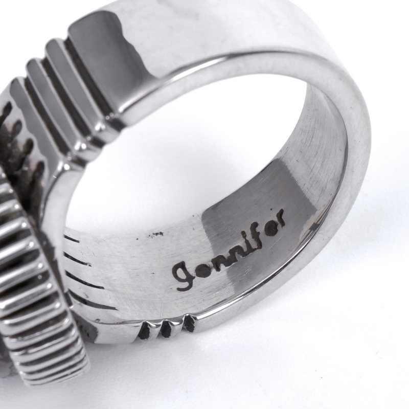 ジェニファーカーティスのスタンプワーク×ハイグレードターコイズリングです。トップには大粒のグリーンキャリコレイクターコイズ。珍しいユニークなグラデーションカラー、グレーのマトリックスも含め地球を鳥瞰するかのような風景の良い石です。石の周りは厚みのあるハンドメイドベゼル、シャンクは肉厚鏡面仕上げで、サウスウエストスタイルのカジュアルなターコイズリングとは一線を画した高級感のある仕上がり。なかなか入荷しないモデルですのでお早めに。