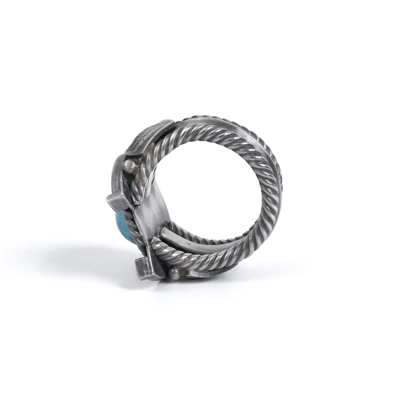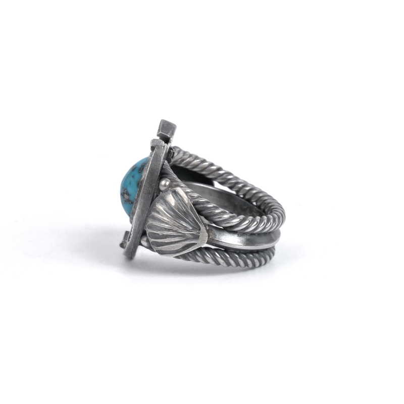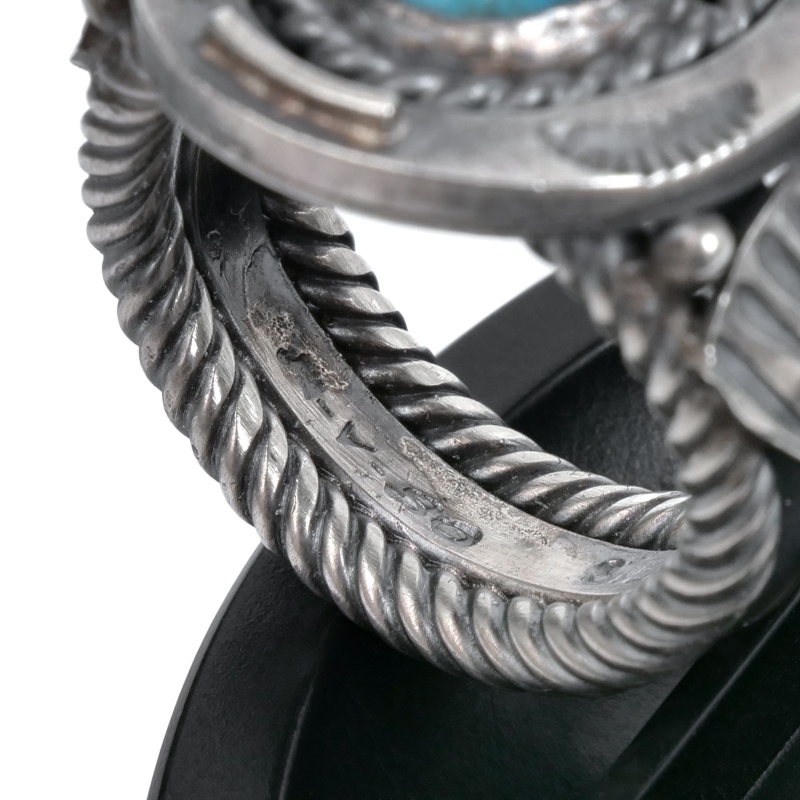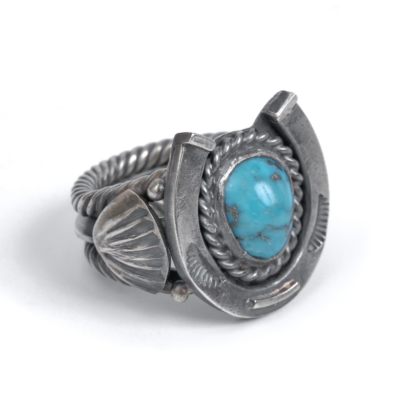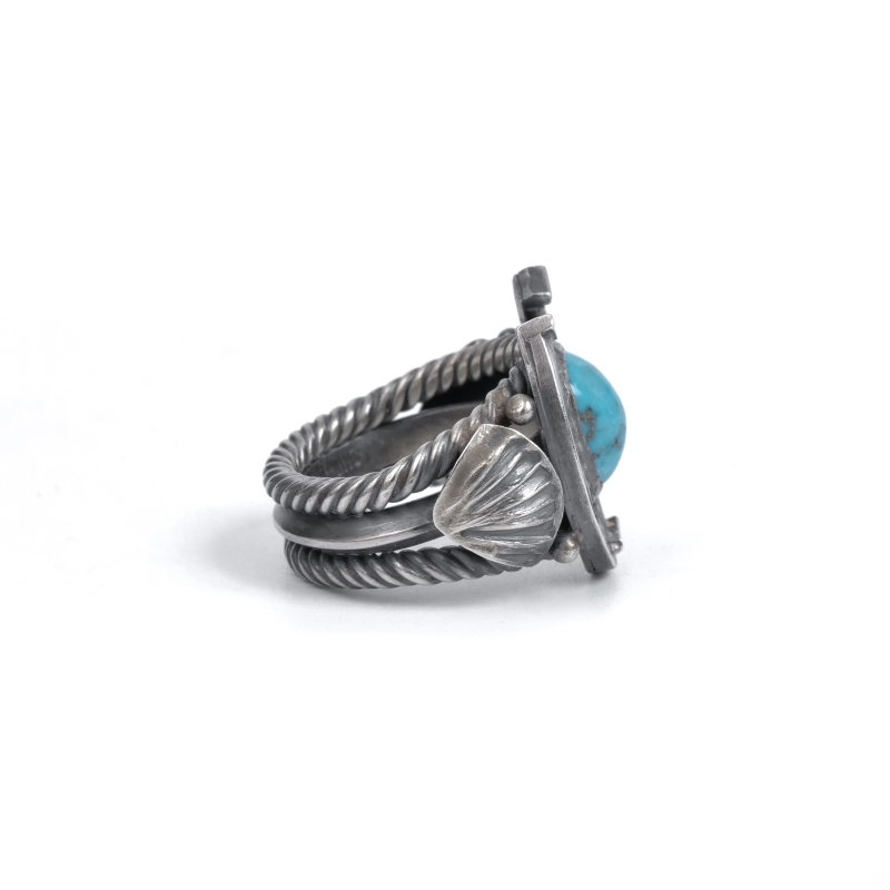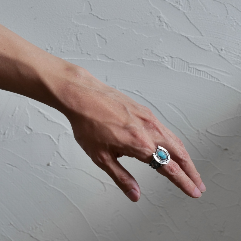 スティーブアルビソのターコイズリングです。トップにはロビンズエッグブルーのビズビーターコイズ、その主役と貼るほど存在感のホースシュー(馬蹄)型フレームが印象的。馬の調教も生業とするスティーブアルビソらしく細部まで再現されたホースシュー、アメリカでは幸運を呼び込むモチーフとされます。重量感のあるケーブルワイヤーで仕立てたシャンク、サイドにはネイティブアメリカンが儀式で使うファンをあしらい、祈りの込められたジュエリーとなっています。