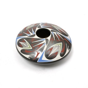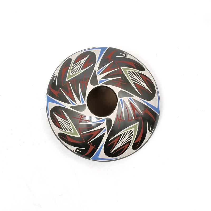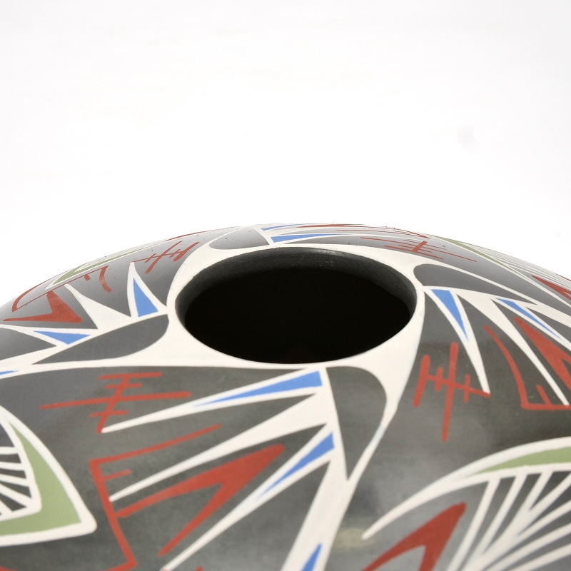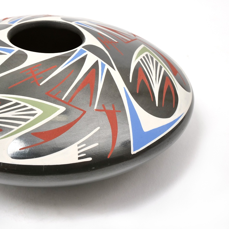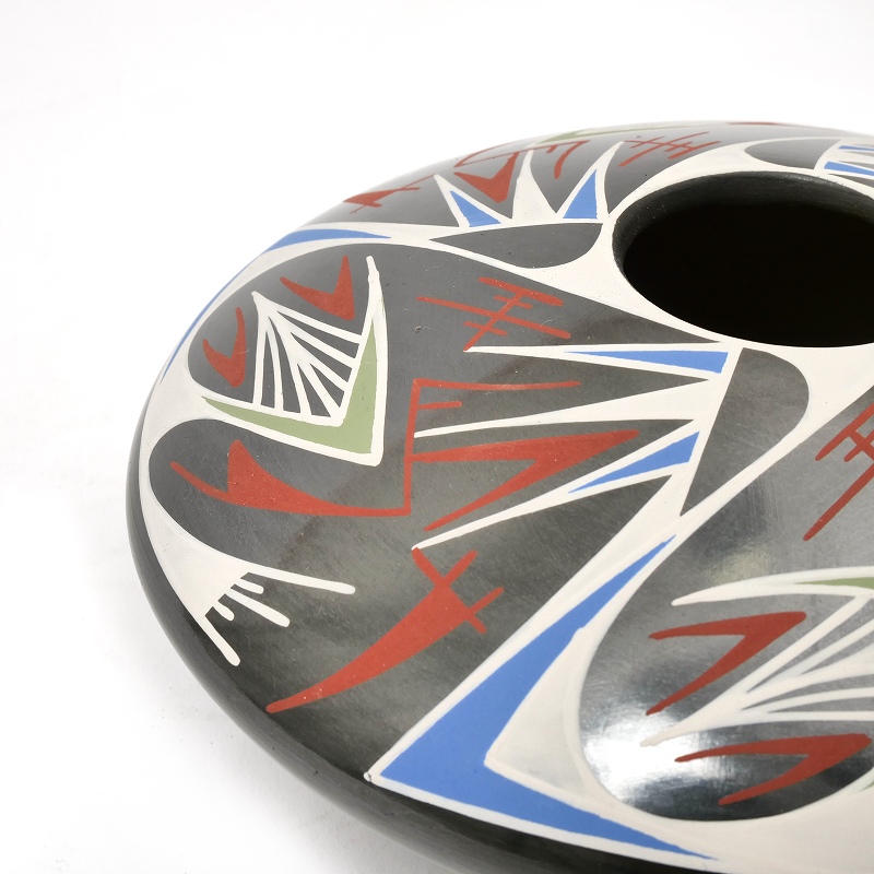 Octavio Gonzalezという陶芸家によって製作されたもの。幾何学的な模様と鮮やかな色彩が特徴的で、ネイティブアメリカンの影響が見られます。シードポットは、種子を保存するために使用された容器で、マタ・オルティス焼きの重要なモチーフの一つです。シードポットは、その独特なデザインと高い芸術性から、美術品としても評価されています。マタ・オルティス焼きは、メキシコの文化遺産として、また現代アートとしても、世界中で注目を集めています。