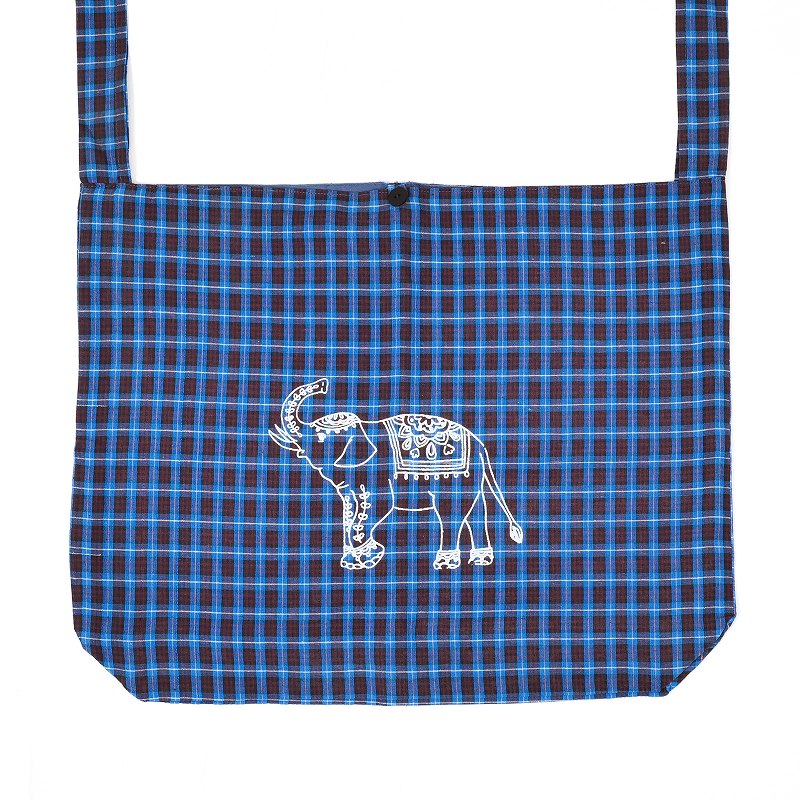 南インドの日常で使われている「ルンギ」という生地で作ったワンショルダーバッグ。マドラスチェック柄のルンギ生地に、インドを連想させるマハトマ・ガンジー、タージ・マハル、インド象のプリントがされています。ショルダーはお好みの位置で結んで、長さを変えられます。裏面はイラストがないので、シンプルなチェック柄のバッグとしても楽しめます。A4ファイルやペットボトルもゆったり入る大きめサイズ、軽くて小さく畳むことができるのでサブバッグにもおすすめ。