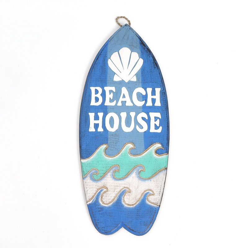 「BEACH HOUSE(ビーチハウス)」と描かれた、サーフボード型の木製ウォールデコレーション