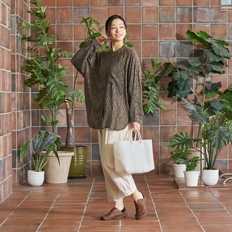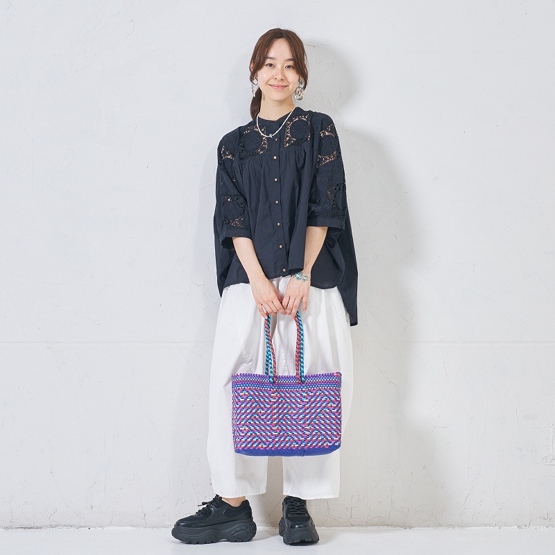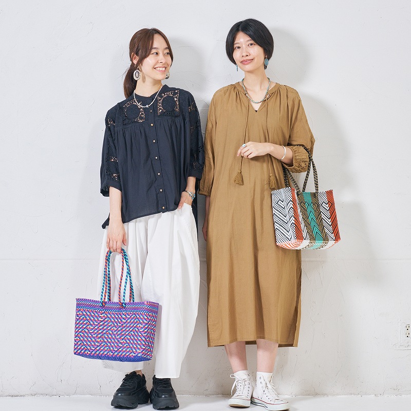 スペイン語で「市場のバッグ」という意味で、メキシコ・オアハカの市場では、このバッグを持った女性たちが多く見られ、買い物カゴとして日常的に使われています。持ち手が本体底まで編み込まれているので、丈夫で汚れても水で洗い流せるなど魅力たっぷりのアイテム。ワイドSサイズは500mlのペットボトルが縦に収まり、中の物が取り出しやすい。持ち手は色柄によってショートタイプと、肩掛けもできるロングタイプの2種類があります。