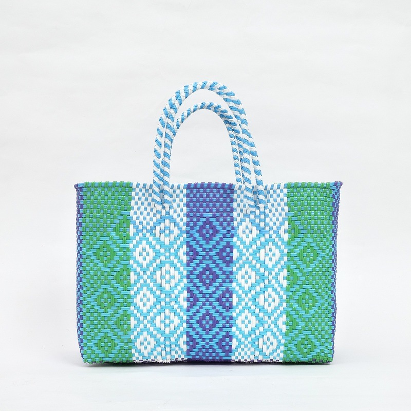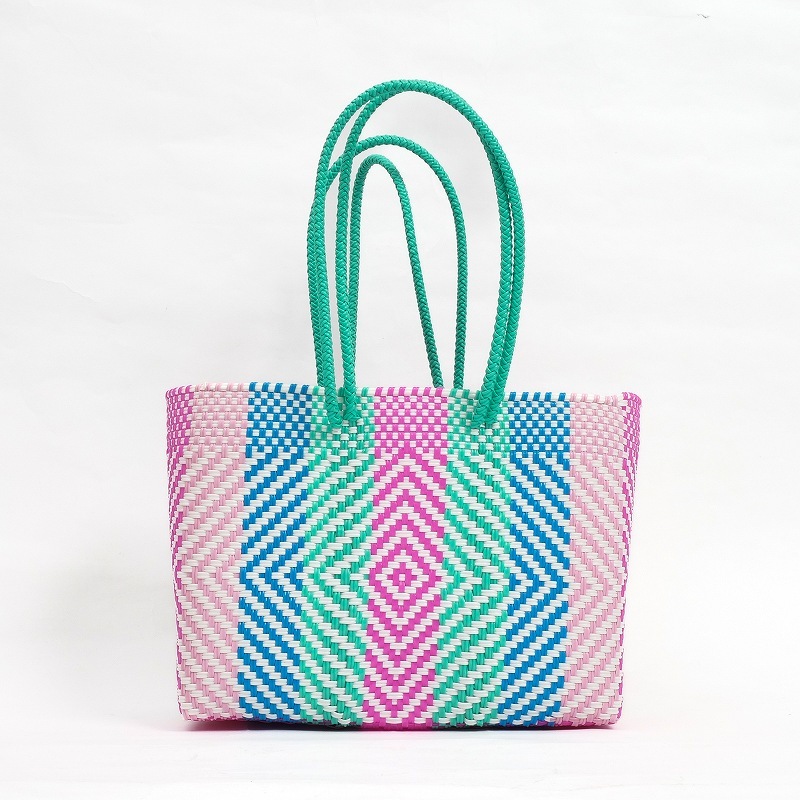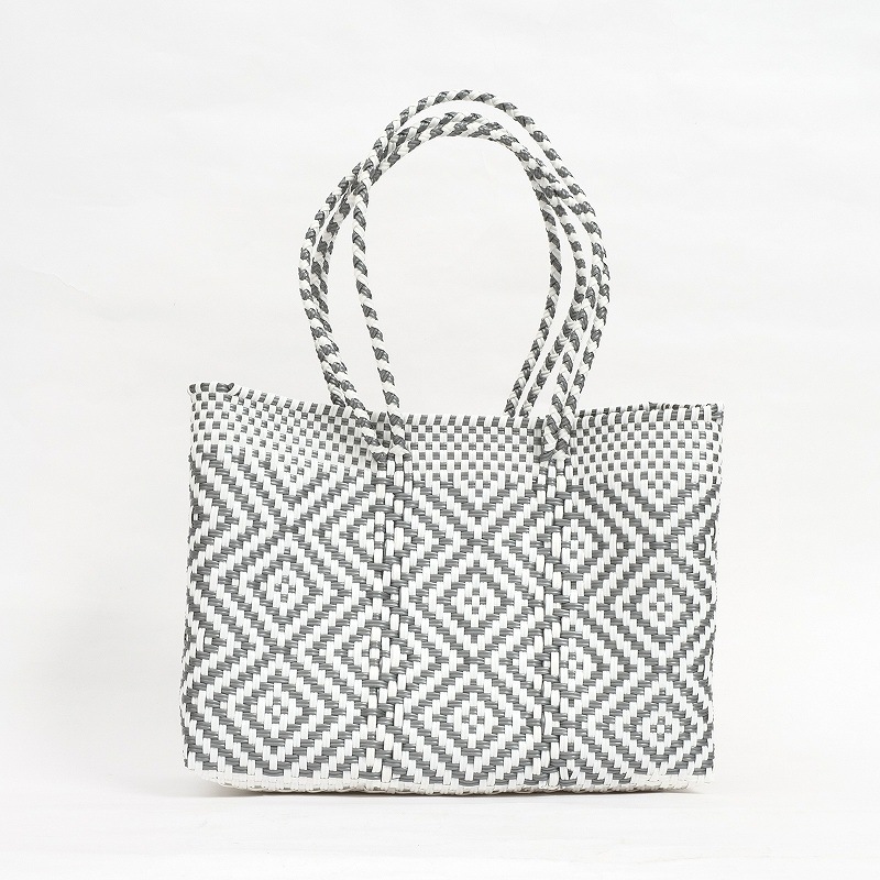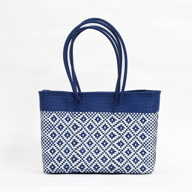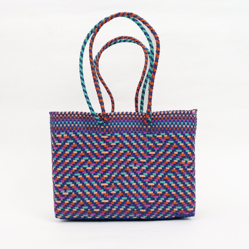 カラフルでポップなデザインがかわいい、メルカドバッグ。使い勝手がよく普段使いからリゾートにも活躍しそう。スペイン語で「市場のバッグ」という意味で、メキシコではマルシェバッグとしてよく使われています。このバッグは、プラスチックのキャップや梱包資材等を加工してプラスチックコードを作り、それを丈夫に編み込んで作られたリサイクルバッグで、実はとってもサステナブル。 水で洗い流せるからアウトドアにも使え、バッグとして使わなくなっても、室内用のバスケットとして、インテリアとして長くご愛用いただけます。材料はプラスチックなので現代的になりましたが、古代メキシコの時代から伝統的に作られてきた編みかごの手しごとを受け継いだ、高いクオリティーの手編みかご。模様も菱形を中心に、無地やストライプなど様々で、複数持ちたくなります。