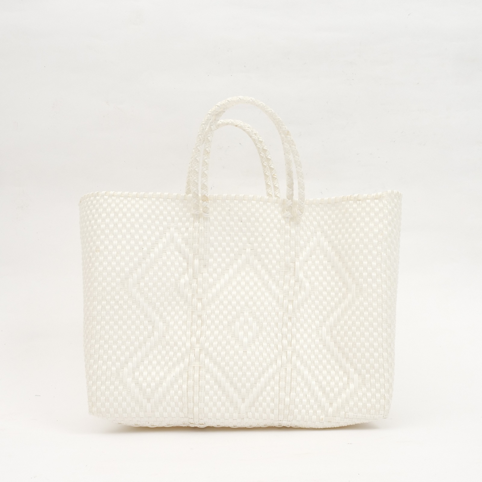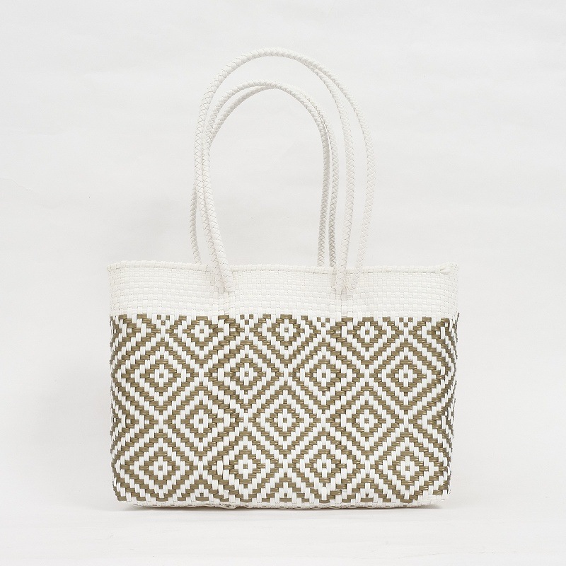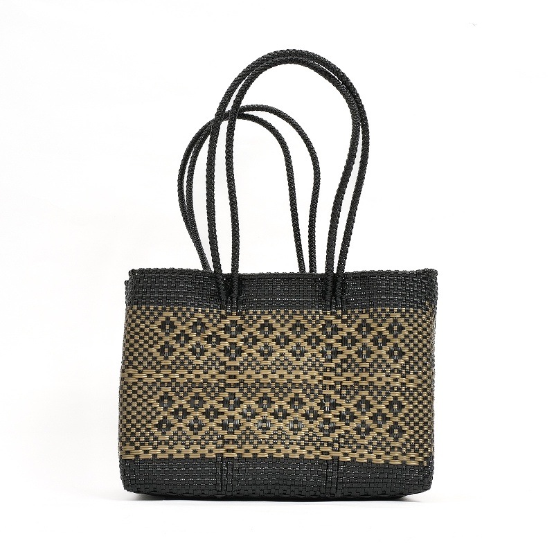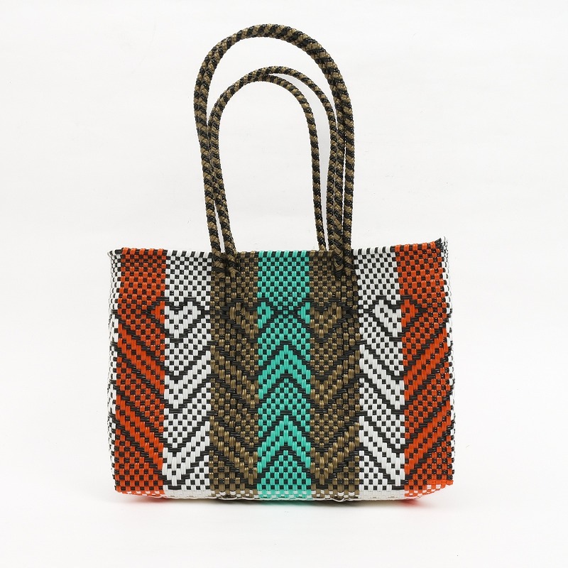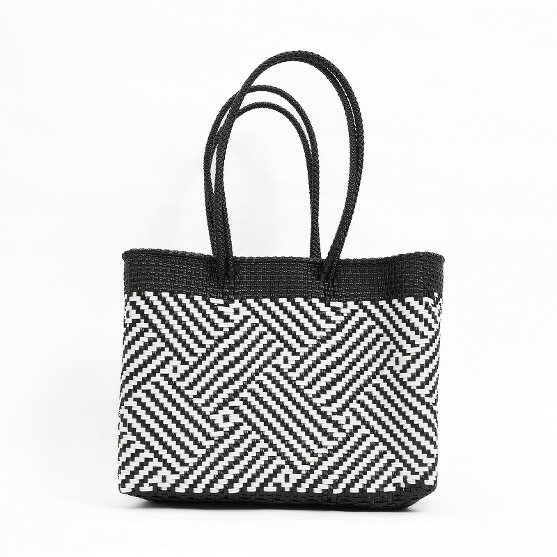 カラフルでポップなデザインがかわいい、メルカドバッグ。使い勝手がよく普段使いからリゾートにも活躍しそう。スペイン語で「市場のバッグ」という意味で、メキシコではマルシェバッグとしてよく使われています。このバッグは、プラスチックのキャップや梱包資材等を加工してプラスチックコードを作り、それを丈夫に編み込んで作られたリサイクルバッグで、実はとってもサステナブル。 水で洗い流せるからアウトドアにも使え、バッグとして使わなくなっても、室内用のバスケットとして、インテリアとして長くご愛用いただけます。材料はプラスチックなので現代的になりましたが、古代メキシコの時代から伝統的に作られてきた編みかごの手しごとを受け継いだ、高いクオリティーの手編みかご。模様も菱形を中心に、無地やストライプなど様々で、複数持ちたくなります。