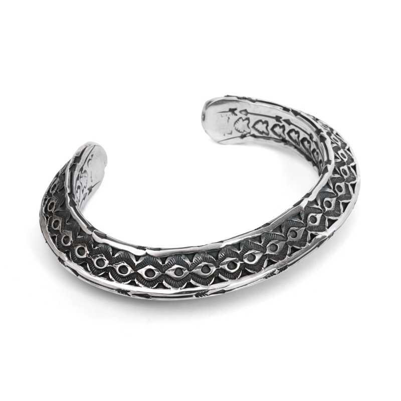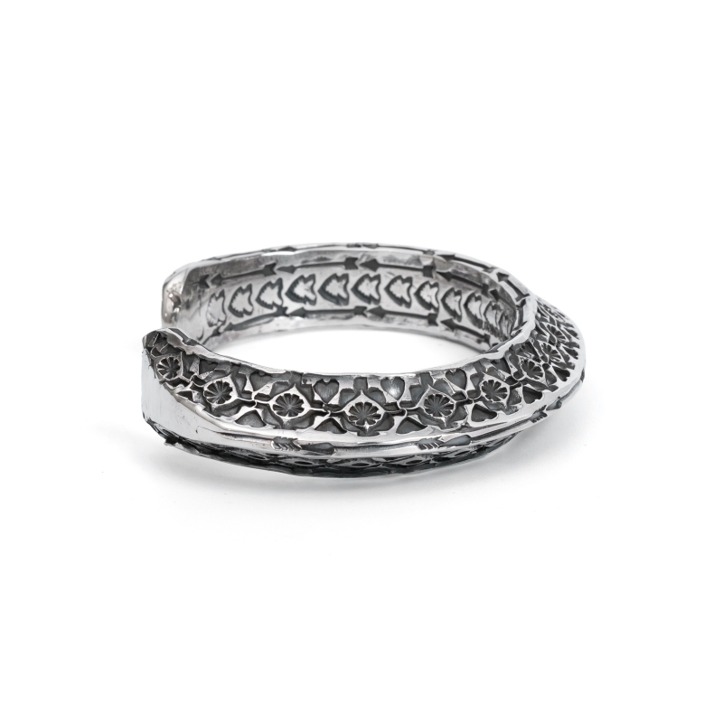 サンシャインリーブスのスタンプワークバングルです。最も太いゲージのスーパーヘヴィートライアングルワイヤーを使用した迫力の1点。角を削ってできた6面全て、サンシャインリーブスならではの緻密なスタンプワークが。特にエッジの細いラインにぶれずに打ち込まれたアロースタンプに技量の高さを感じます。裏面のスタンプは身に着ける人だけが見ることができる特権、鍛え上げた腕に映える超重量級の逸品。
