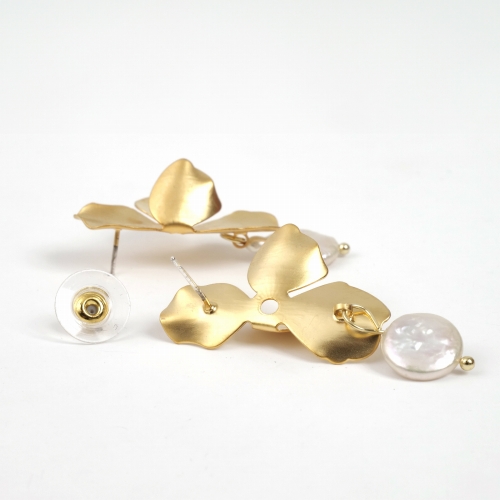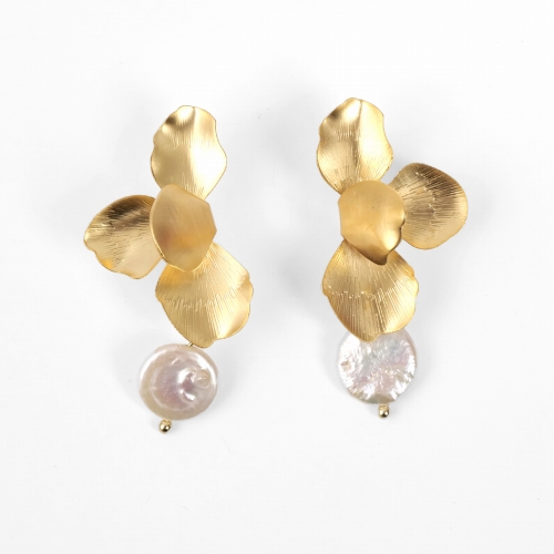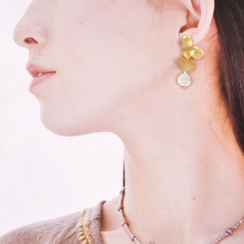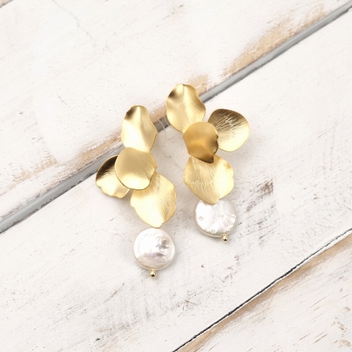 柔らかな花びらがモチーフのゴールドパーツとバロックパールの煌めくボタニカルアクセ。フェミニンな雰囲気のデザインで、長時間着けていられる軽い着け心地。細かなラインがはいったメタルとなだらかな凹凸のパールそれぞれの輝きの違いが楽しめる。