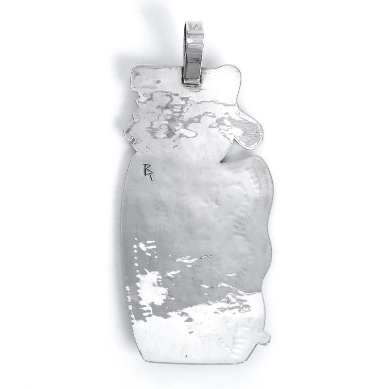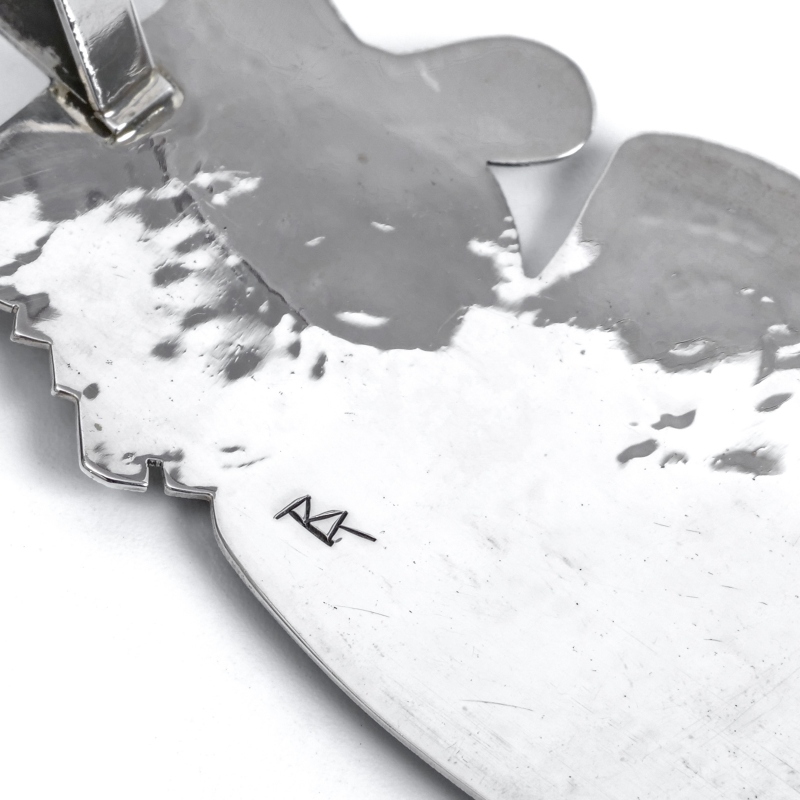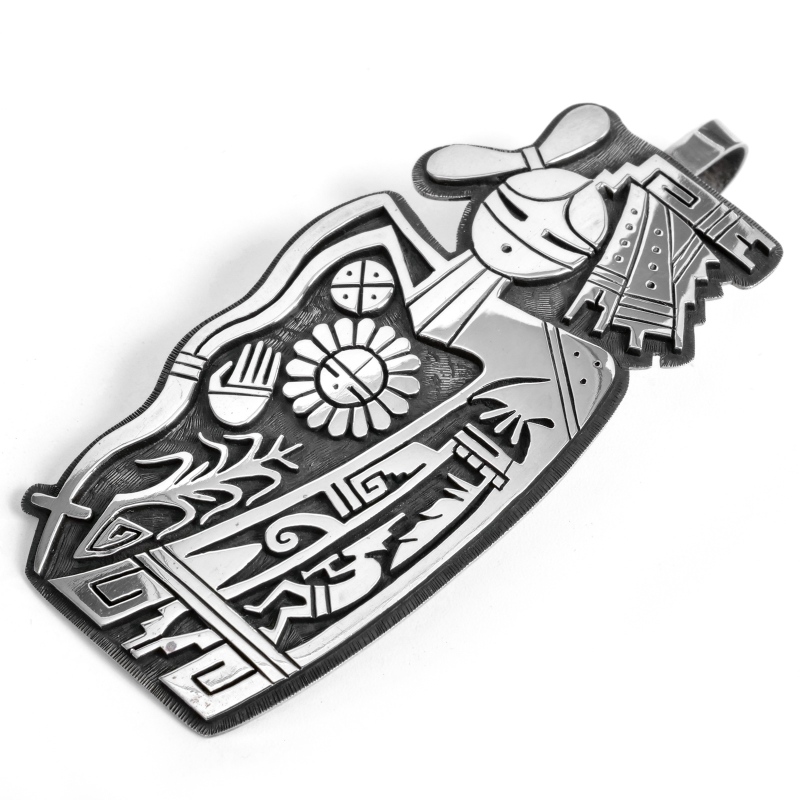 ベラタワホングバのオーバーレイペンダント、マライカのショップコレクションからのピックアップ品です。ベラの得意とする最細糸のこ”No.0”の繊細な線で切り出されているのは、ホピメイデン。伝統的なホピのヘアスタイルに特徴的な飾りをつけ、体にはサンフェイス・マンハンド・コーン・ロングヘアカチナ・フルートプレイヤーなどのホピ村をめぐる森羅万象が細かに切り出されています。オーバーレイ作品としてはかなり大きめ、迫力あるアートピースとして身につけて。