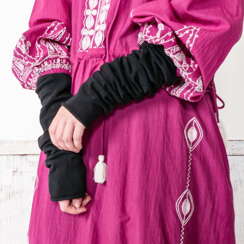 レッグウォーマーとアームウォーマーのどちらにも使えるアイテム。肘上・膝丈くらいのロングサイズですが、ほつれにくいので好きな長さにハサミで切ってそのまま使用することが可能。半分にカットすれば短めのハンドウォーマーやアンクルカバー、3~5センチでカットしてヘアゴムやシュシュのようにアレンジ可。使いやすいシンプルな無地タイプ。伸縮性のあるニット地でリラックス感もあり、寒い時期の防寒対策はもちろん、春夏の冷房対策や日よけにもおすすめ。