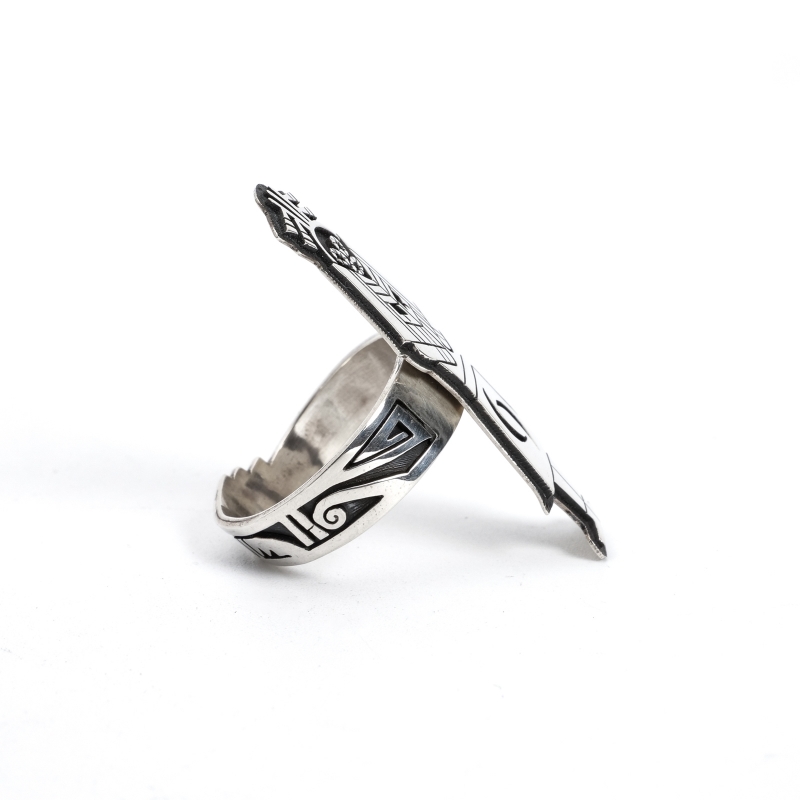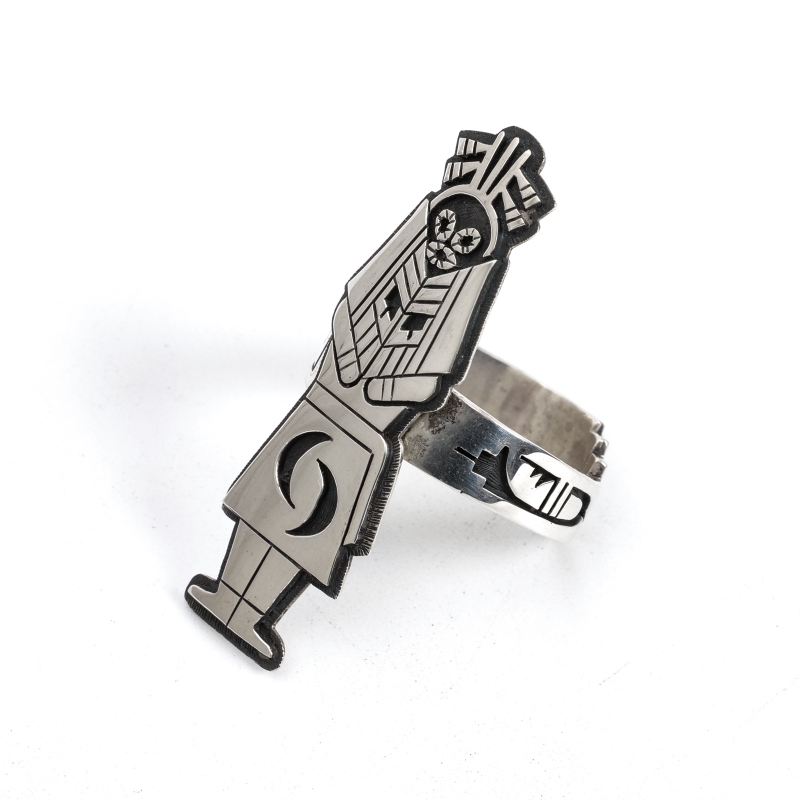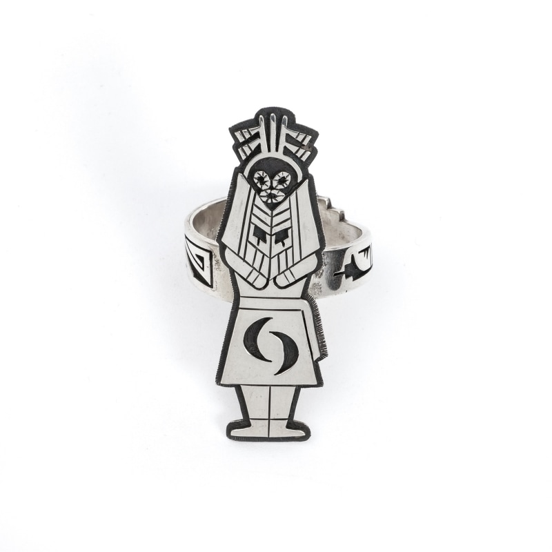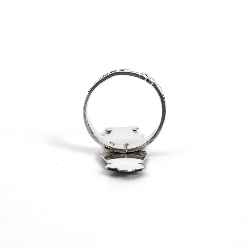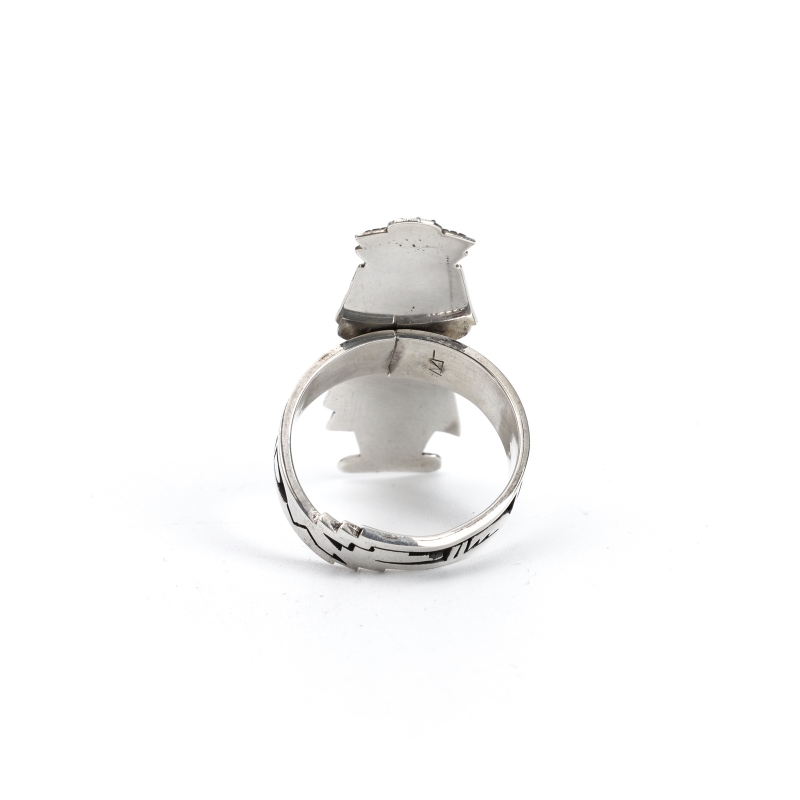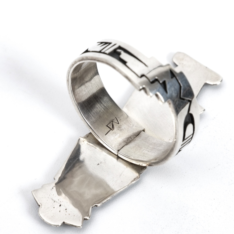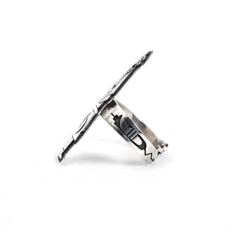 ベラタワホングバのオーバーレイリング、マライカのショップコレクションからのピックアップ品です。ベラ作品では珍しいトップをつけたリング。ベラの得意とする最細糸のこ”No.0”の繊細な線で切り出されているのは、Masau’u<マサウウ>、別名スケルトンカチナと呼ばれる雨と収穫をもたらす大地の精霊。ベラが昔の作品で使っている蛸のようなホールマークはこのカチナです。通常カチナは夏には山に帰ってしまうのですが、マサウウは唯一年間を通してホピの村にいるカチナ。シャンクも一切手向きなく、水の流れが切り出され階段状にカットアウトされていますます。他に見ないデザイン、この機会に是非。