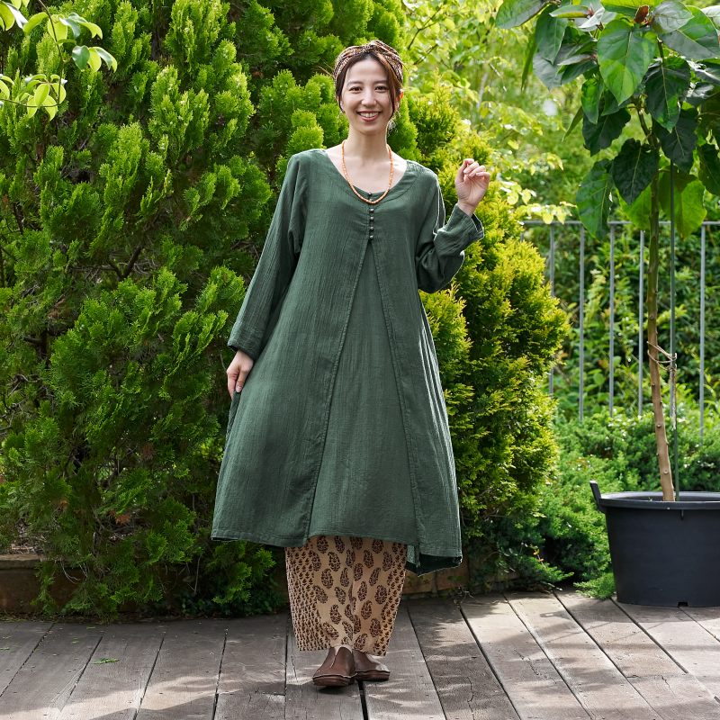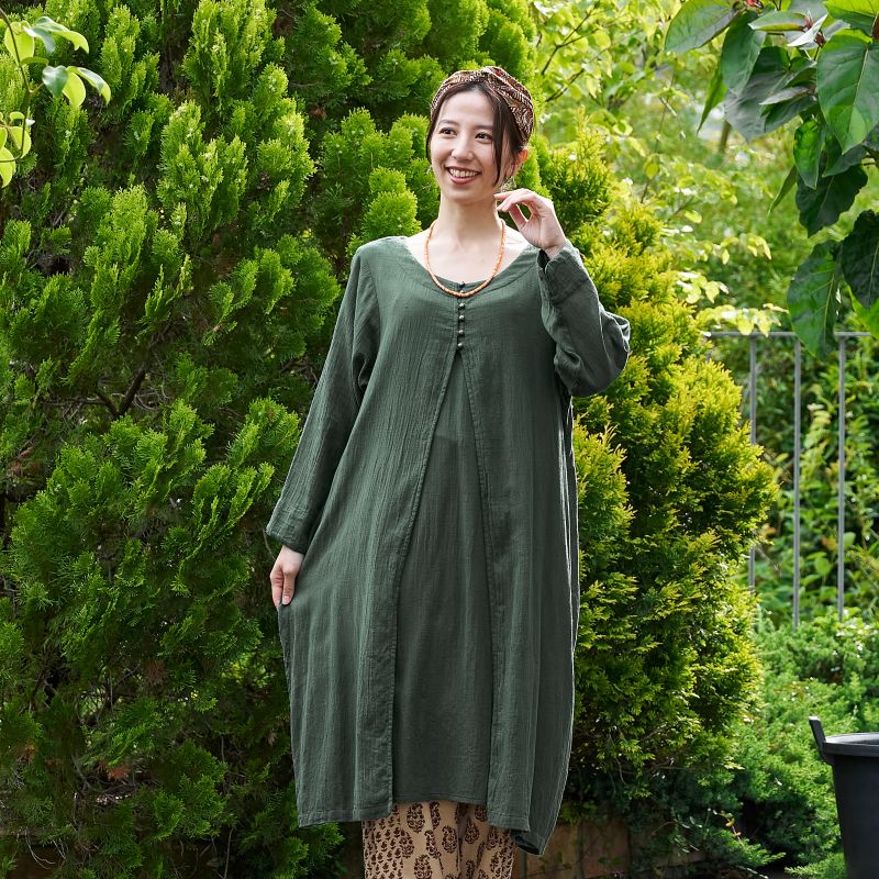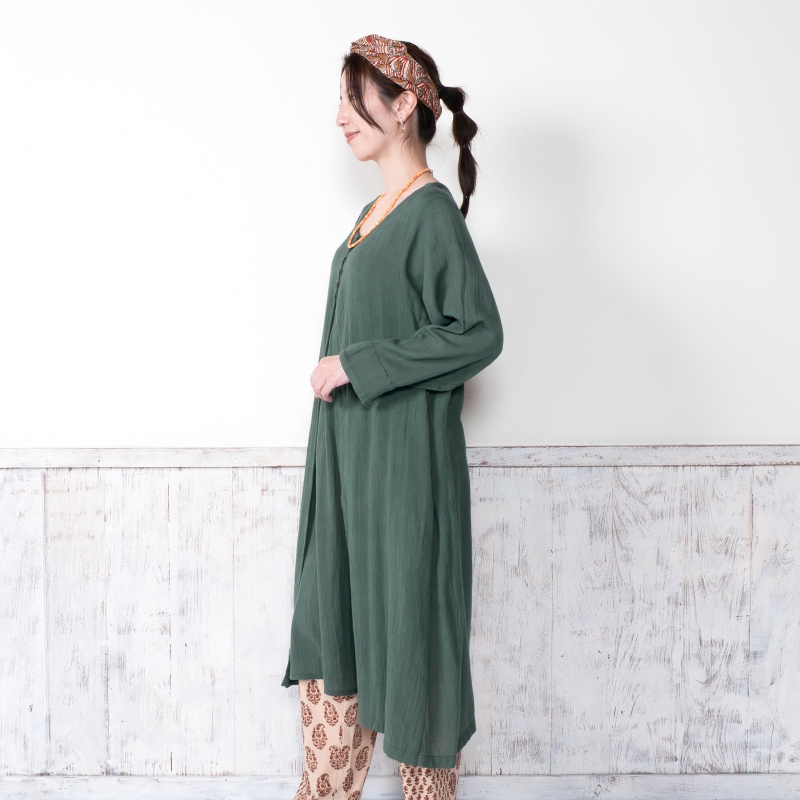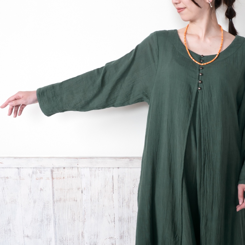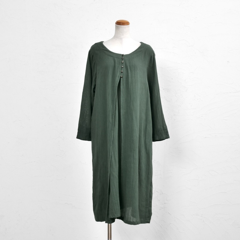 柔らかい肌心地でストレスフリーのコットン素材のダブルガーゼを使用したワンピース。フロントのレイヤードデザインがポイント。スタンダードのブラックと着回ししやすい落ち着いた色合いのグリーンの2色展開。ヴィンテージ風のメタルボタンがアクセントになったアイテム。柄物のボトムスを合わせた着こなしがおすすめ。