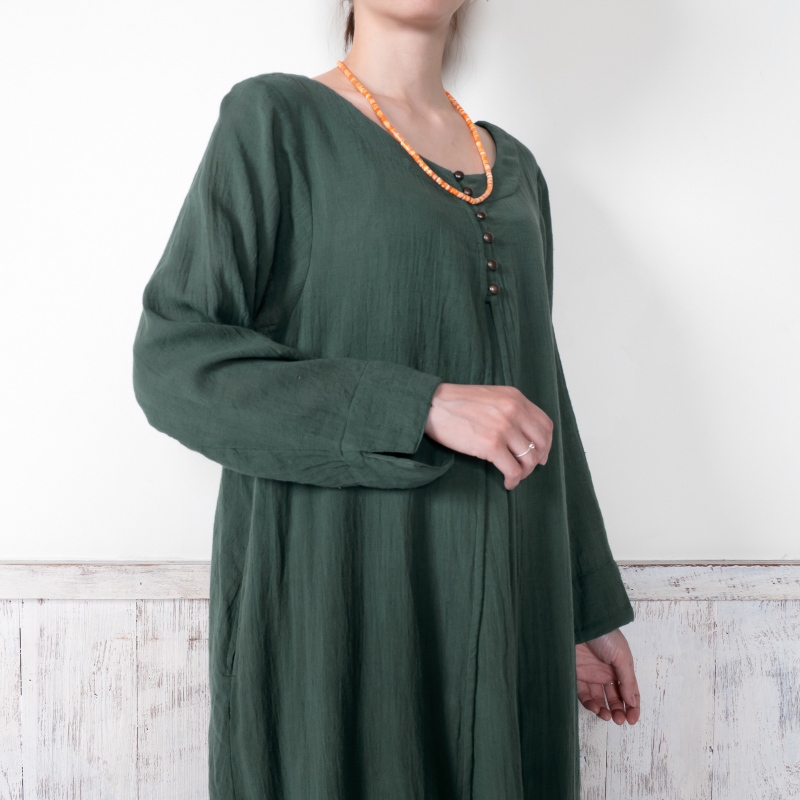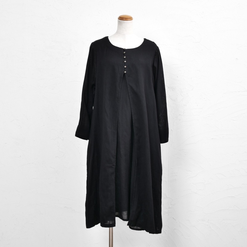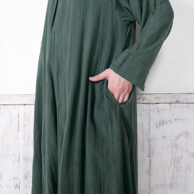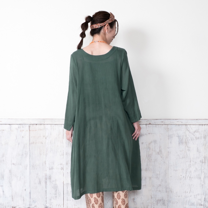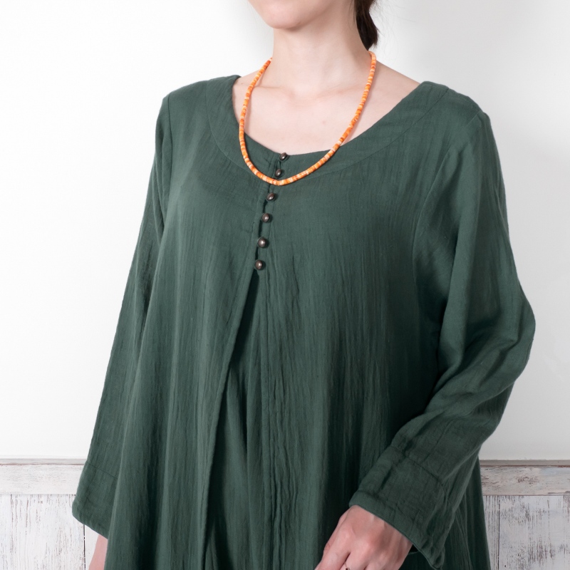 柔らかい肌心地でストレスフリーのコットン素材のダブルガーゼを使用したワンピース。フロントのレイヤードデザインがポイント。スタンダードのブラックと着回ししやすい落ち着いた色合いのグリーンの2色展開。ヴィンテージ風のメタルボタンがアクセントになったアイテム。柄物のボトムスを合わせた着こなしがおすすめ。