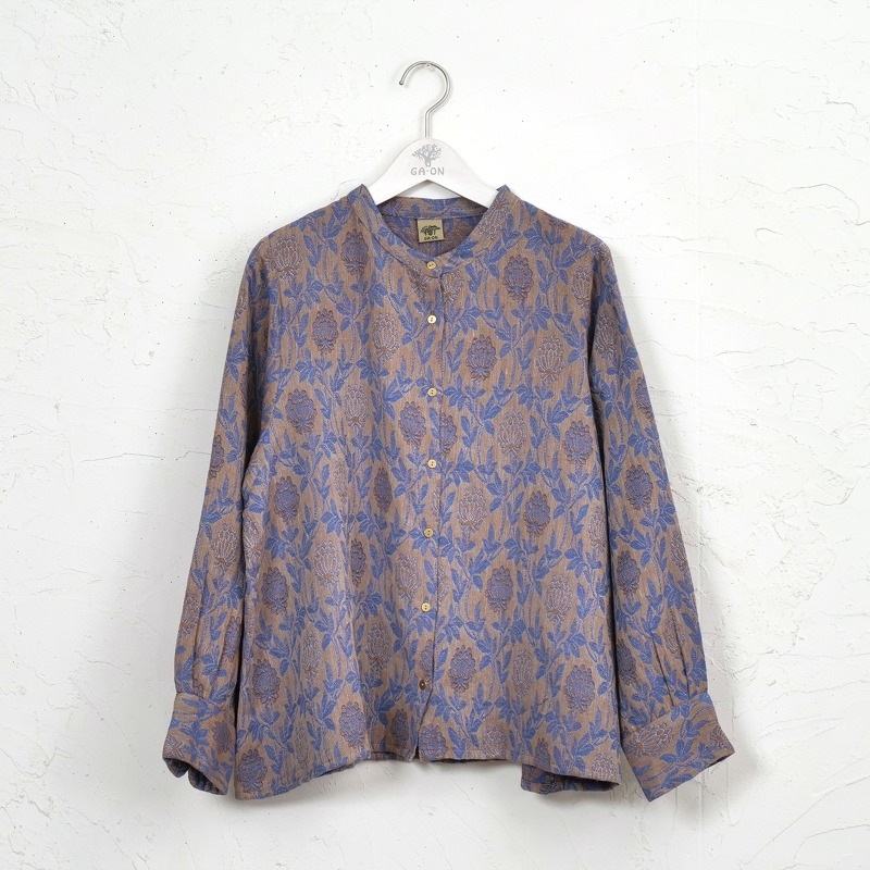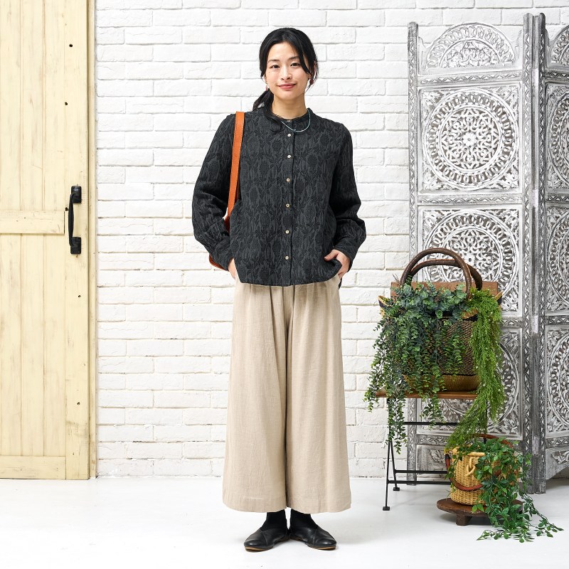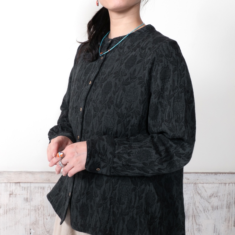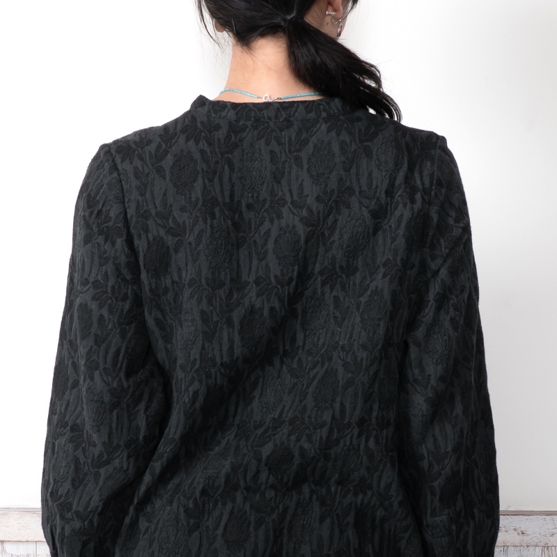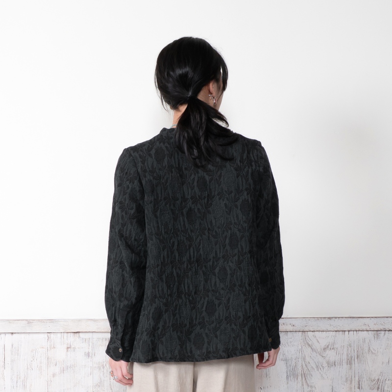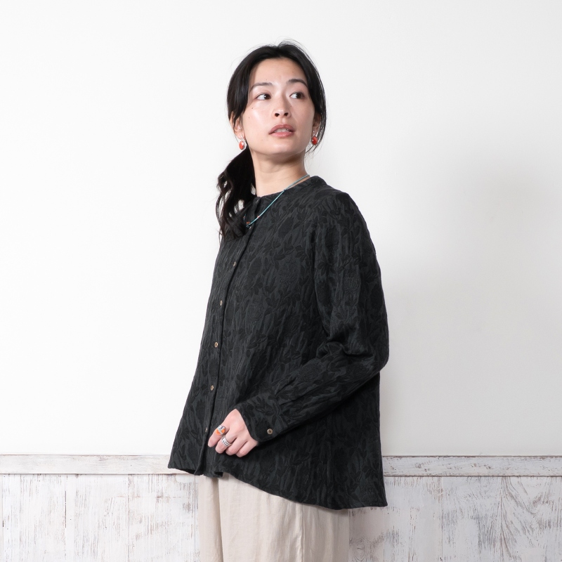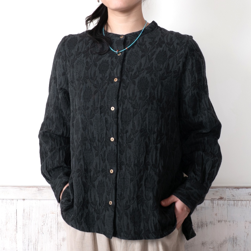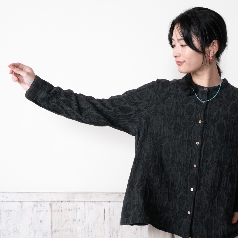 淡く落ち着いた色合いのジャガードブラウス。細やかな模様が上品さを引き立てながらも、どこか可憐な雰囲気も感じられる。程よくゆとりのあるシルエットが心地よく、日常にも特別な日にも自然に馴染む、頼れるアイテム。ブラックとブルーの2色展開です。