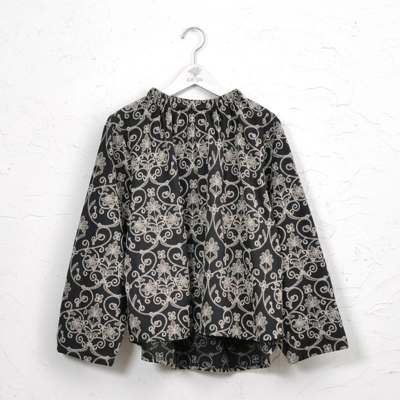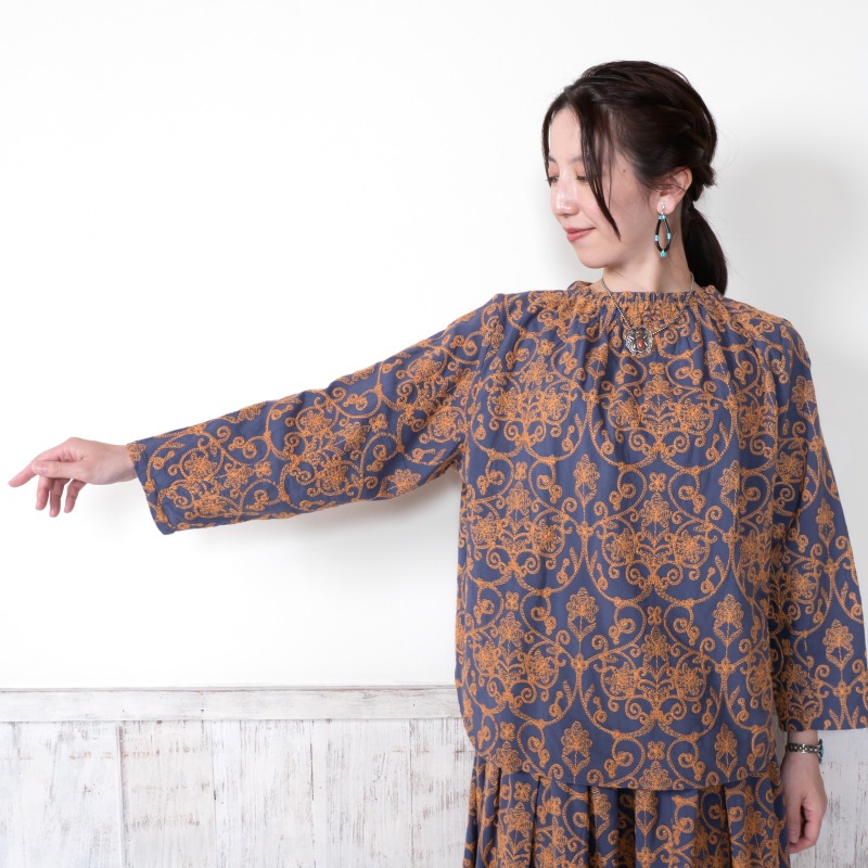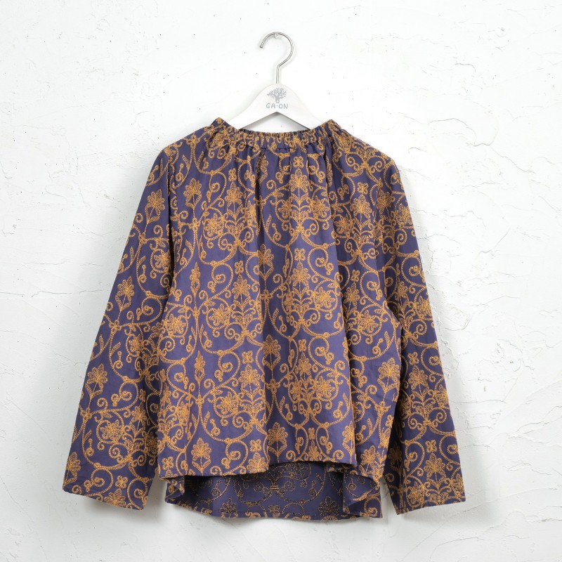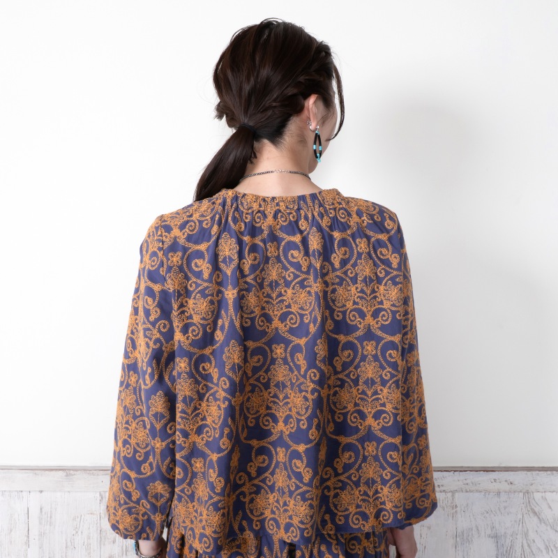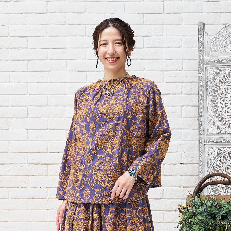 豪華な配色刺繍がフェミニンな装いを引き立ててくれるプルオーバー。細かく繊細な刺繍が全体に施され、上品さをプラス。生地のベースカラーと刺繍のカラー配色が印象的なアイテム。襟はゴム入りのギャザーになっているので、着脱しやすい仕様になっています。同シリーズのスカートとセットアップで合わせたり、大人なエスニックコーデが楽しめるデザインです。