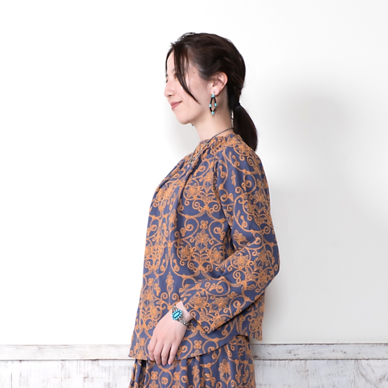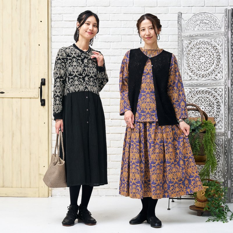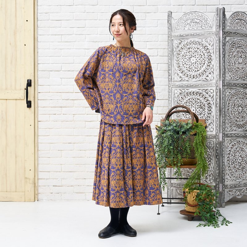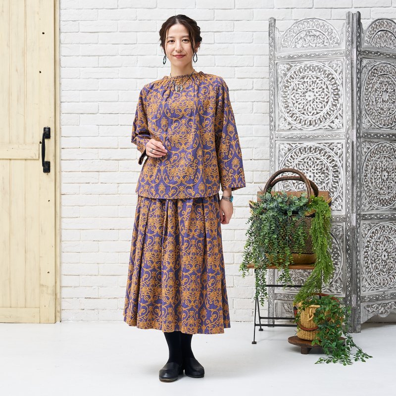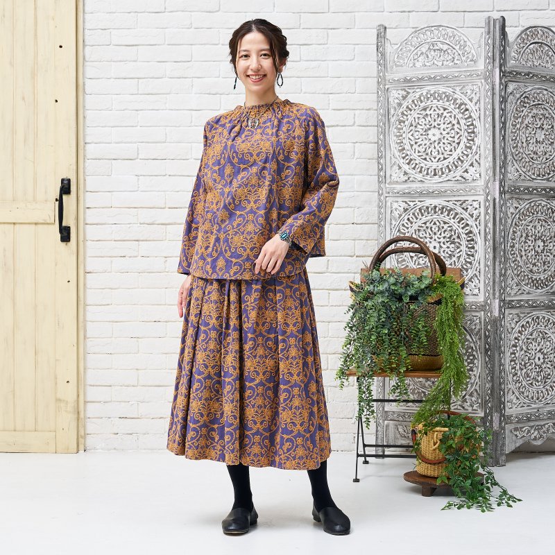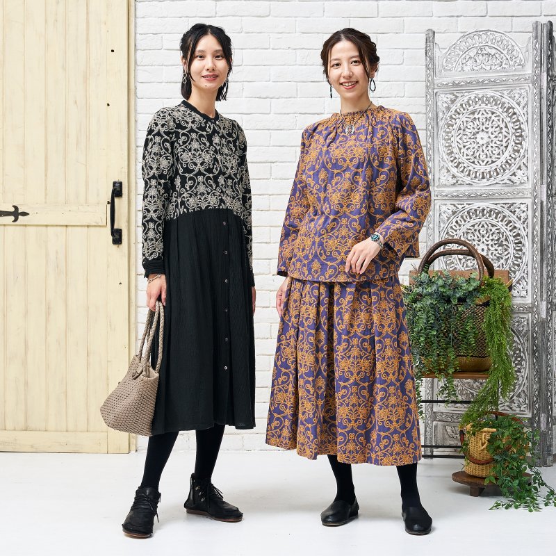 豪華な配色刺繍がフェミニンな装いを引き立ててくれるプルオーバー。細かく繊細な刺繍が全体に施され、上品さをプラス。生地のベースカラーと刺繍のカラー配色が印象的なアイテム。襟はゴム入りのギャザーになっているので、着脱しやすい仕様になっています。同シリーズのスカートとセットアップで合わせたり、大人なエスニックコーデが楽しめるデザインです。