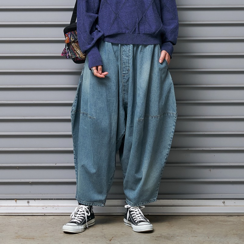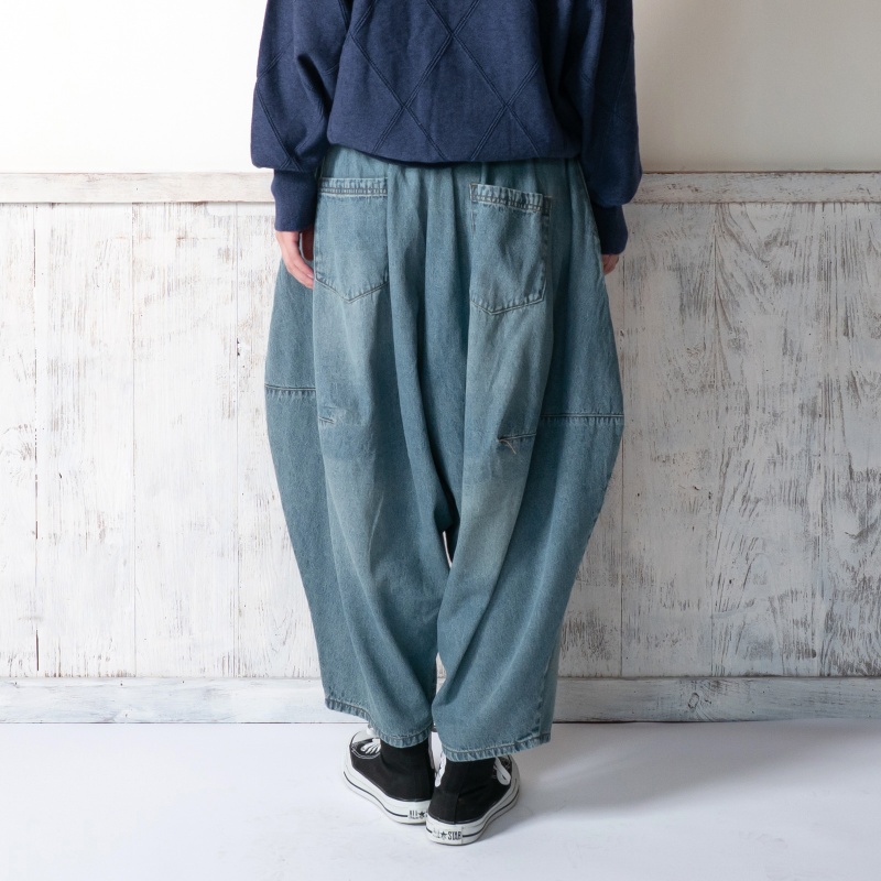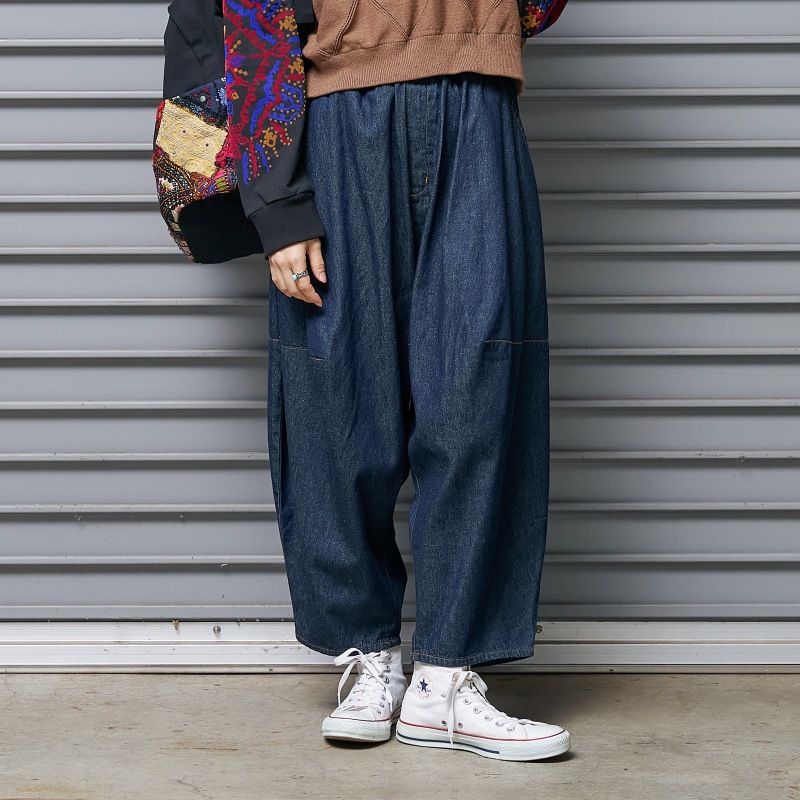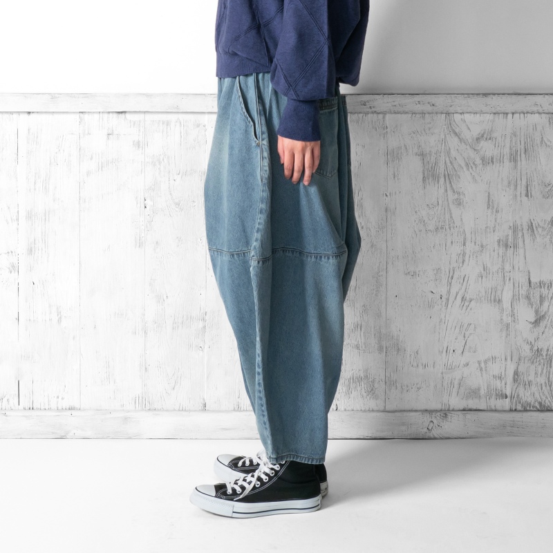 丸みのあるシルエットが特徴のヒッコリーデニムパンツ