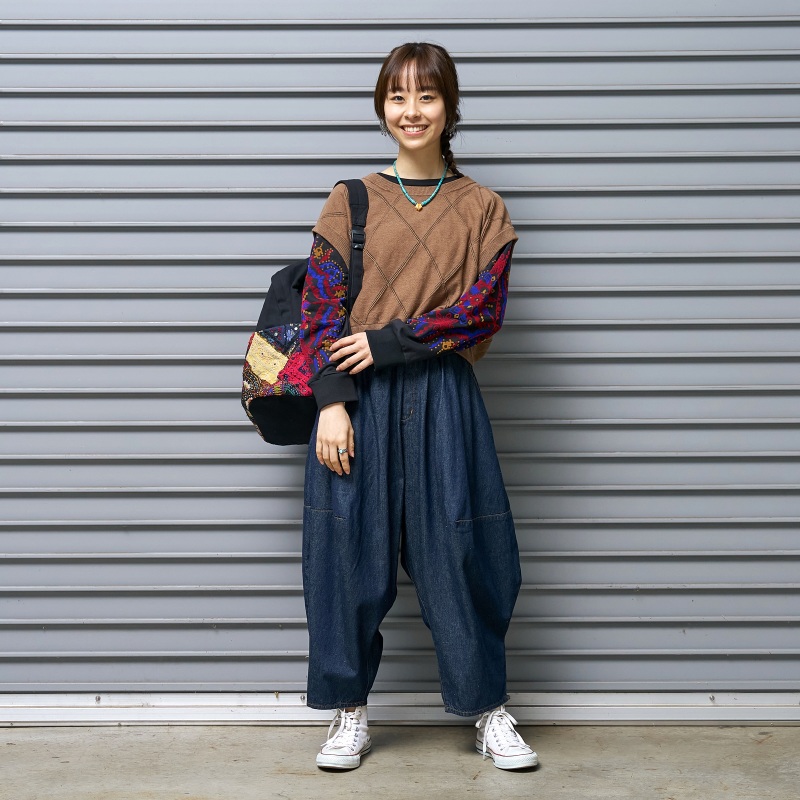 ゆったりしたオーバーサイズのヒッコリーデニム。低身長の方も挑戦しやすい丈感がポイント。トップスにニットや柄物のアイテムを合わせてカジュアルに着こなすのがおすすめ。どんなアイテムにも合わせやすく、ロングシーズン着回せるアイテムです。