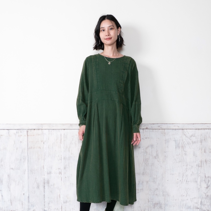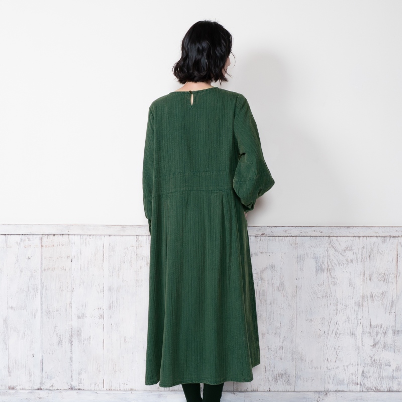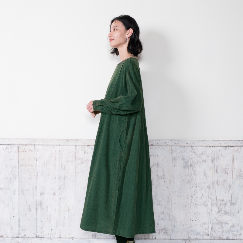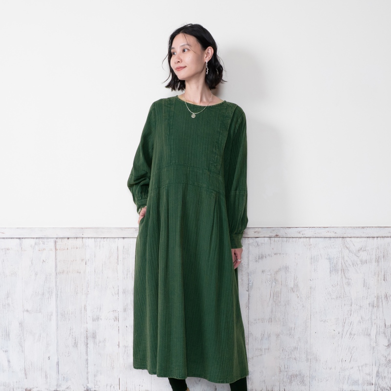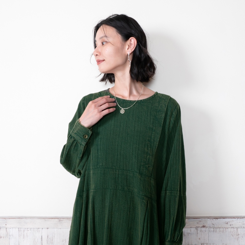 落ち着いたカラーの生地にヴィンテージ感をプラスしたワンピース。ウォッシュ加工の生地にくすみカラーのメタルボタンがアクセントに。アシンメトリーな前あきが印象的なデザイン。着まわしやすいグリーンとブラウンの2色展開。ストライプ状の織り柄が入った肌なじみの良い柔らかい生地を使用し、見た目よりも軽い着心地のアイテムです。
