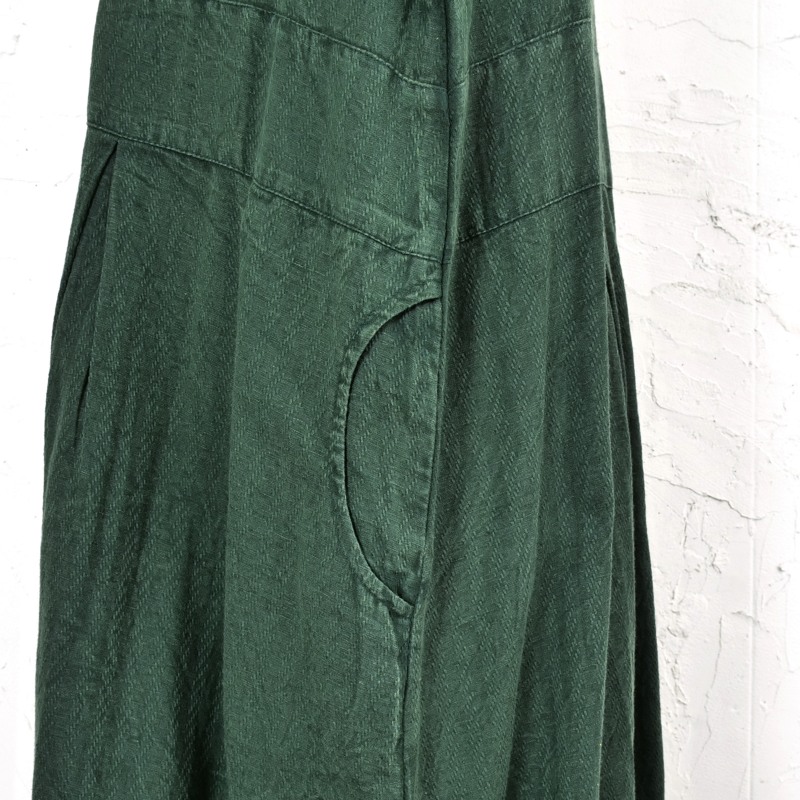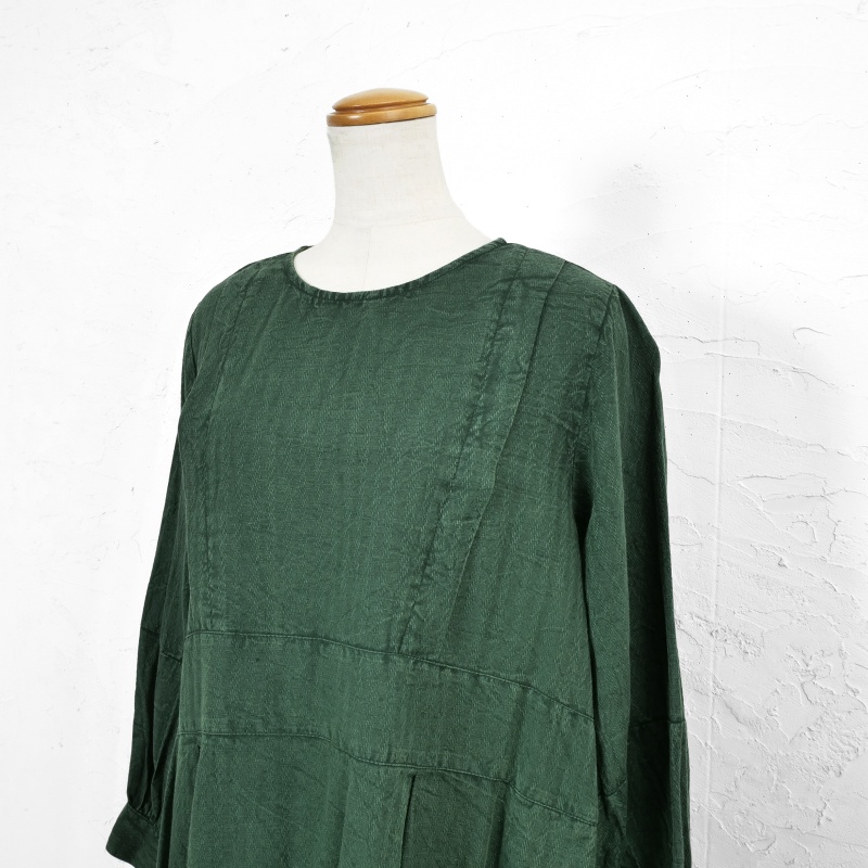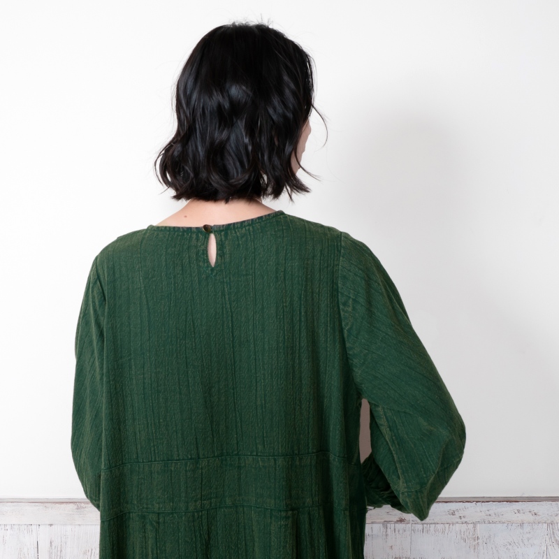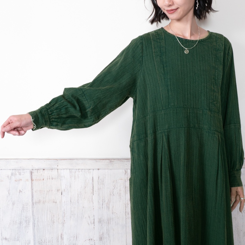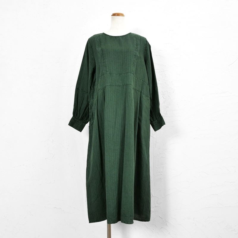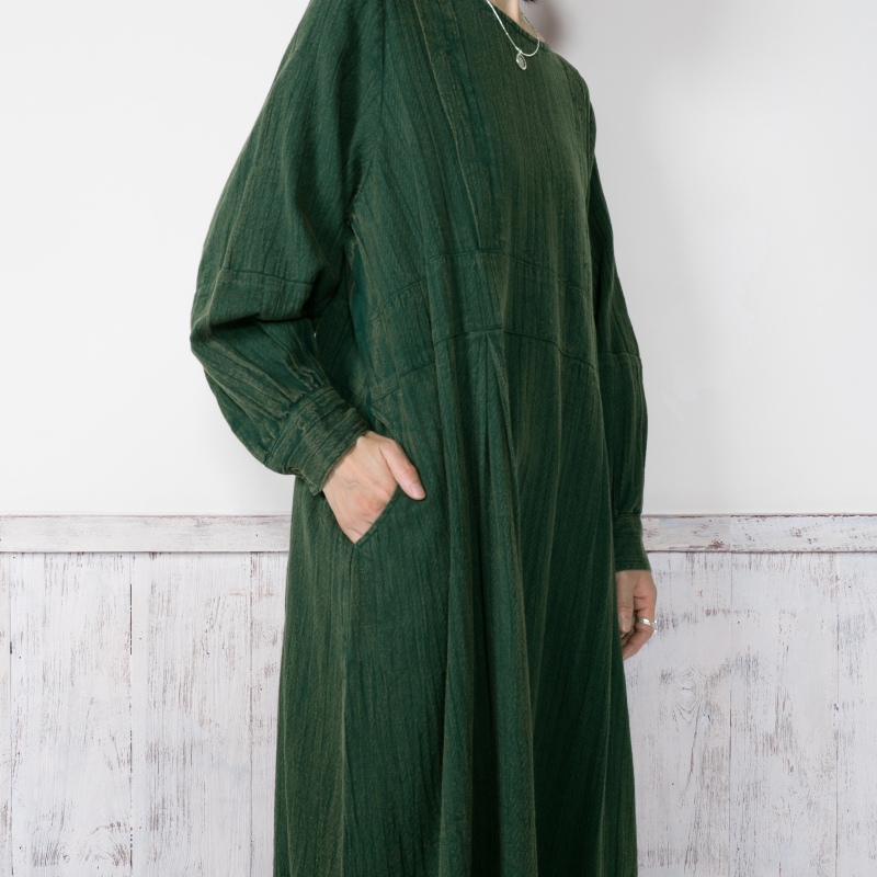 落ち着いたカラーの生地にヴィンテージ感をプラスしたワンピース。ウォッシュ加工の生地にくすみカラーのメタルボタンがアクセントに。アシンメトリーな前あきが印象的なデザイン。着まわしやすいグリーンとブラウンの2色展開。ストライプ状の織り柄が入った肌なじみの良い柔らかい生地を使用し、見た目よりも軽い着心地のアイテムです。