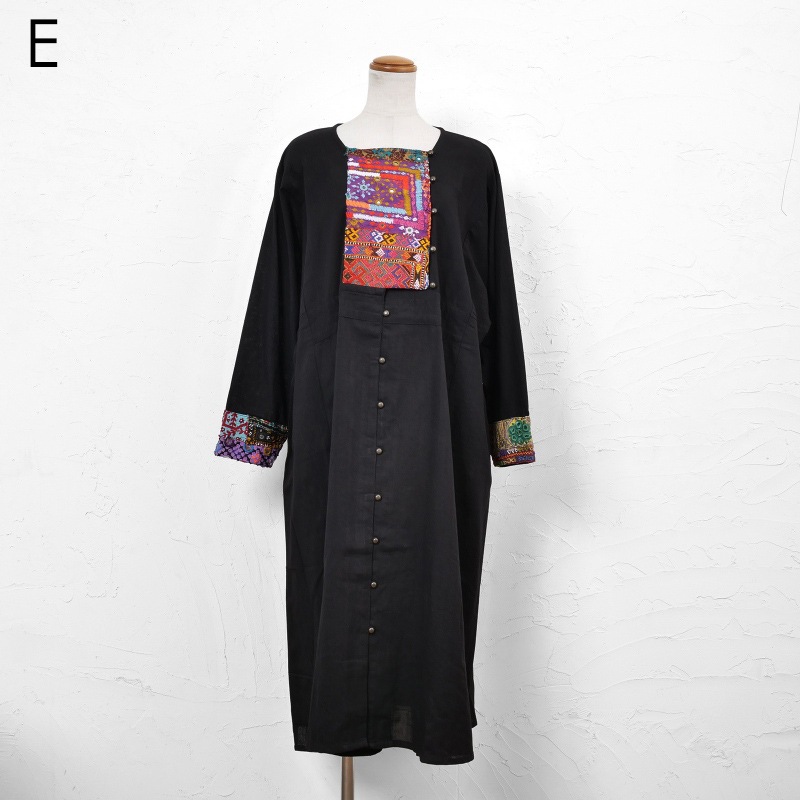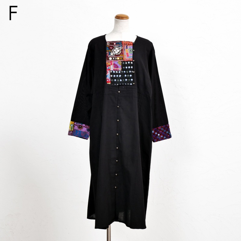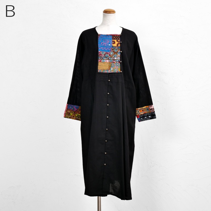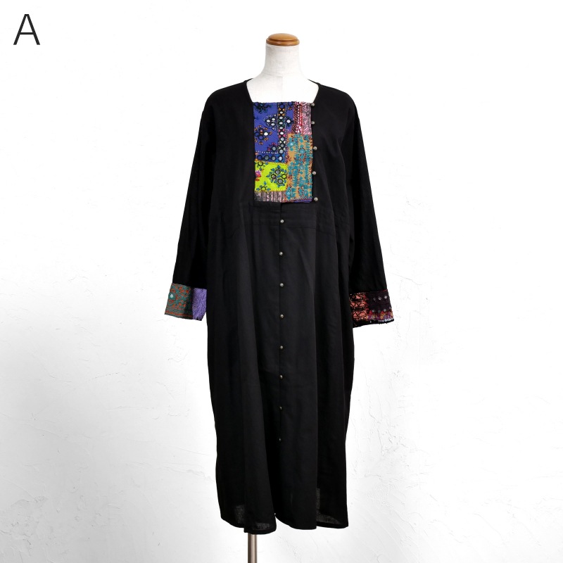 刺繍やミラーワークがふんだんに施された様々な古布を使用したパッチワーク前あきワンピース。ブラックの生地にカラフルな古布が華やかに映えるデザイン。手仕事ならではの温もりと、民族の力強さが感じられるアイテムで、それぞれに表情が違う、世界にひとつだけの特別な一枚です。シンプルな無地のボトムスを合わせた着こなしがおすすめです。