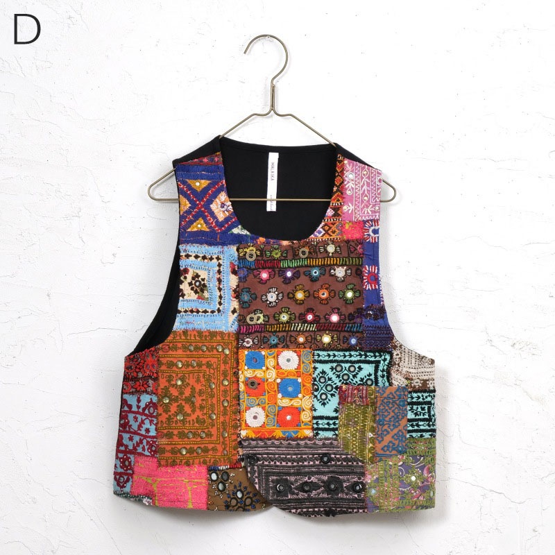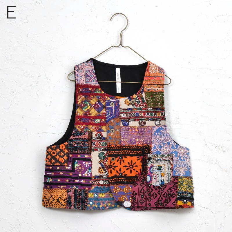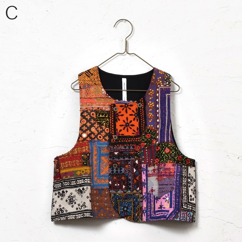 刺繍やミラーワークがふんだんに施された様々な古布を使用したベスト。手仕事ならではの温もりと、民族の力強さが感じられるアイテムで、それぞれに表情が違う、世界にひとつだけの特別な一枚です。シンプルなワンピースやブラウスなどのトップスを合わせた着こなしがおすすめです。