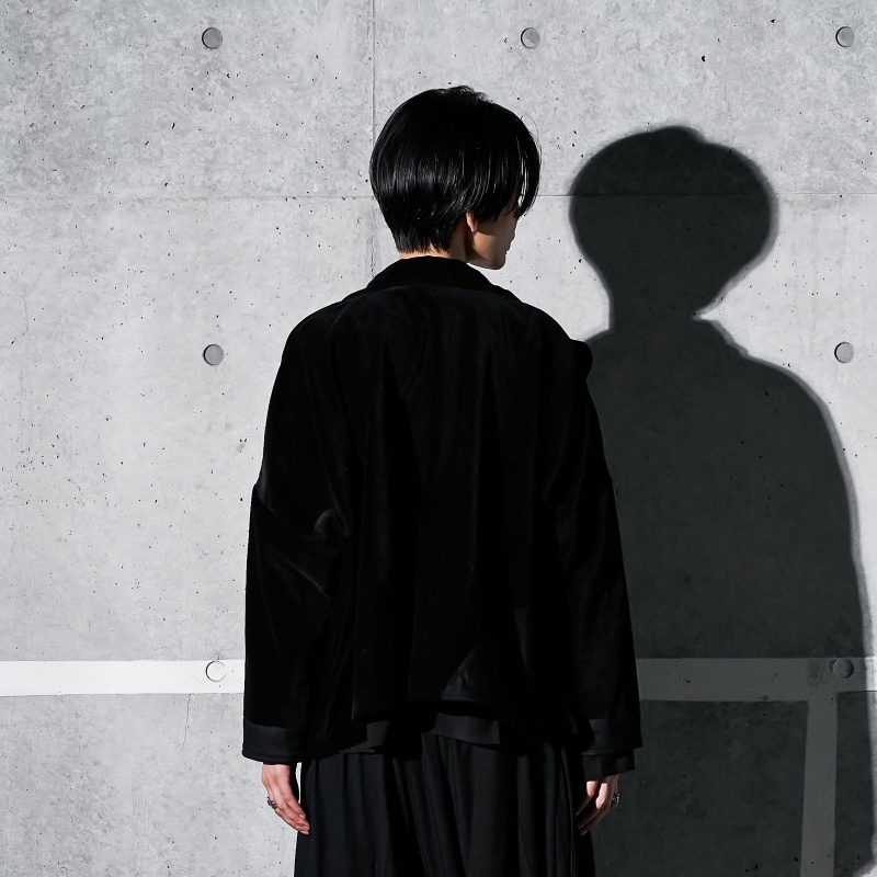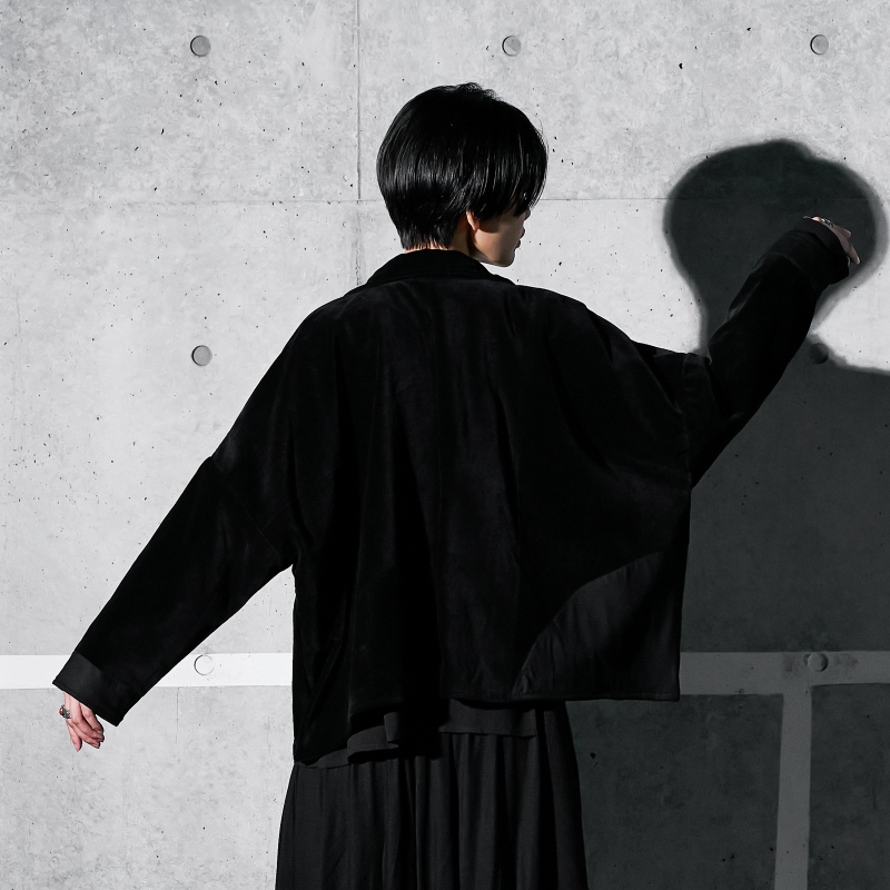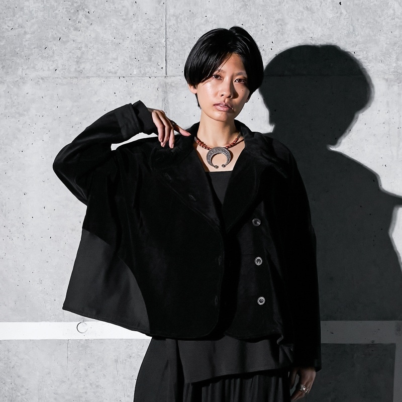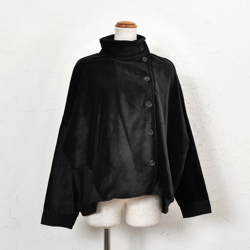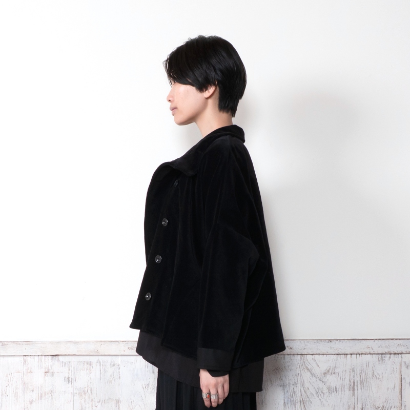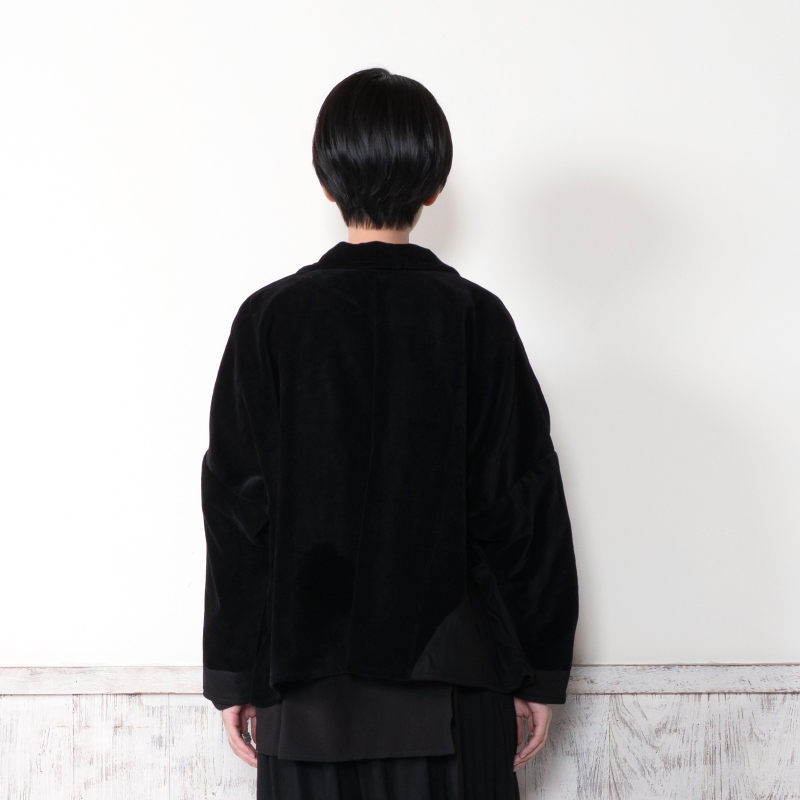 スタンドネックの別珍ジャケット。光沢のある別珍を使用した存在感を感じさせるアイテム。右ポケット部分には丸いモチーフを施し、ツイル素材にすることでコントラストをプラス。ゆったりしたオーバーサイズでメンズにも着用いただけます。