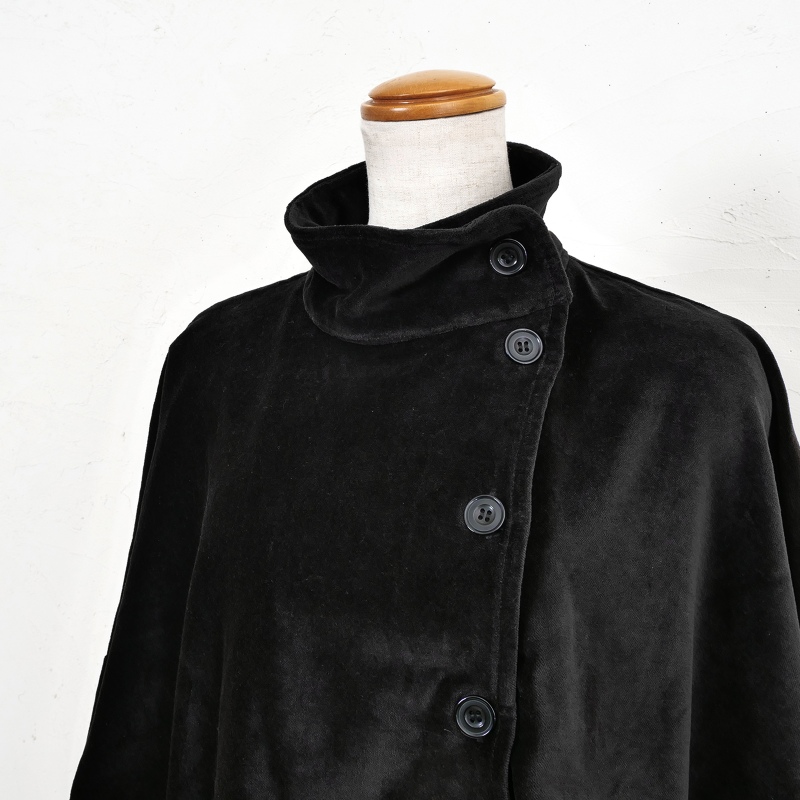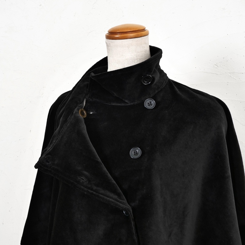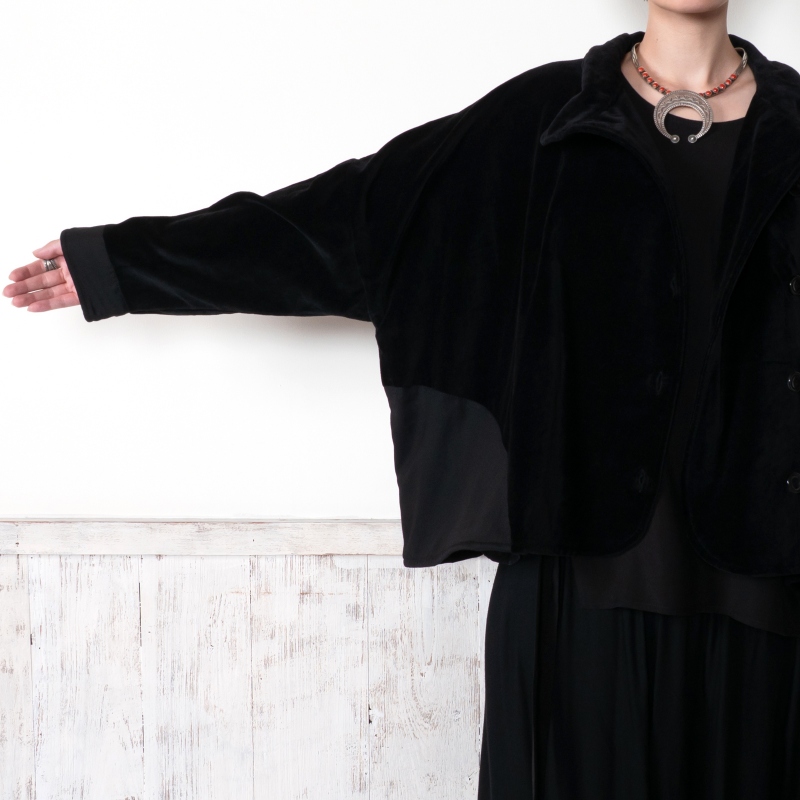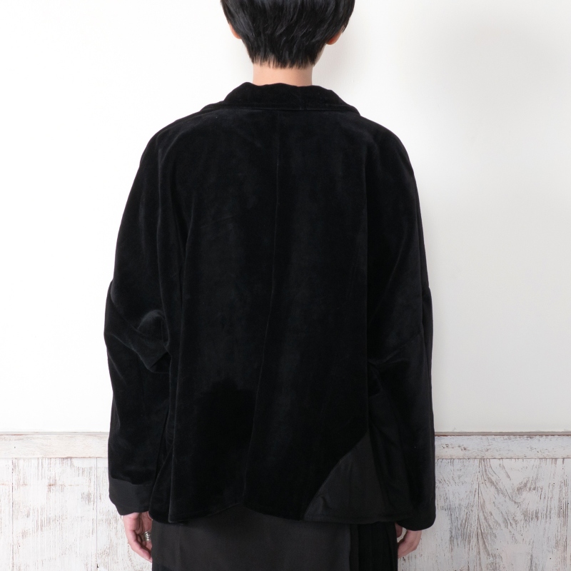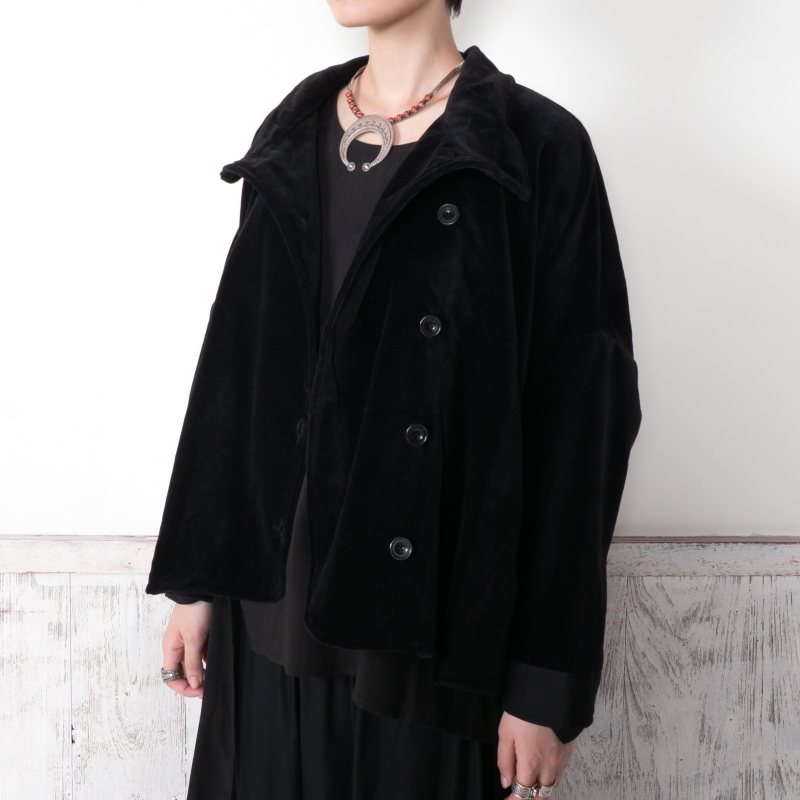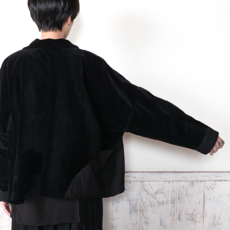 スタンドネックの別珍ジャケット。光沢のある別珍を使用した存在感を感じさせるアイテム。右ポケット部分には丸いモチーフを施し、ツイル素材にすることでコントラストをプラス。ゆったりしたオーバーサイズでメンズにも着用いただけます。