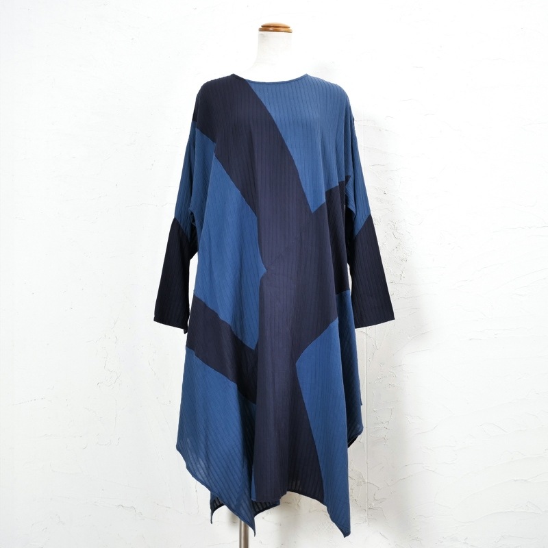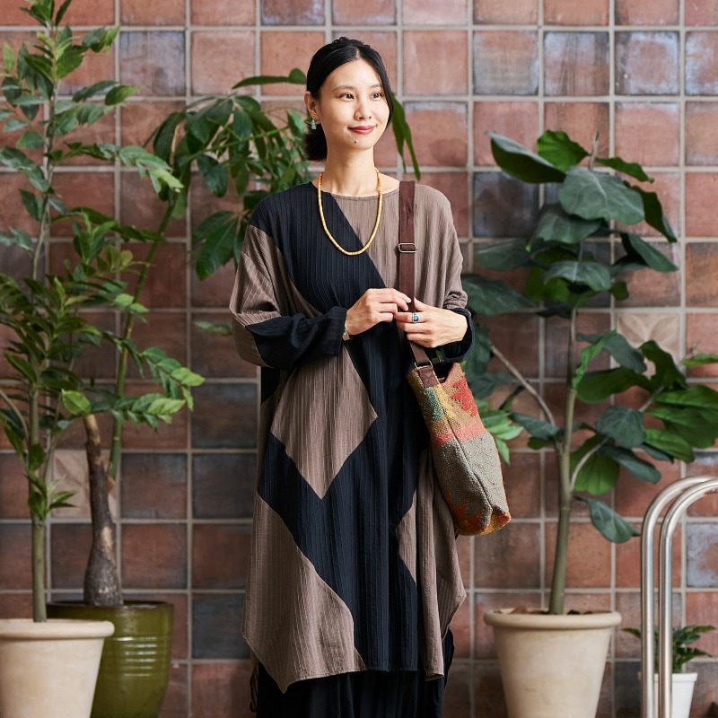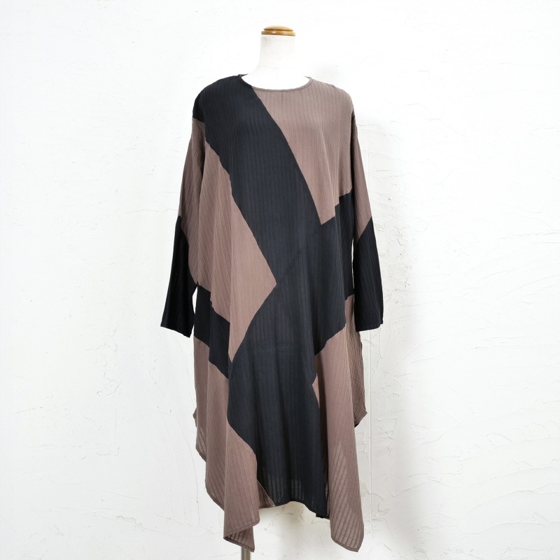 ゆったりとしたラインのワンピース。裾に向かって広がるゆったりとしたラインで、イレギュラーにカットした裾に動きのあるデザイン。楽な着心地ながらも個性を引き立ててくれるアイテム。コントラストの効いたカラーリングが印象的。シンプルなボトムスなどを合わせた着こなしがおすすめ。コーディネートしやすいくすみ系の色合いもポイント。