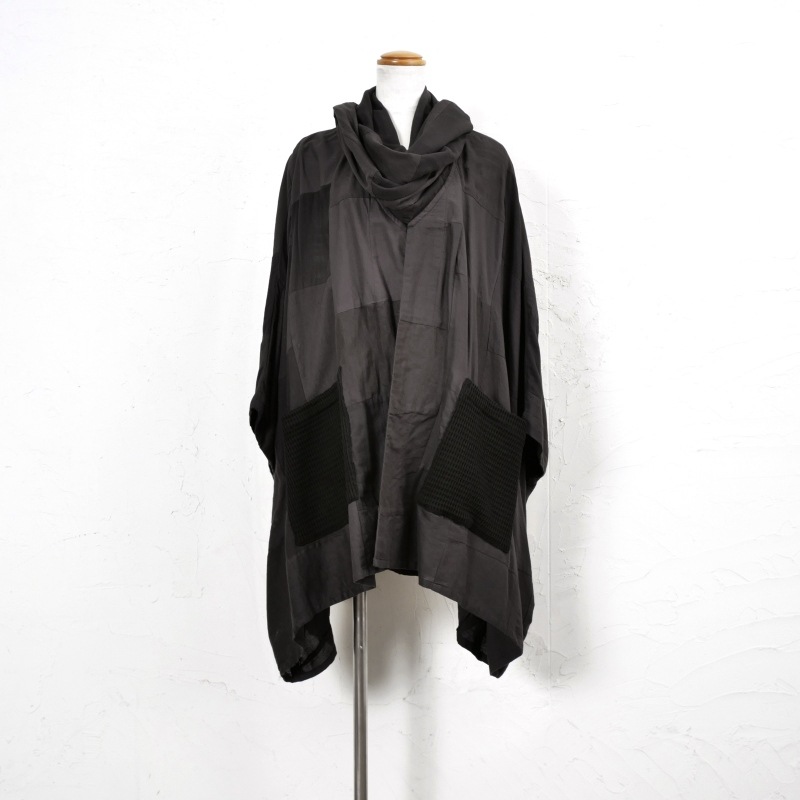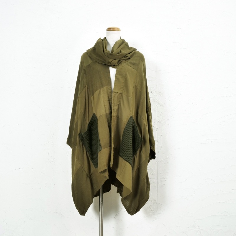 オーバーサイズで男女問わず着ていただけるパッチワークのポンチョ。ショールを後ろに回して着こなすスタイルが人気の長年ご好評いただいておりますショール付きのデザイン。ポケットの配色が程よくアクセントになったアイテム。動きやすく体型を選ばないシルエットで、季節の変わり目にも重宝するアイテムです。