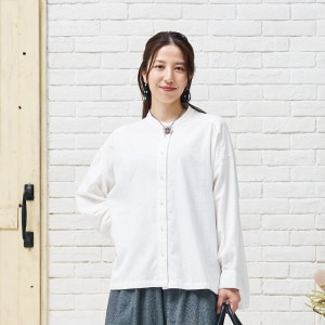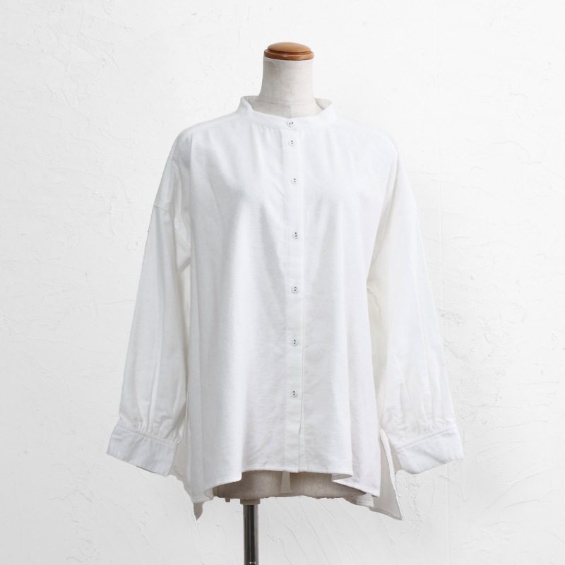 | 仕様 | スタンドカラー 前あき・袖口くるみボタン付き 裾サイドスリット入り 袖口カフス(ギャザー入り) |