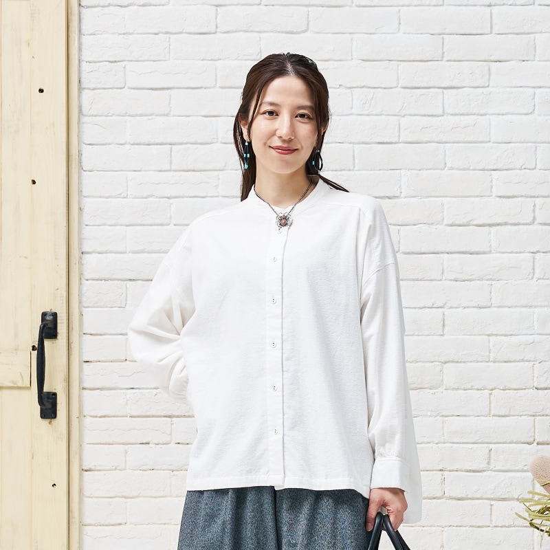 ふんわりとした肌触りが心地よい生地を使用したブラウス。スタンドカラーや袖口のカフスできちんと感がプラスされたデザイン。大人ナチュラルな着こなしにぴったりのアイテム。落ち着いた色合いのグリーンと発色の良いホワイトの2色展開。ボトムスには柄物のアイテムを合わせた着こなしがおすすめ。