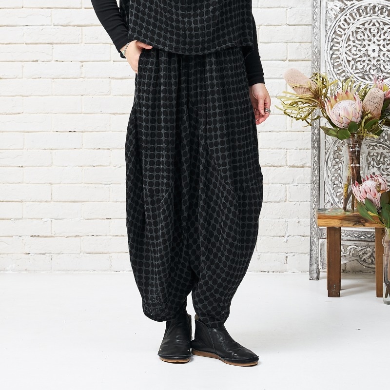 ドット柄の変形パンツ。モノトーンで仕上げたドット柄は甘くなりすぎず大人の女性にもぴったり。エスニックな雰囲気を感じさせるトラディショナルなデザインが魅力。ほどよく力の抜けたシルエットと柔らかい風合いが特長。同シリーズのプルオーバーやジャケットを合わせて、こなれた雰囲気を演出してくれるセットアップでの着こなしがおすすめです。