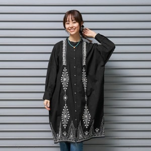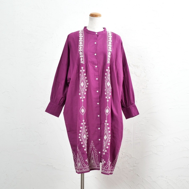 ラメ入りのコード刺繍が特徴の前あきワンピース。かなりゆったりした丸みのあるシルエット。前身頃と裾の煌びやかな装飾が華やかさをプラス。ブラックとパープルの2色展開。ブラックはシックに、パープルは華やかな印象に。色味を合わせた刺繍バッグを合わせてこなれ感UP。