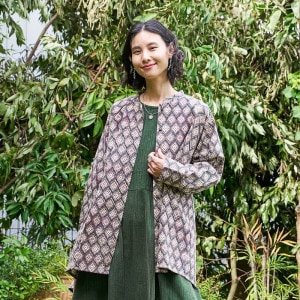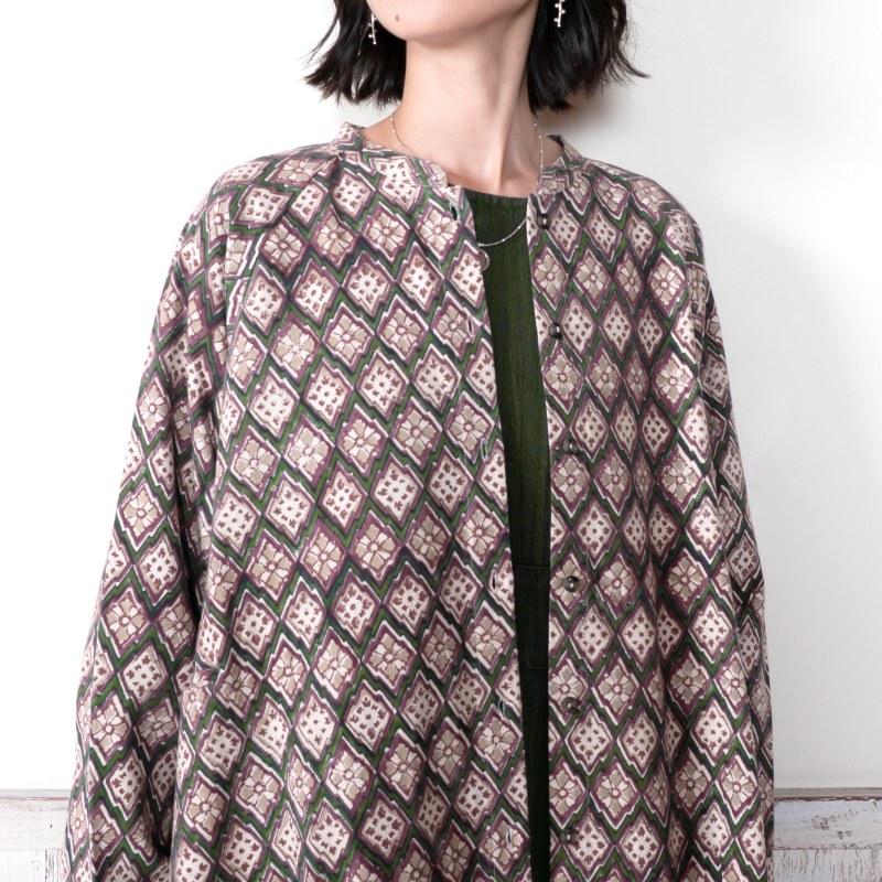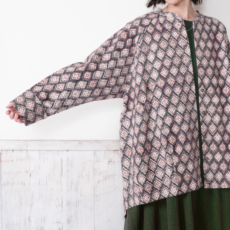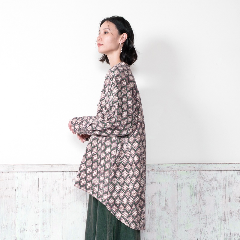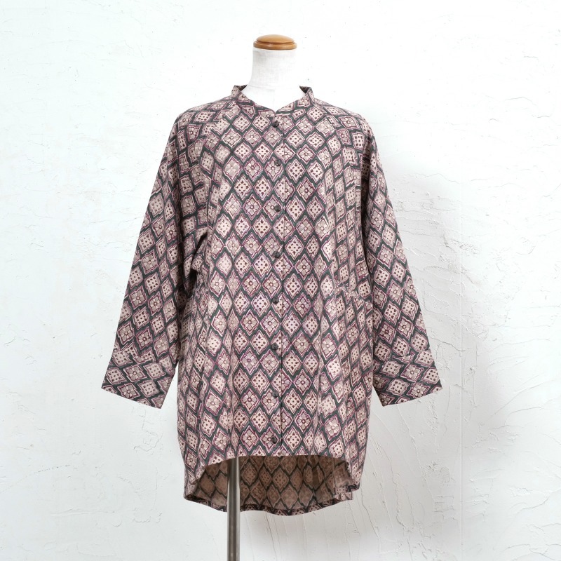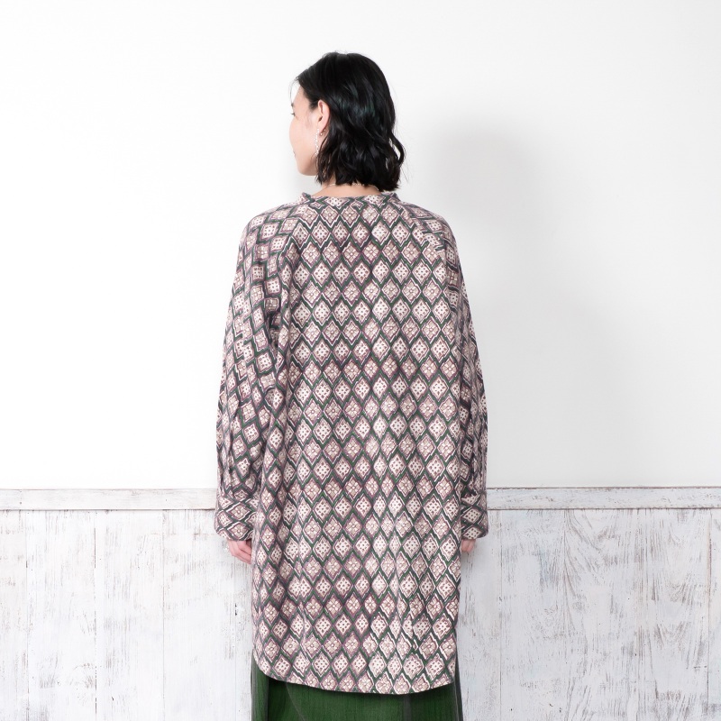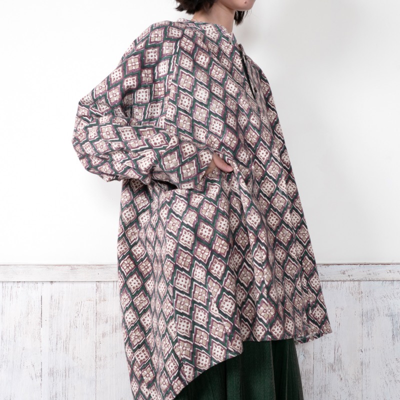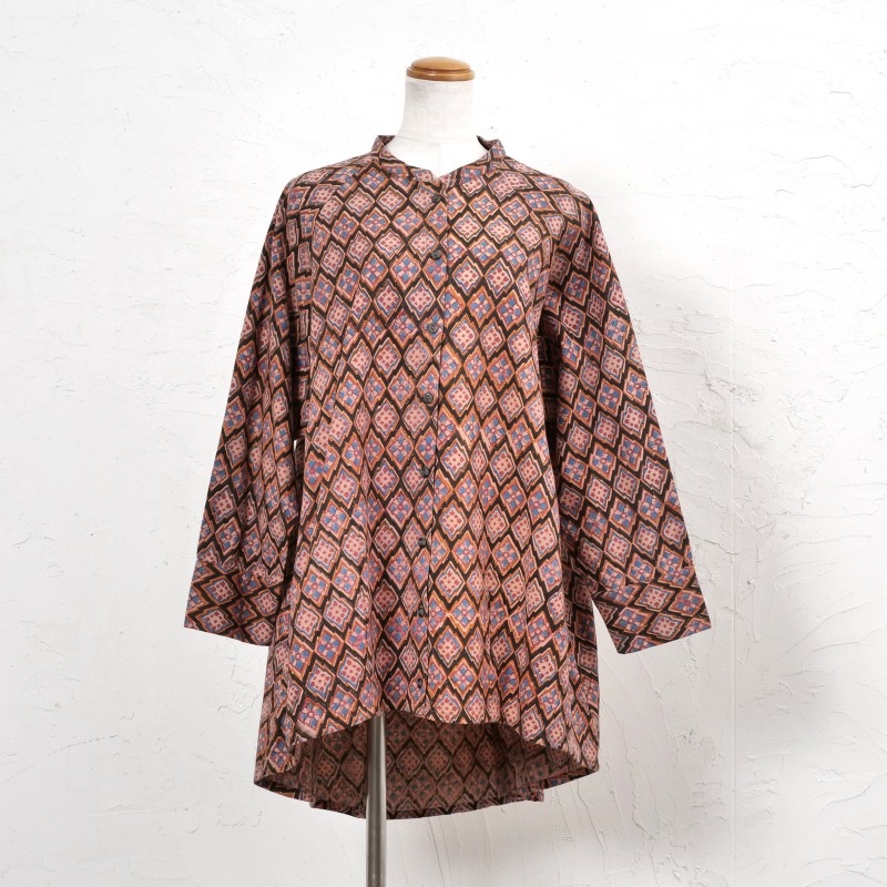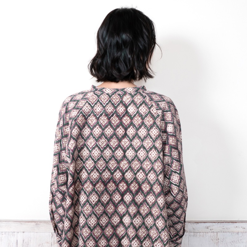 どこか懐かしさを感じさせる幾何学柄が印象的なデザインのブラウス。木版染め特有のかすれや濃淡、わずかな柄のずれが、一点ごとに表情の違いがあり、素朴で味わいのある風合いを楽しめるアイテム。ゆったりとしたオーバーサイズでカジュアルなリラックス感のある着心地。肉厚のコットン生地を使用しているので、季節の代わりの目の薄手のアウターとしても着回せます。