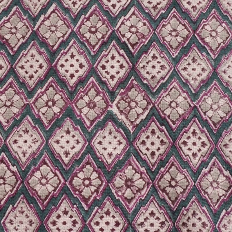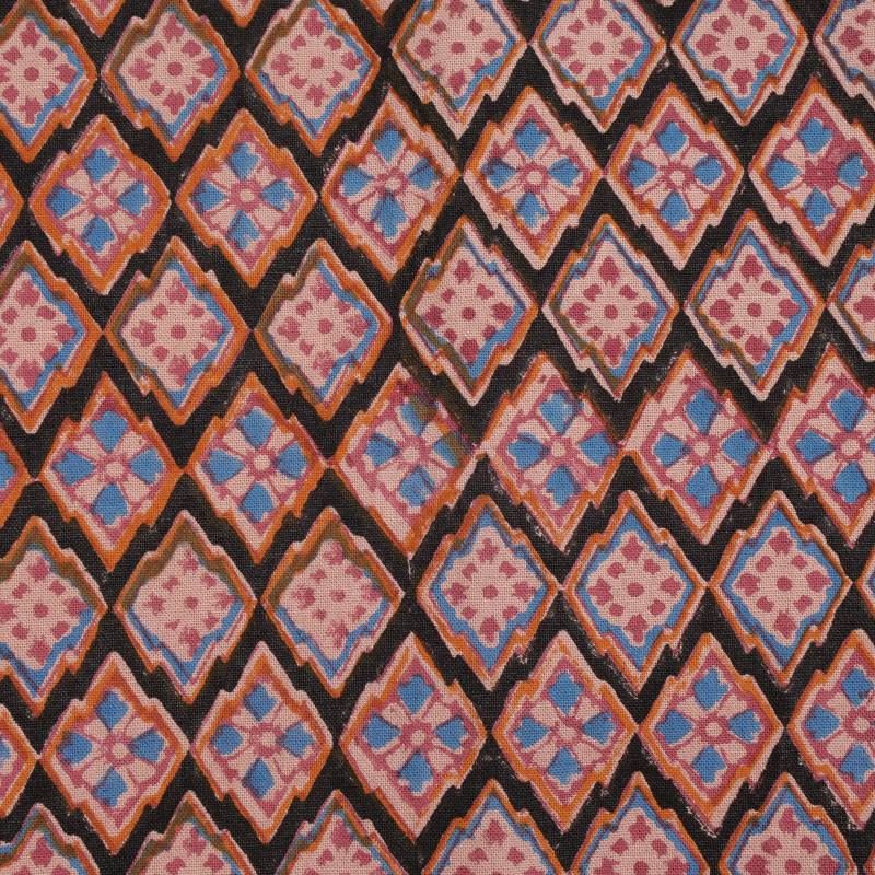 使われている色の数だけ作業の工程が増え、手間と時間が惜しみなく掛けられます。ブロックプリントに見られるかすれやにじみ、柄のずれには、インドの手仕事の温かみが現れています。