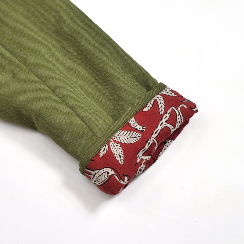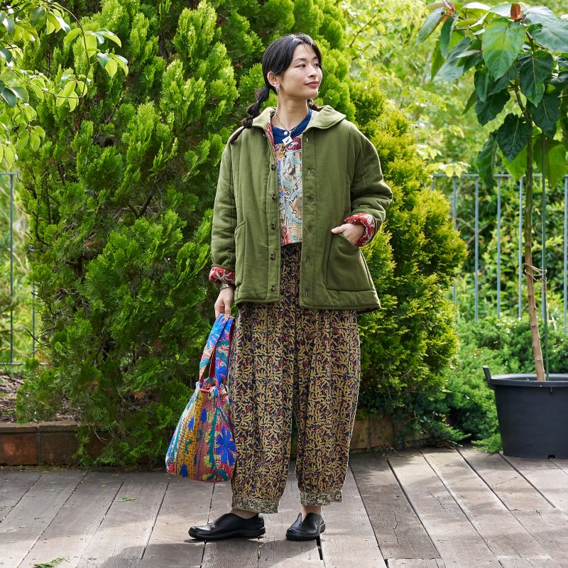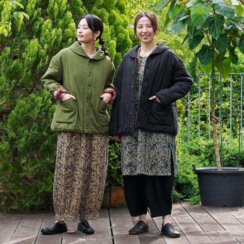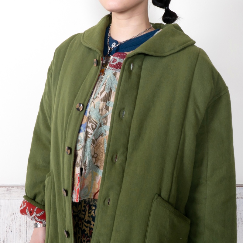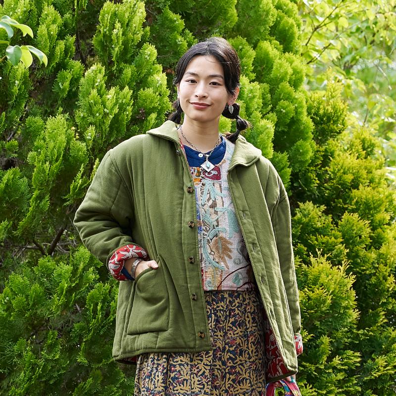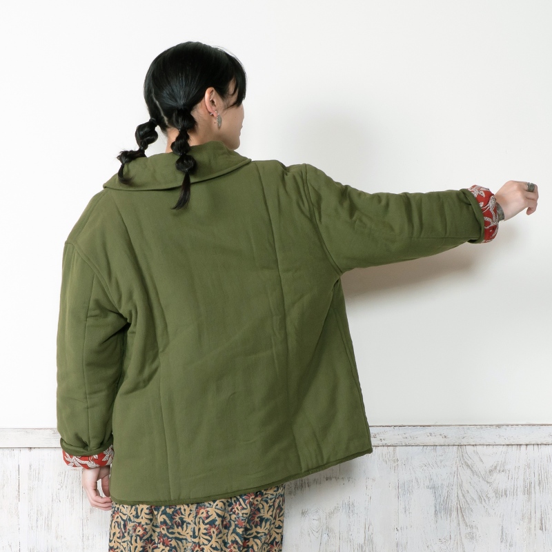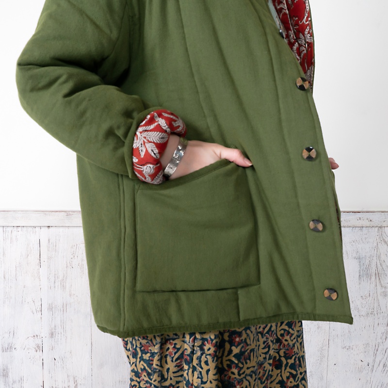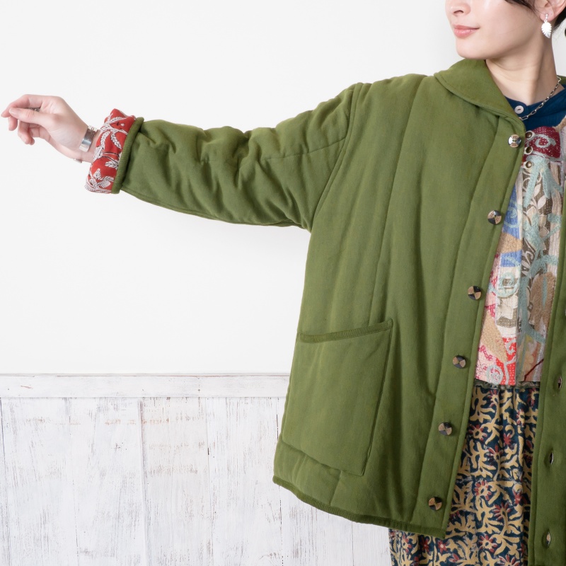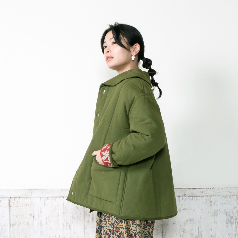 裏地に使用した動物モチーフのブロックプリントの生地を使用したジャケット。中綿入りで暖かく冬のアウターとして活躍するアイテム。大きなホーンボタンとパッチポケットが付いたデザイン。裏地のブロックプリントの柄は1点1点異なるもの魅力。エスニックコーデに合わせやすい落ち着いた色合いのグリーンとネイビーの2色展開です。