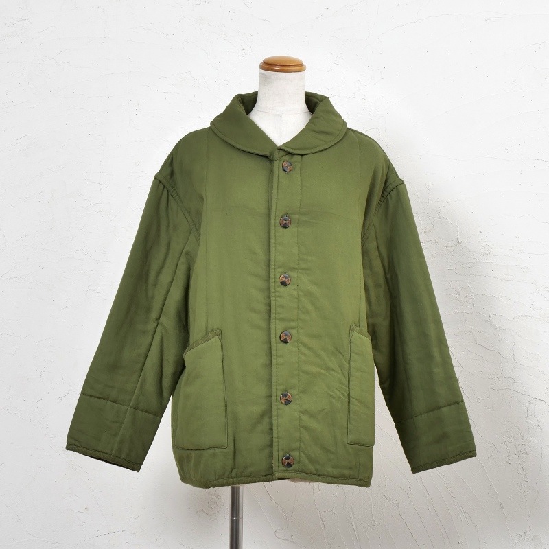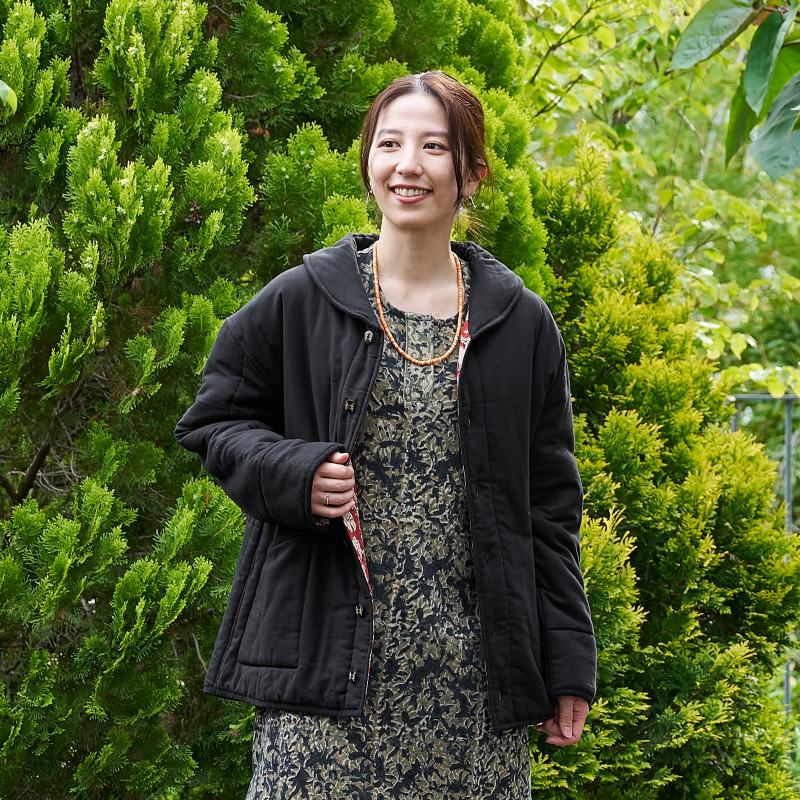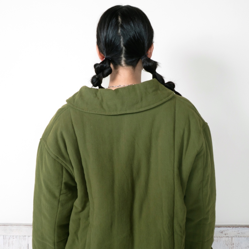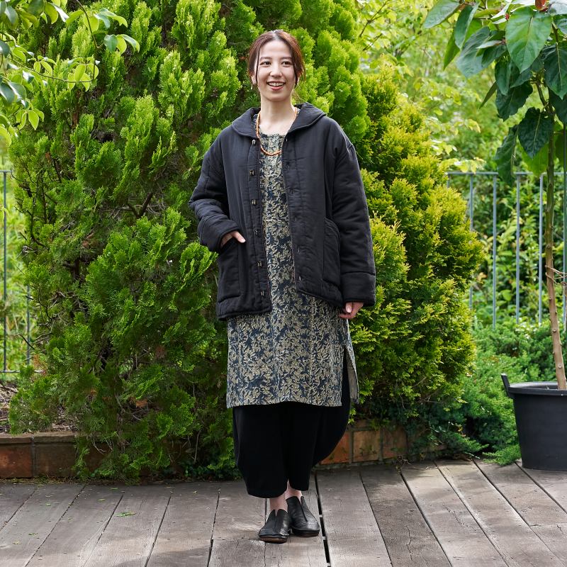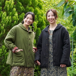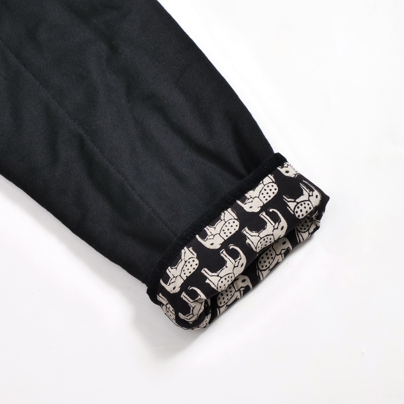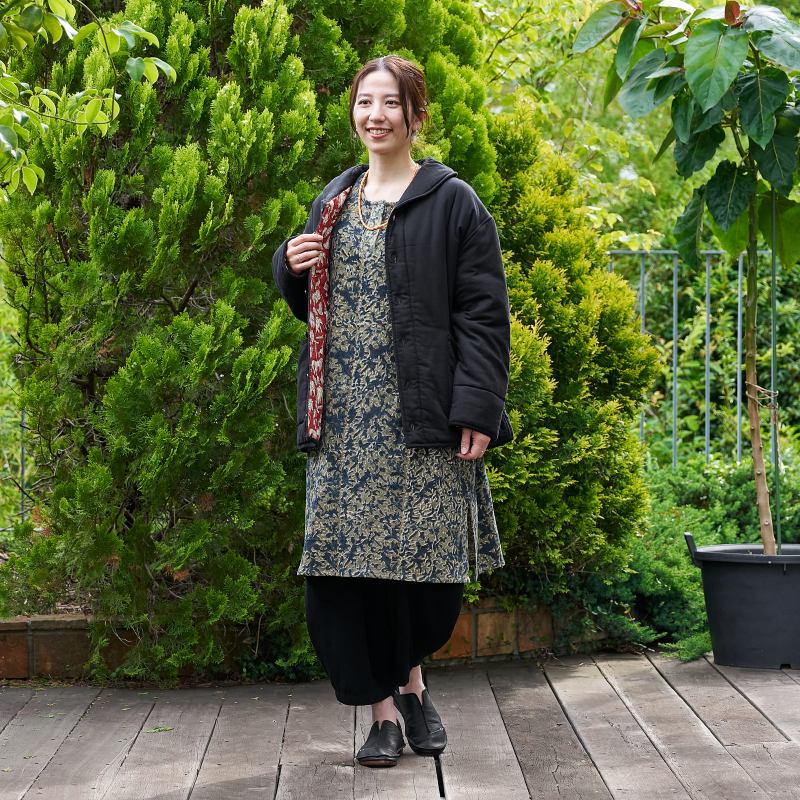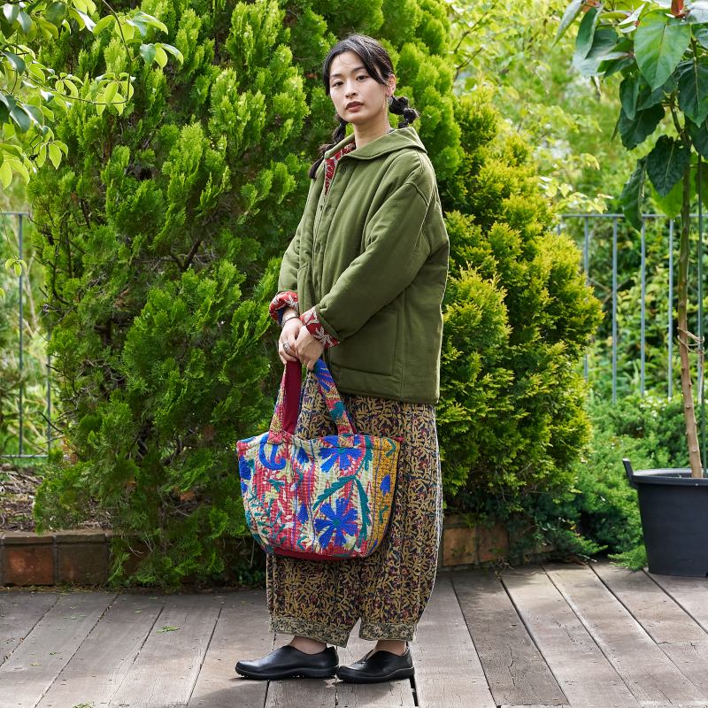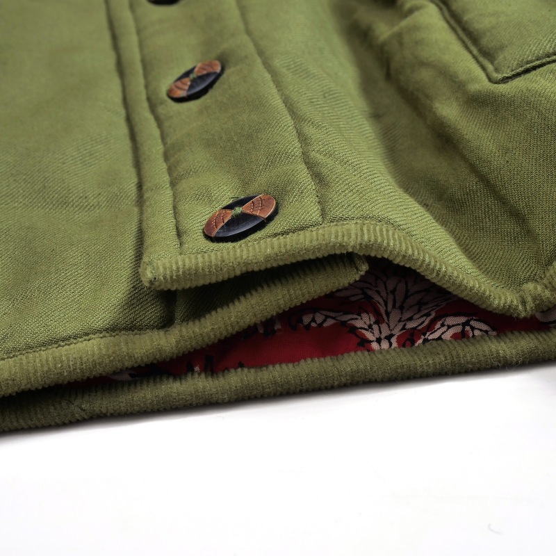 裏地に使用した動物モチーフのブロックプリントの生地を使用したジャケット。中綿入りで暖かく冬のアウターとして活躍するアイテム。大きなホーンボタンとパッチポケットが付いたデザイン。裏地のブロックプリントの柄は1点1点異なるもの魅力。エスニックコーデに合わせやすい落ち着いた色合いのグリーンとネイビーの2色展開です。