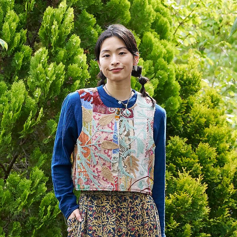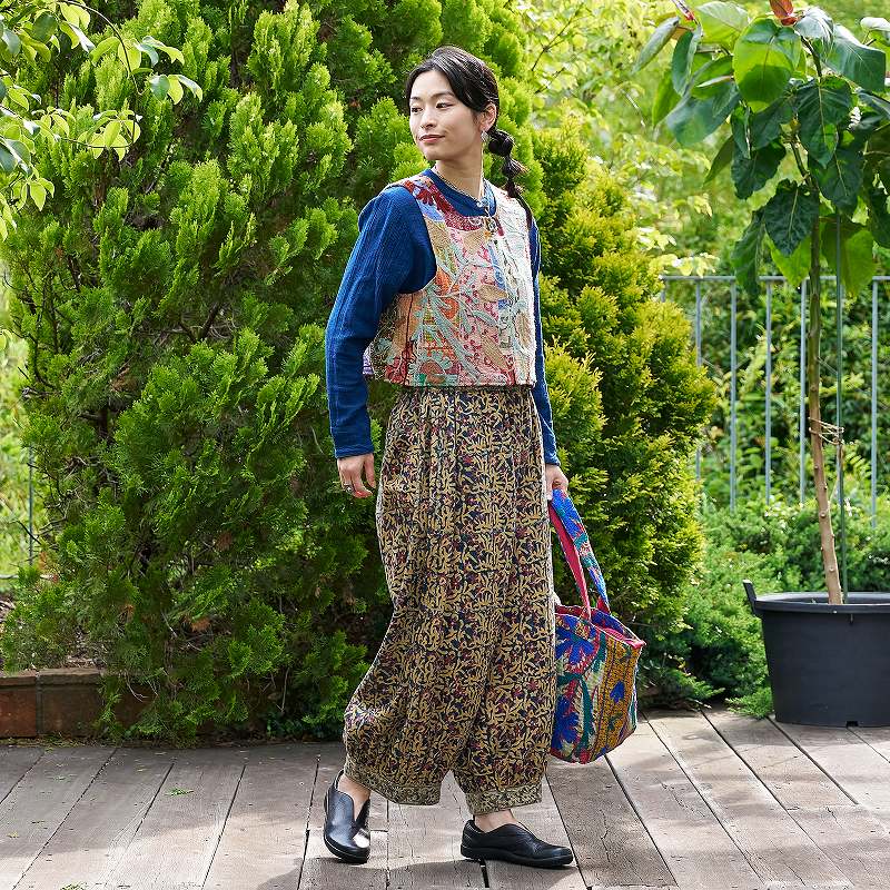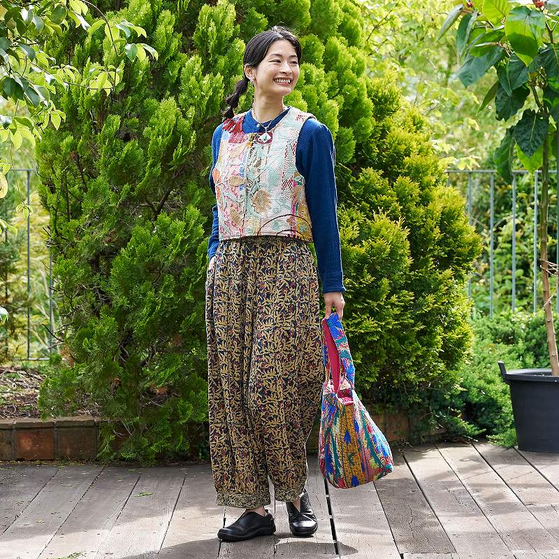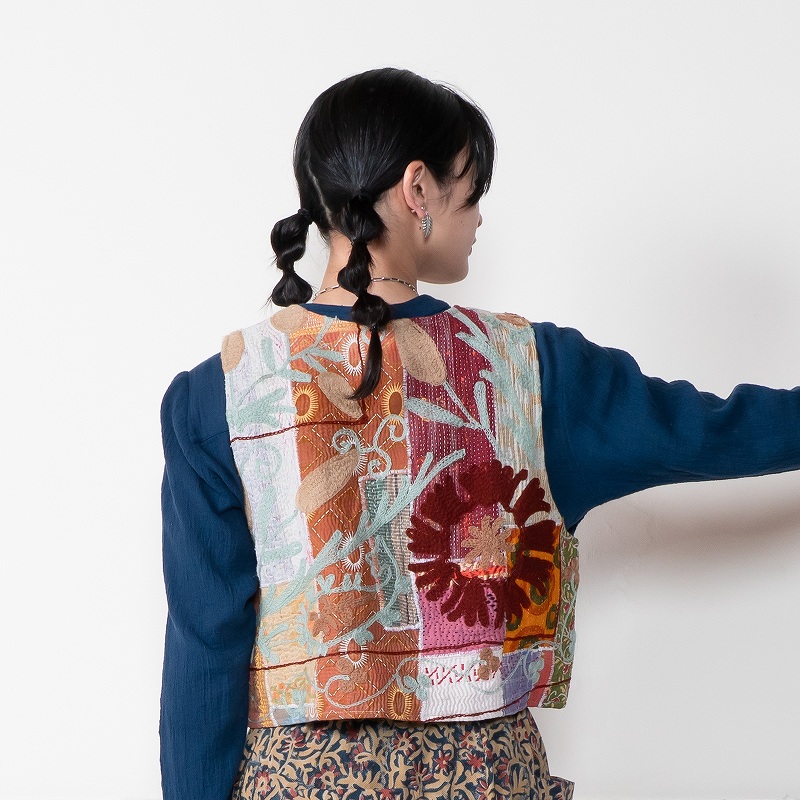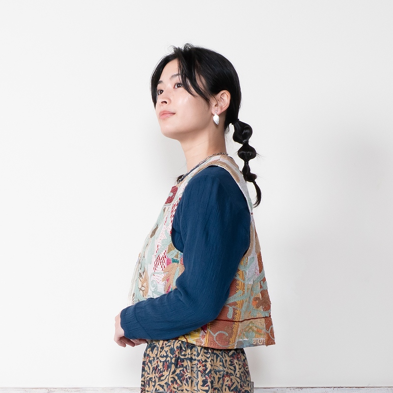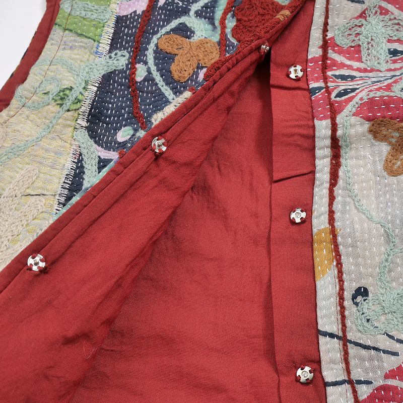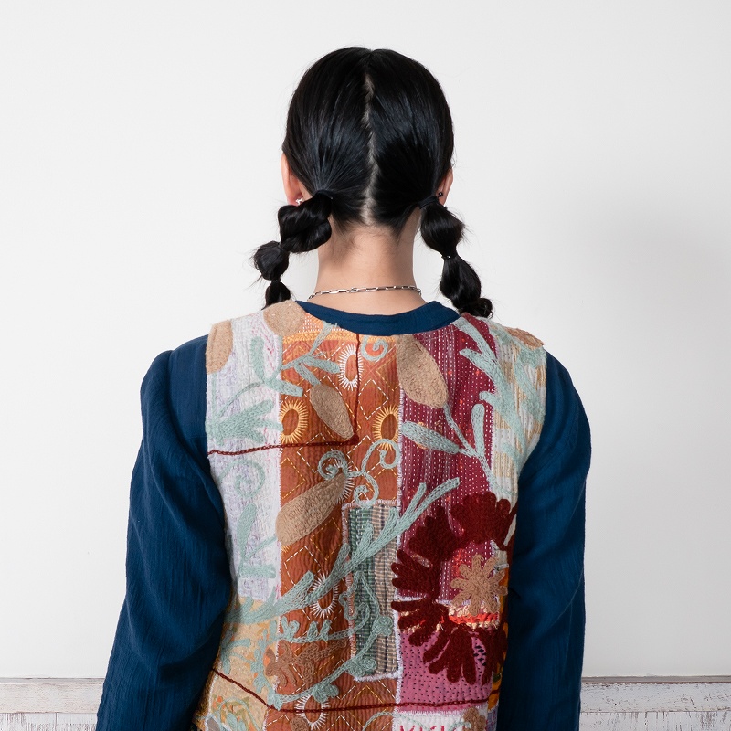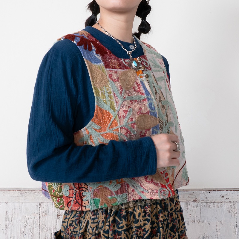 刺し子にアリ刺繍を組み合わせたタイプのベスト。様々な生地をパッチワークした生地を使用したアイテム。肉厚の生地を使用し、風を通しにくく、袖ぐりが広いのでボリューム袖のアイテムも合わせやすいデザイン。内側にスナップボタンが付いているので、着脱しやすい仕様になってます。シンプルな着こなしに合わせるだけで個性をプラスしてくれます。