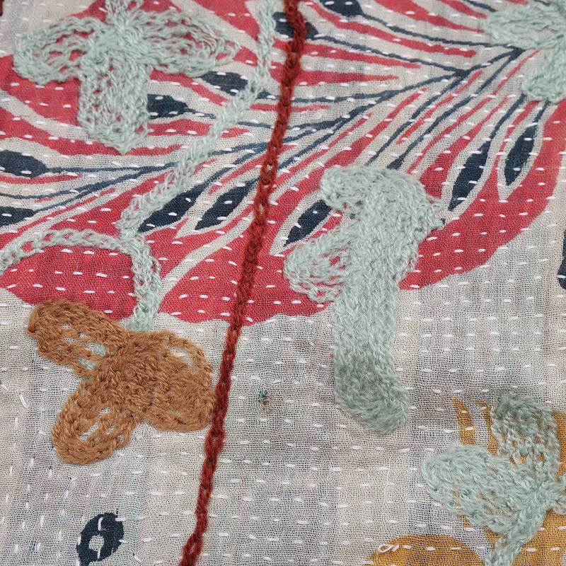 カンタには「刺す」という意味があり、着古したサリーや腰布(サロン)など、穴が開いたり薄く弱くなった布を二枚に重ね、ランニングステッチや様々な文様の刺繍を施します。刺繍で補強することにより、布を丈夫にし再利用していたのが起源で、ラリー(結ぶ)ステッチとも呼ばれています。