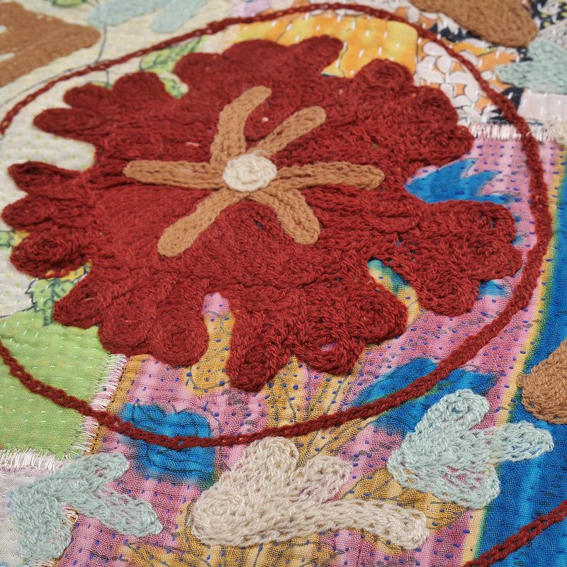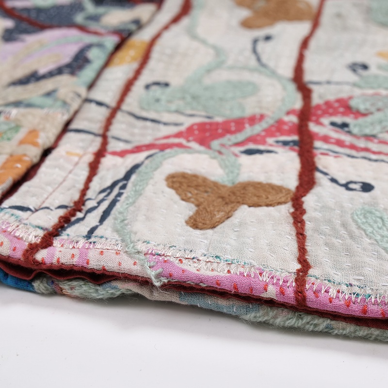 カンタ刺繍は女性たちの手仕事の一つで、家具や壁に掛けたり、ベッドカバーにもなる大きなものからショールタイプの小ぶりのものなどサイズも様々で、繊維製品が豊富な国ならではの布柄の多種多様な組み合わせも魅力です。