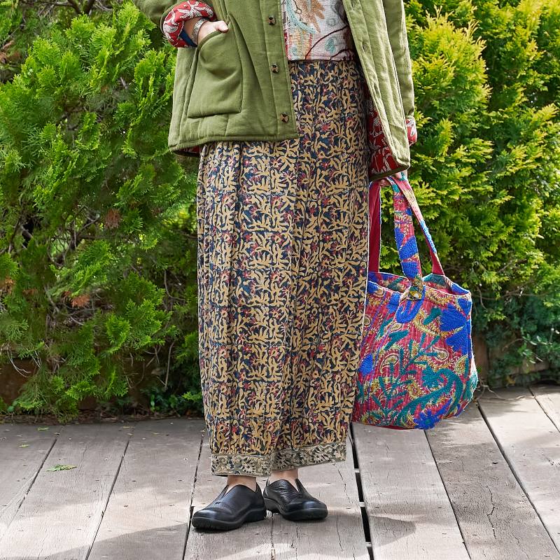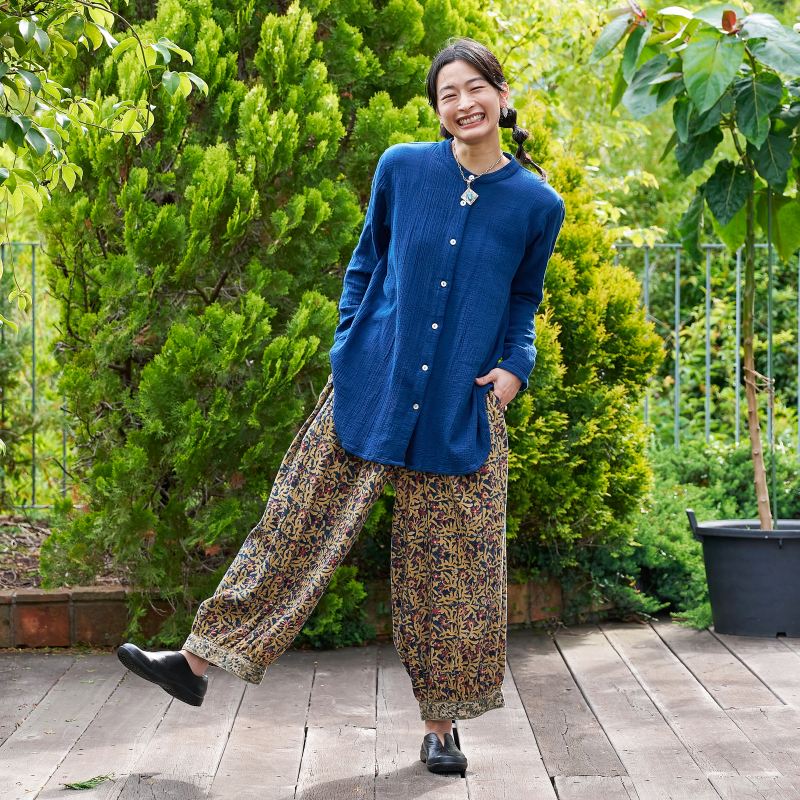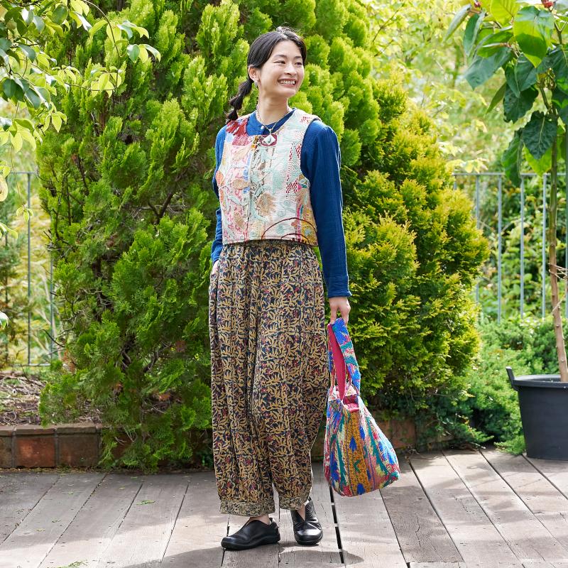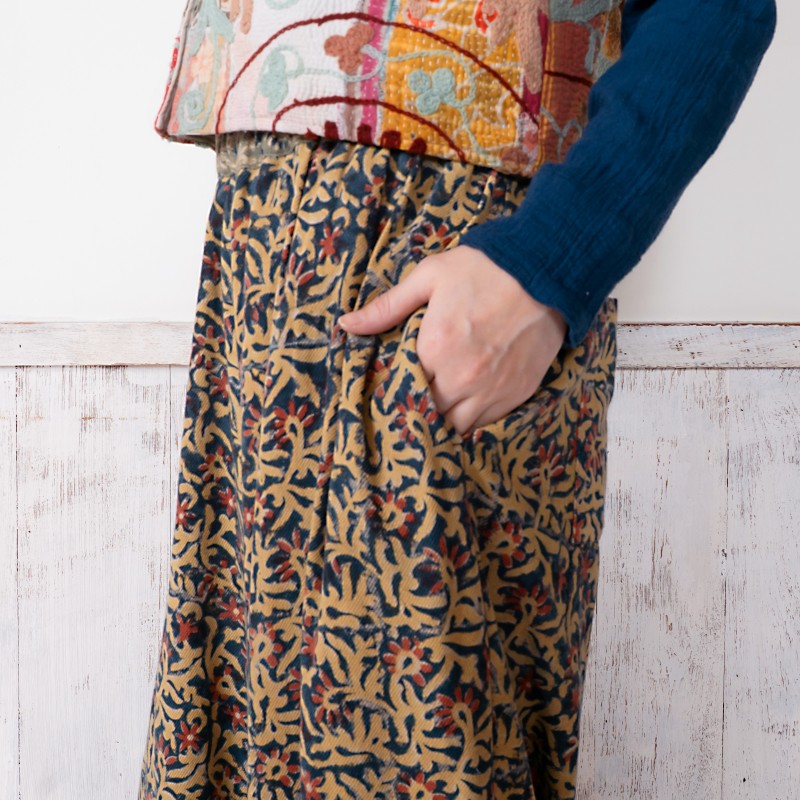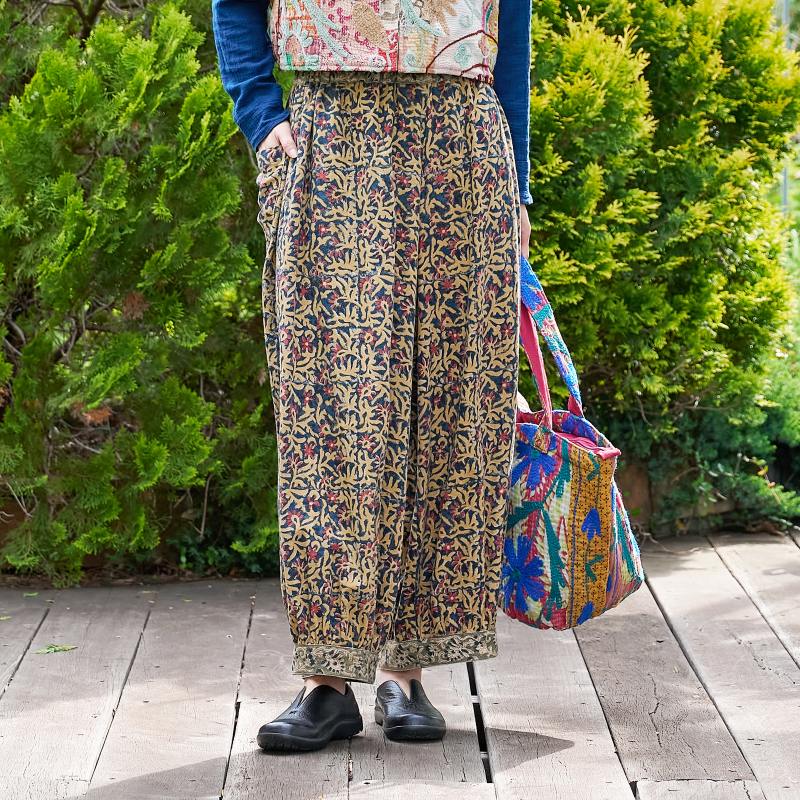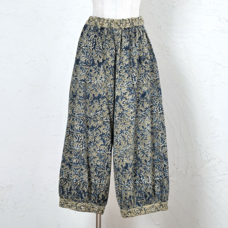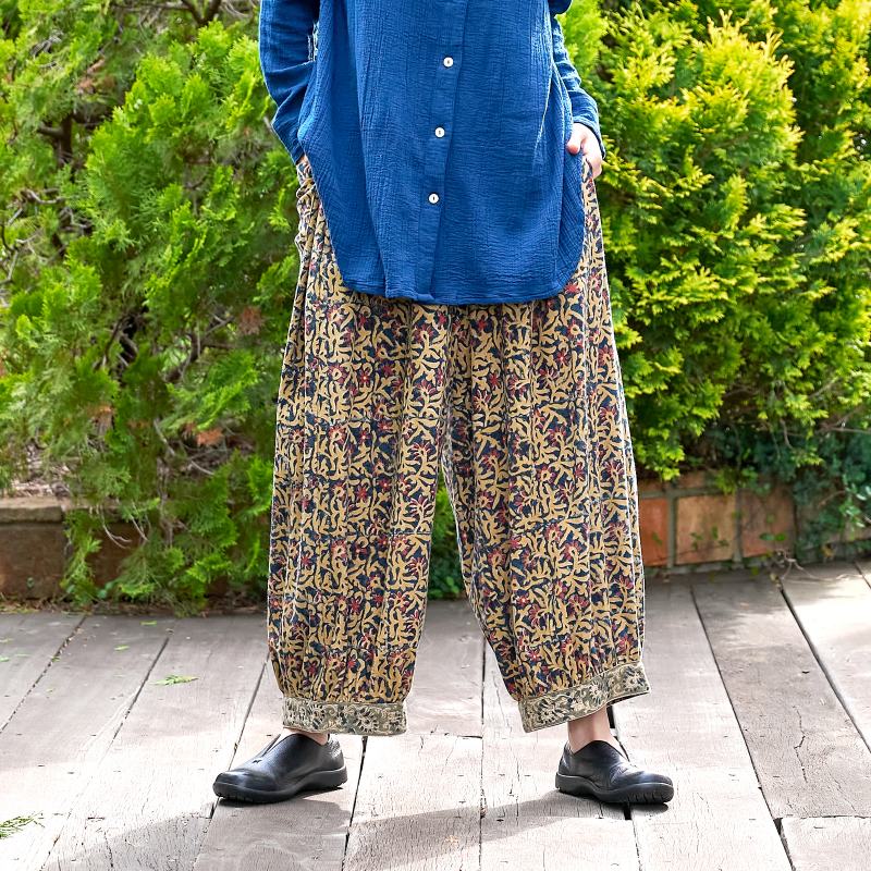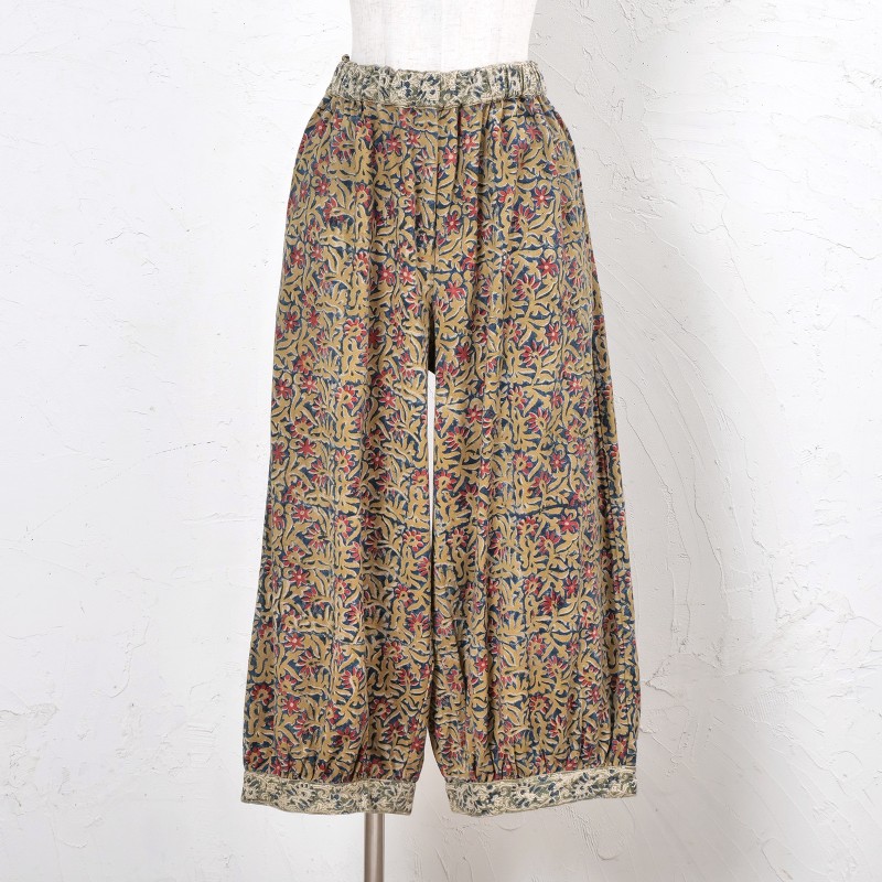 起毛した中肉生地にインド伝統のカラムカリプリントを施したパンツ。天然染料を使用した素朴で優しい色合いが魅力。起毛したコットン生地を使い、ぬくもりのある風合いに仕上げ、これからのシーズンにぴったりのアイテム。裾にギャザーを入れた丸みのあるシルエットで、ゆったりした着心地。シンプルな無地のトップスなどと合わせた着こなしがおすすめ。