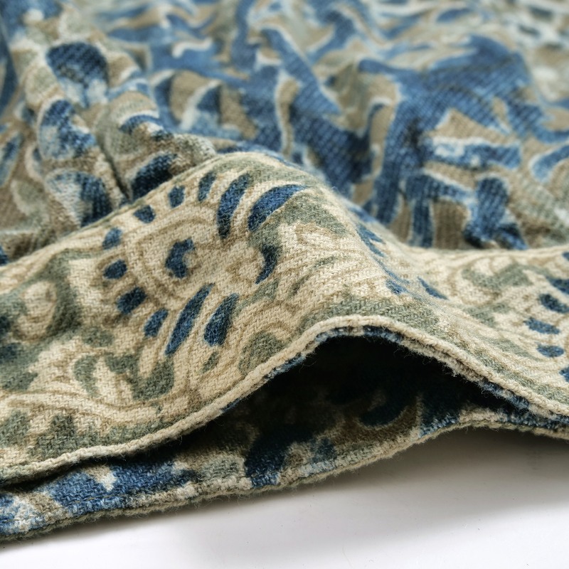 カラムカリとはカラムがペン、カリが仕事の意味で、竹の棒に巻きつけペンのように色を指していくインド伝統の技法です。手描きから徐々に木版を使うようになり、その後花唐草そのものをカラムカリとも呼ぶようになりました。プリントは天然染料を使った草木染めで、柄の一つひとつを木版のブロックで手押しして描き出していきます。色付けには木炭、ミョウバン、草花、インディゴ、茜、ウコンなどが使用されており、使うごとに色が馴染んでいき、素朴な色合いが表現されています。自然の力と昔ながらの手仕事でしか出すことができない落ち着いた色味がこのカラムカリの特徴です。