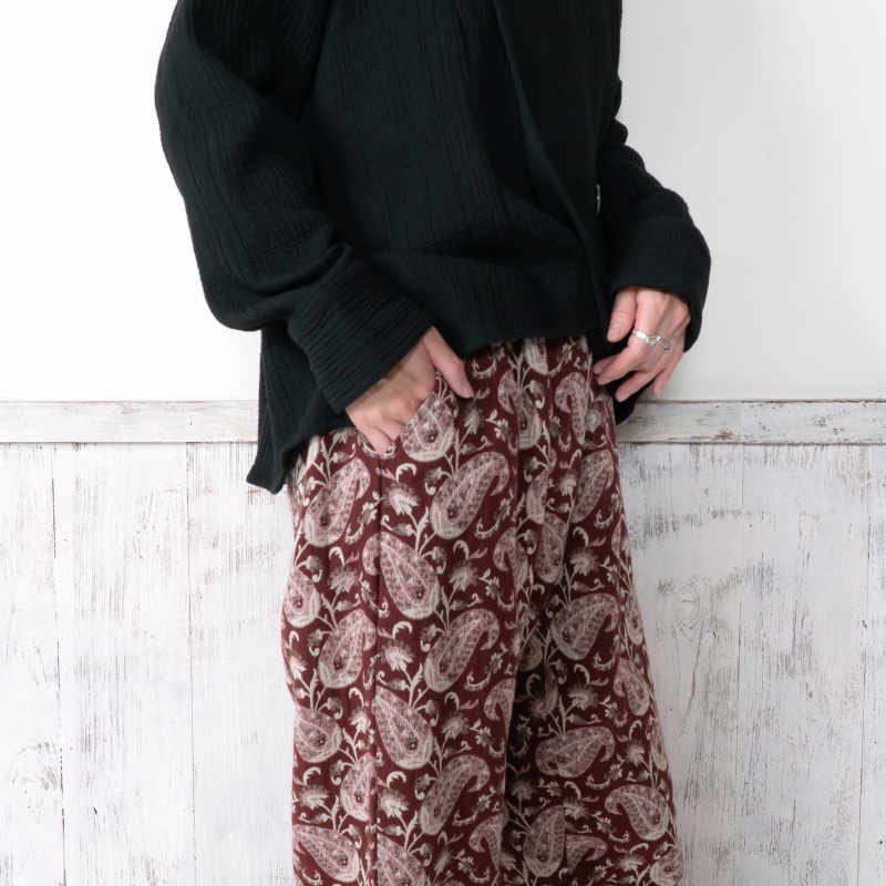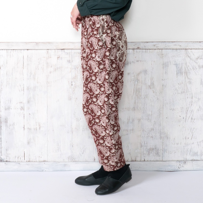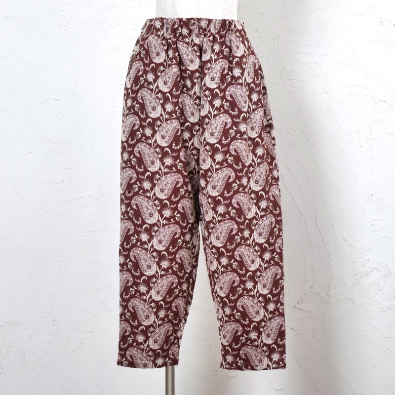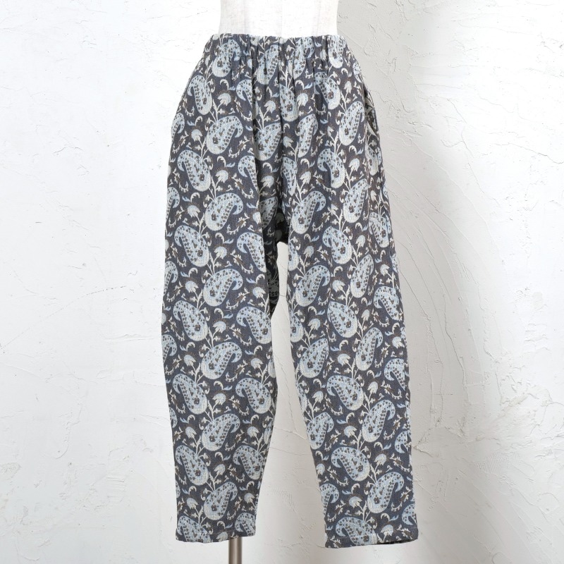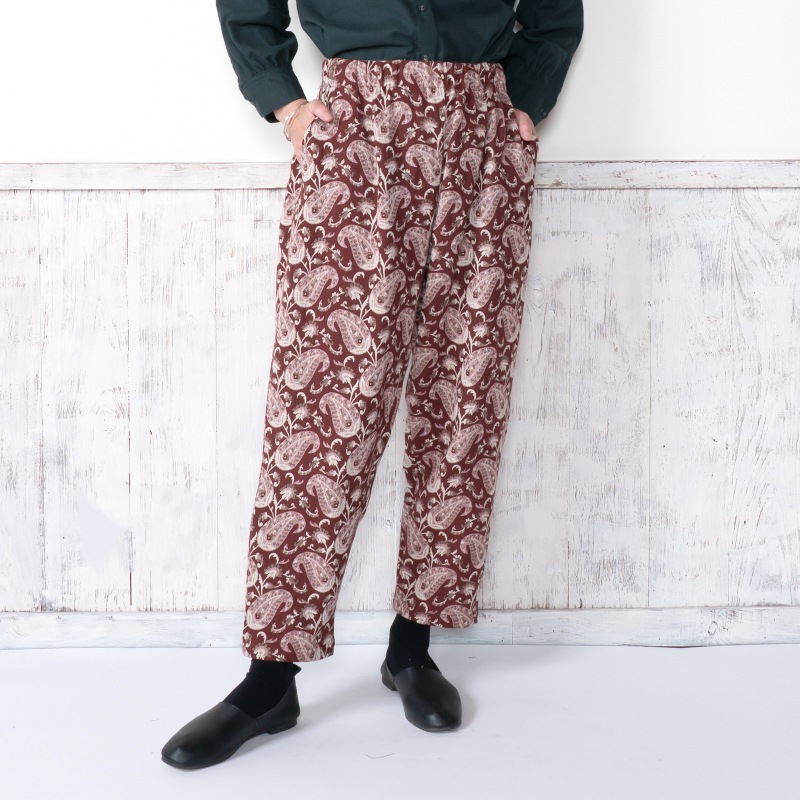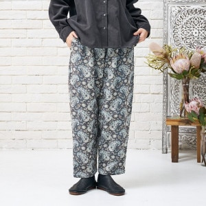 華やかな模様が目をひくペイズリー柄のパンツ。空気を含んだようなソフトな手触りが心地よく、日常使いにぴったりの一着。ゆったりとしたシルエットで着心地良いアイテム。柄物のボトムスは、落ち着いたカラーのトップスを合わせることで派手さを程よく抑えることができ、さりげない個性を感じさせる着こなしが楽しめます。